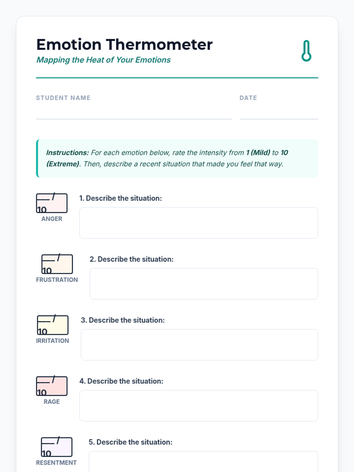 Identify and label emotions using an Emotion Thermometer to build foundational emotional self-awareness.