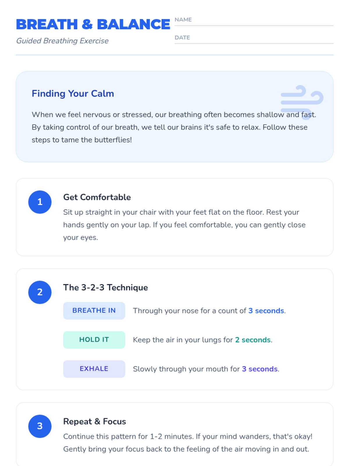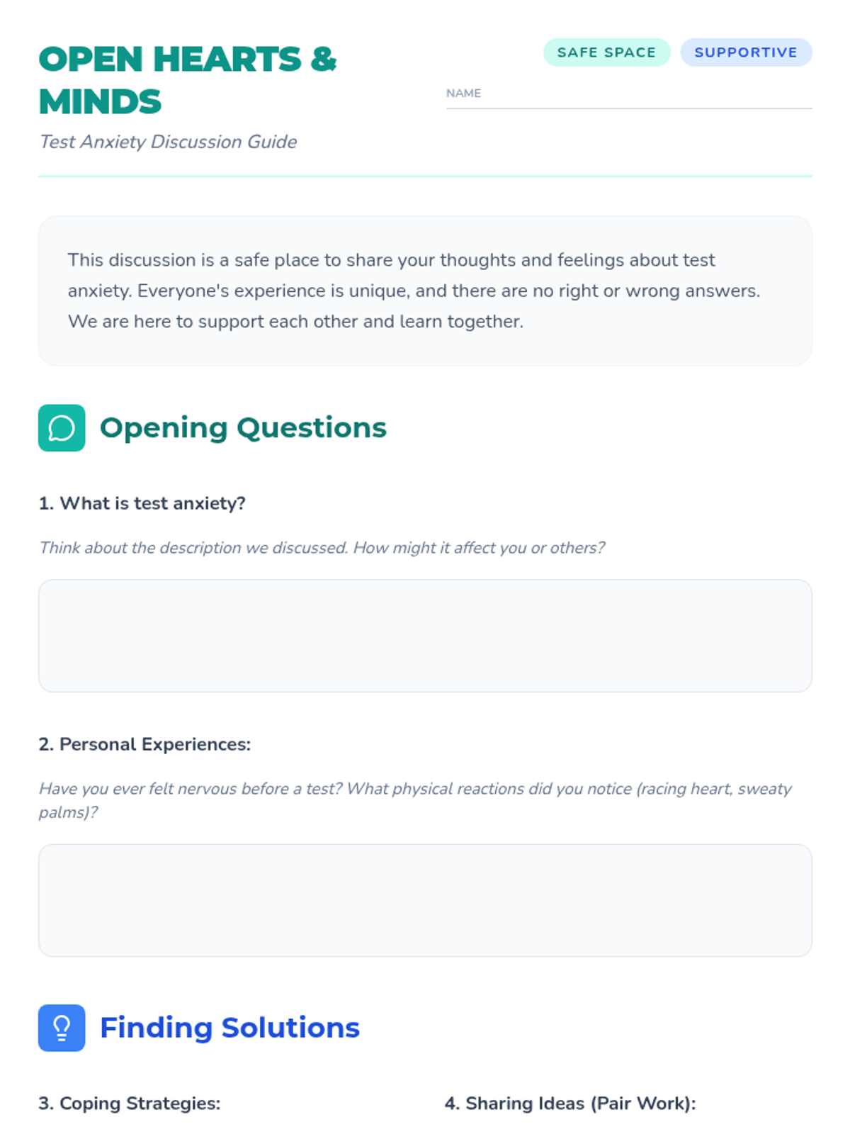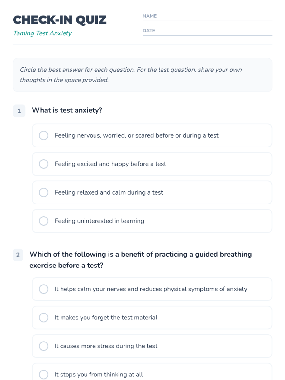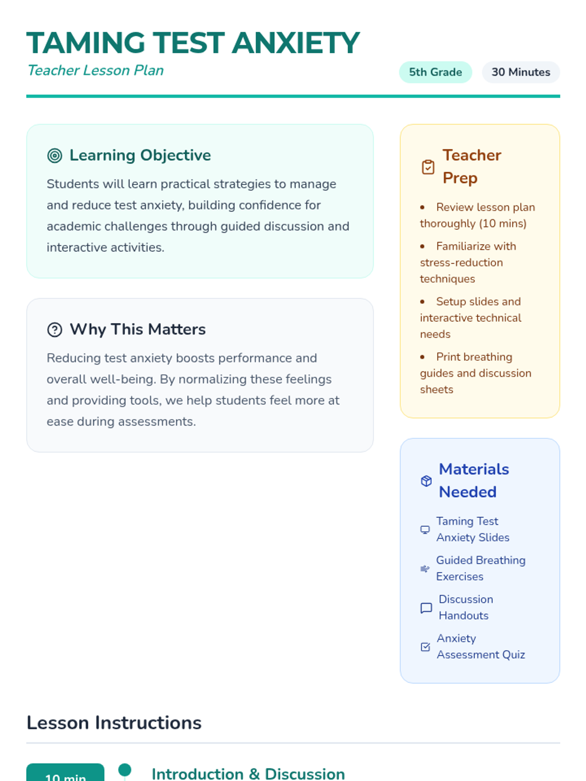A 30-minute lesson for 5th graders to understand and manage test anxiety through breathing exercises, discussion, and positive self-talk.
