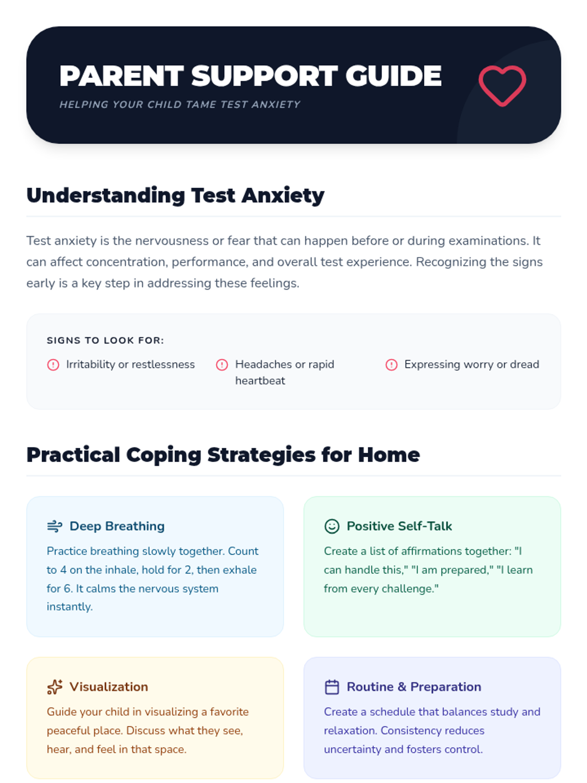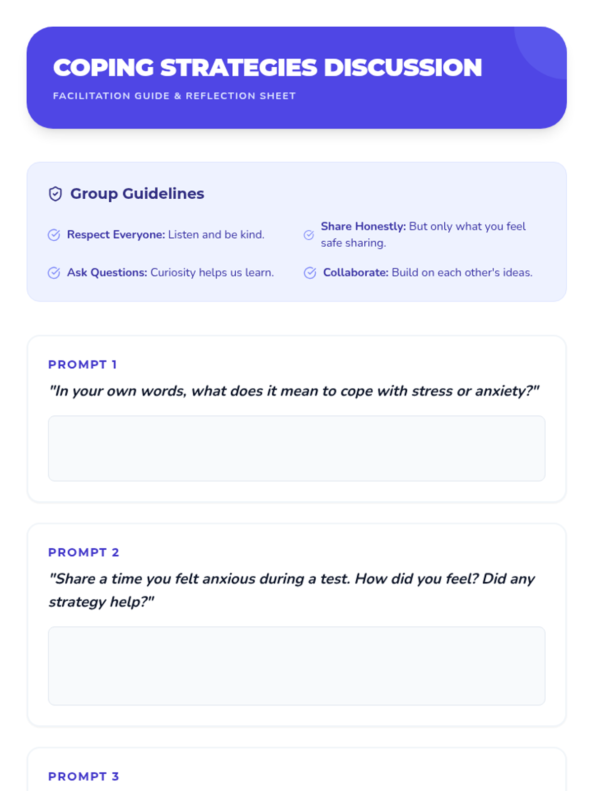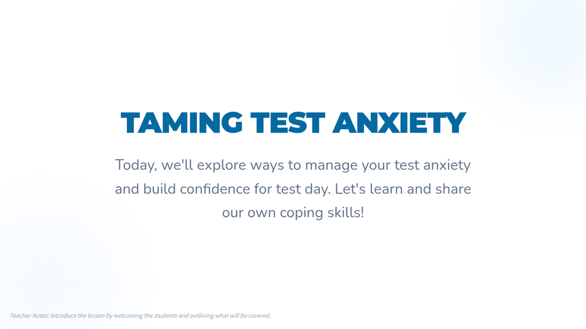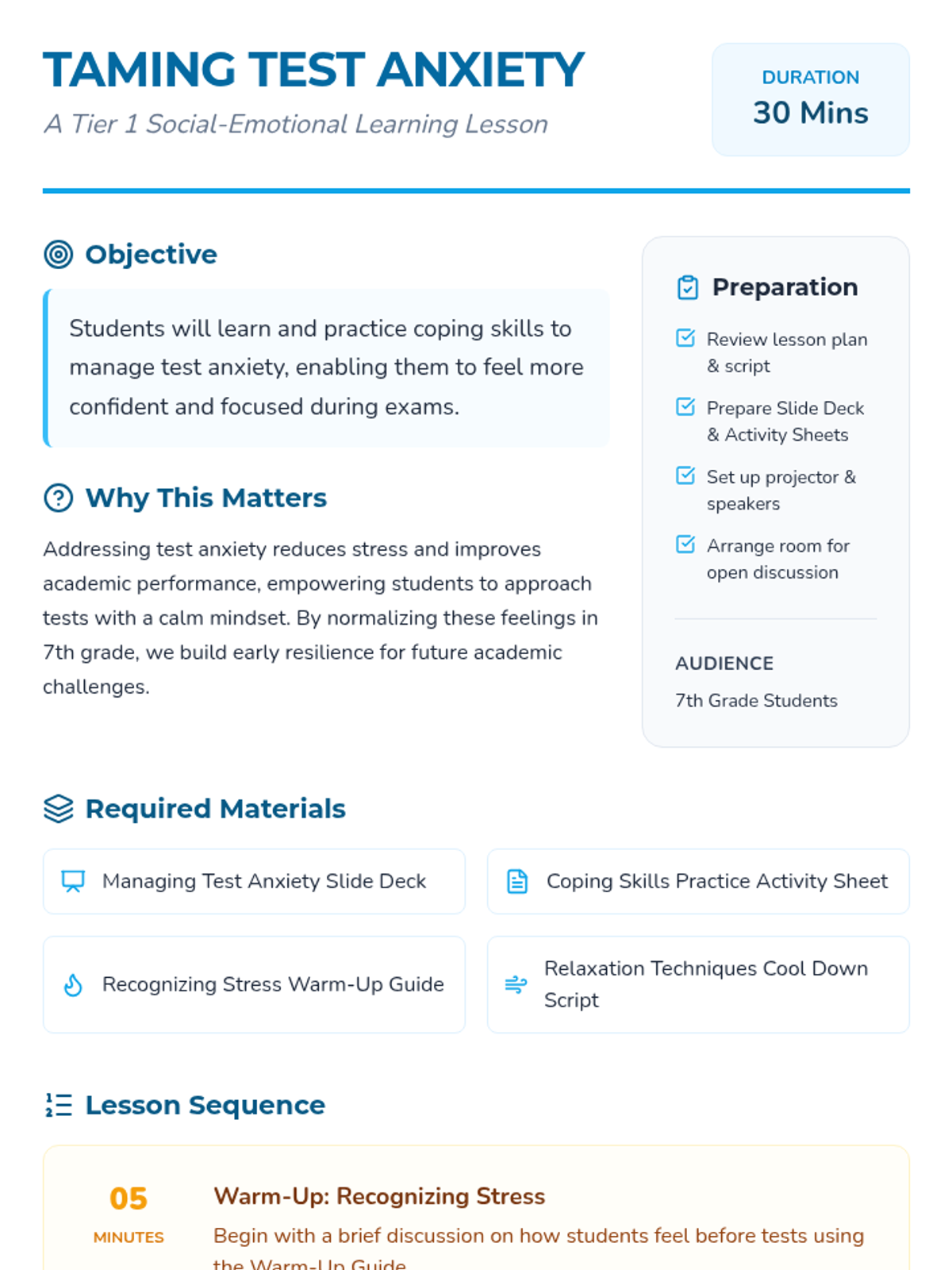 A 30-minute session for 7th graders to identify signs of test anxiety and practice effective coping strategies like deep breathing and positive self-talk.