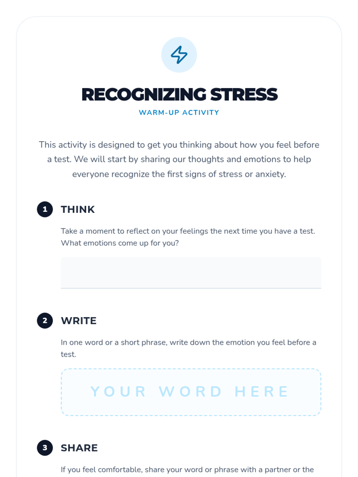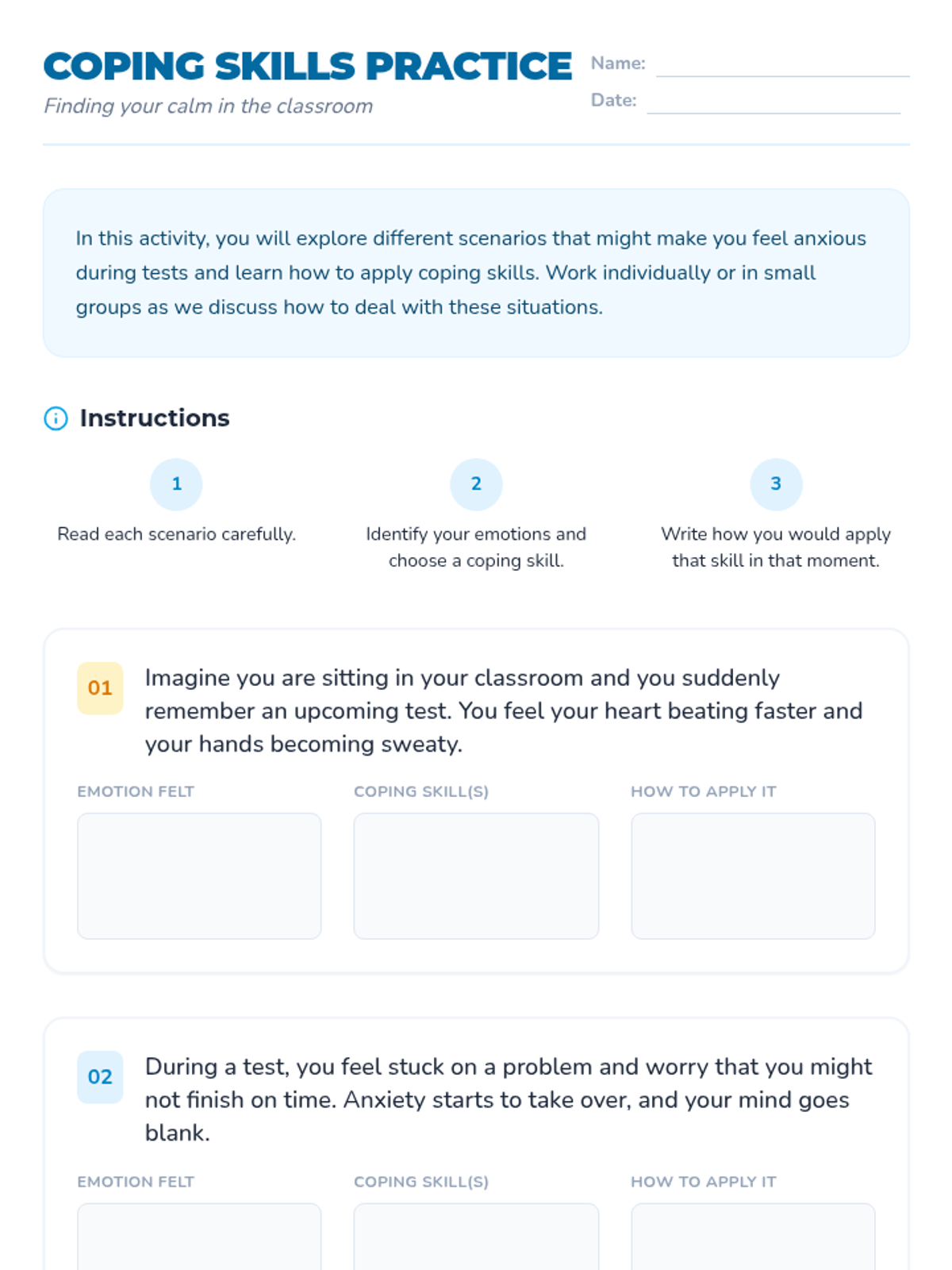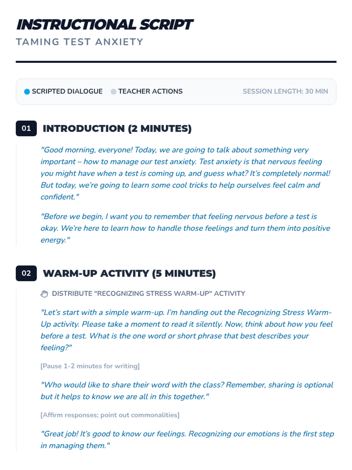 A 30-minute session for 7th graders to identify signs of test anxiety and practice effective coping strategies like deep breathing and positive self-talk.