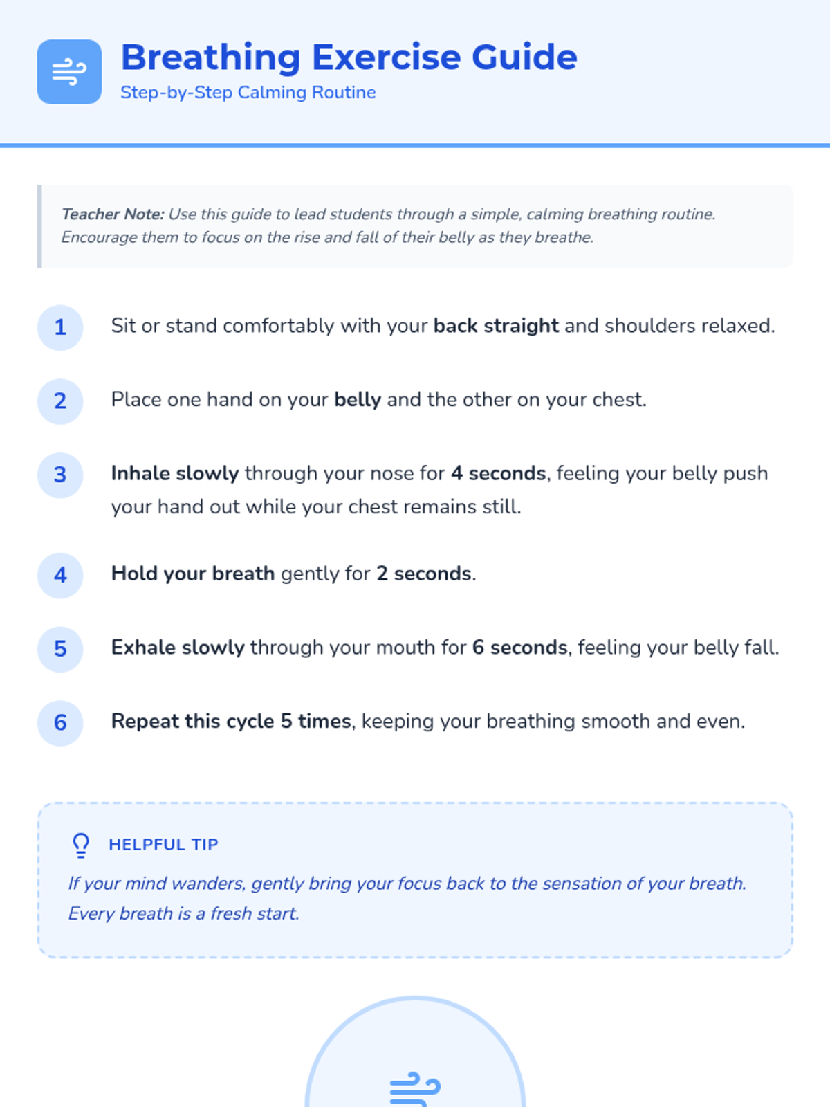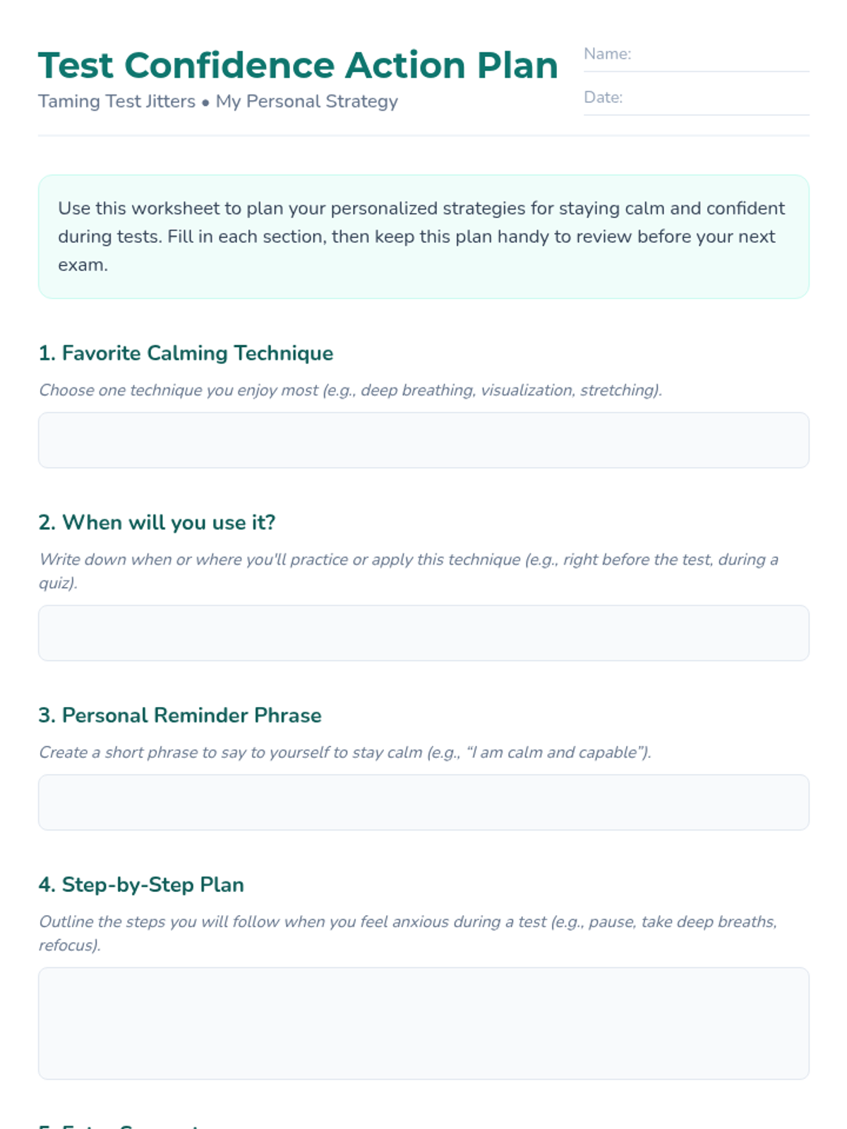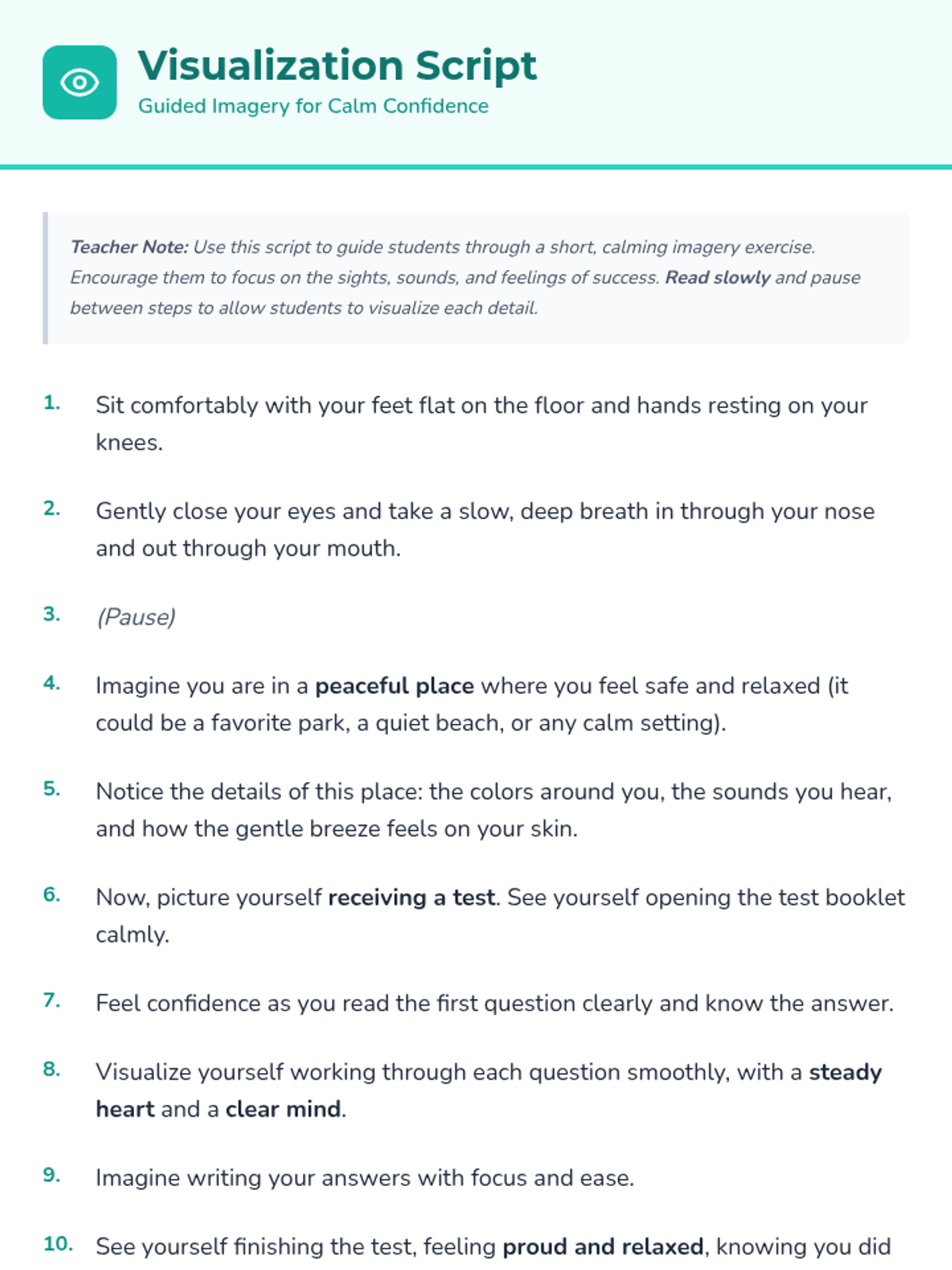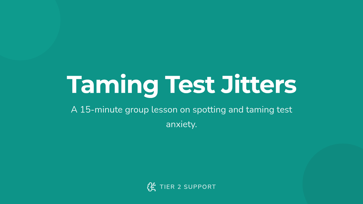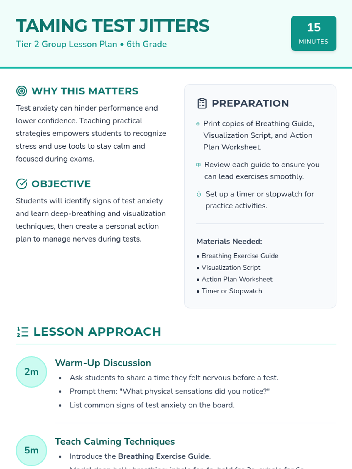 A 15-minute Tier 2 group lesson for 6th graders focused on identifying test anxiety and practicing calming strategies like deep breathing and visualization.