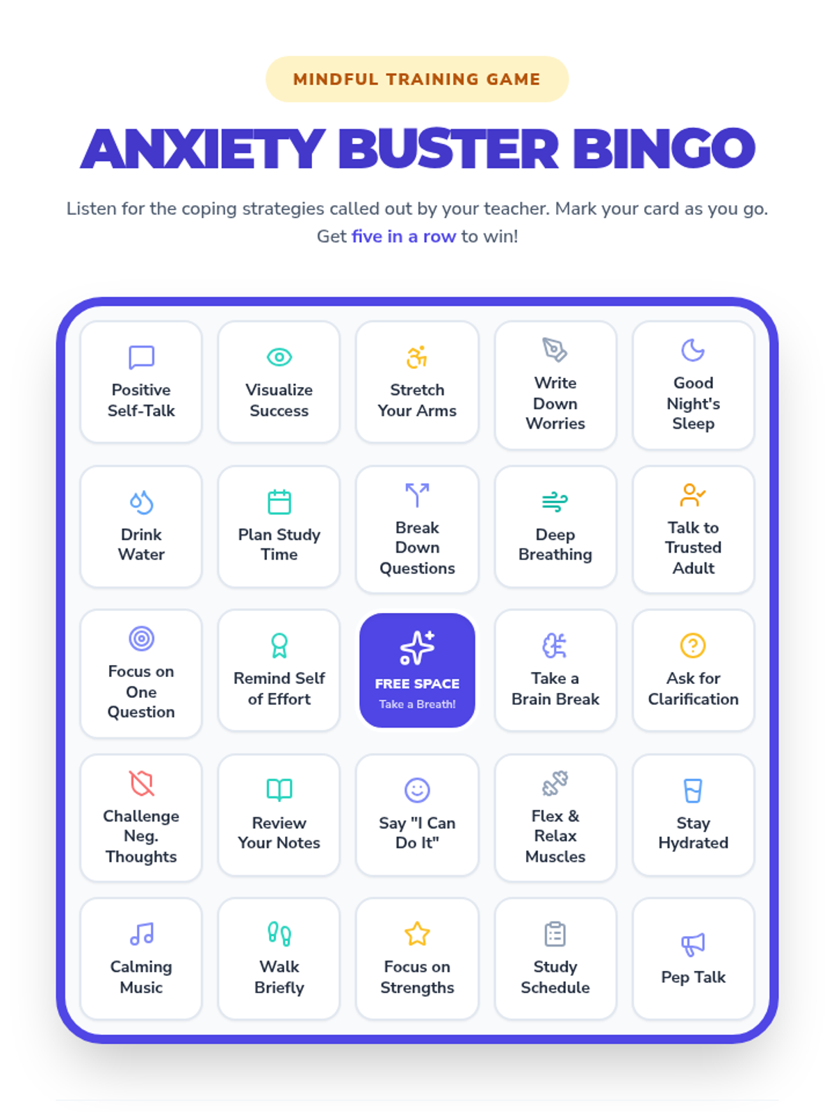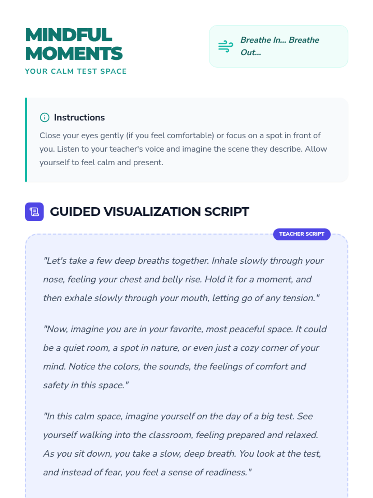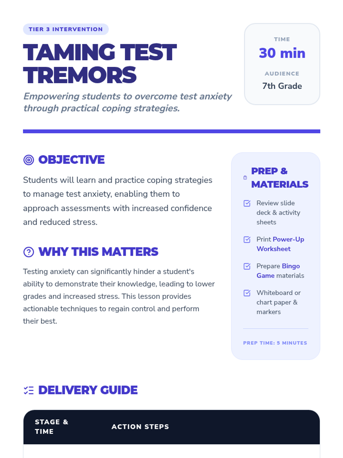 A 30-minute Tier 3 intervention for 7th graders to manage test anxiety through deep breathing, positive self-talk, and visualization.