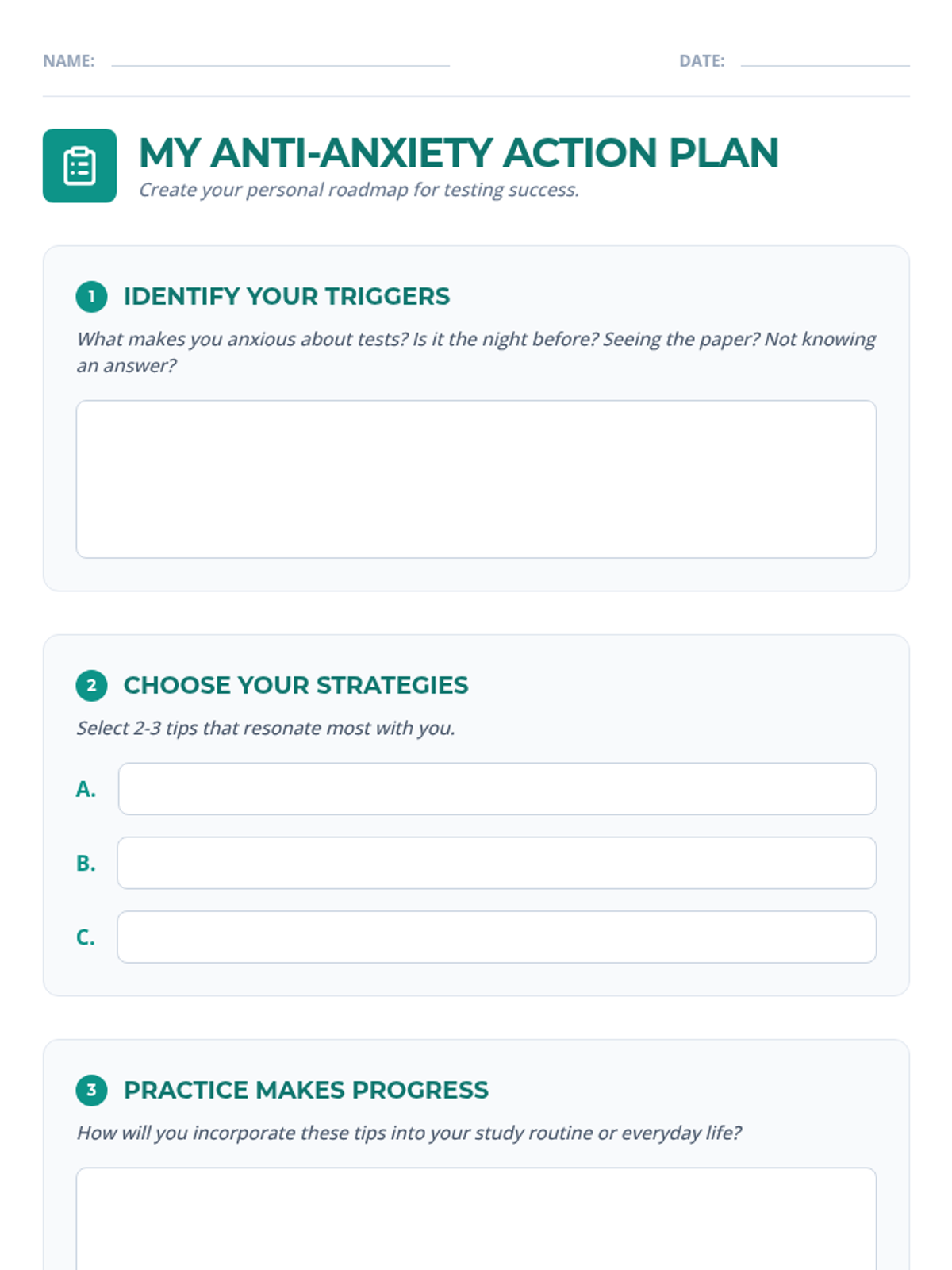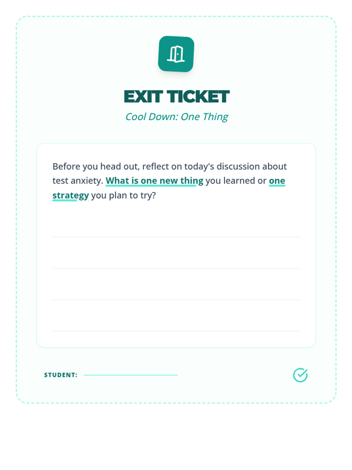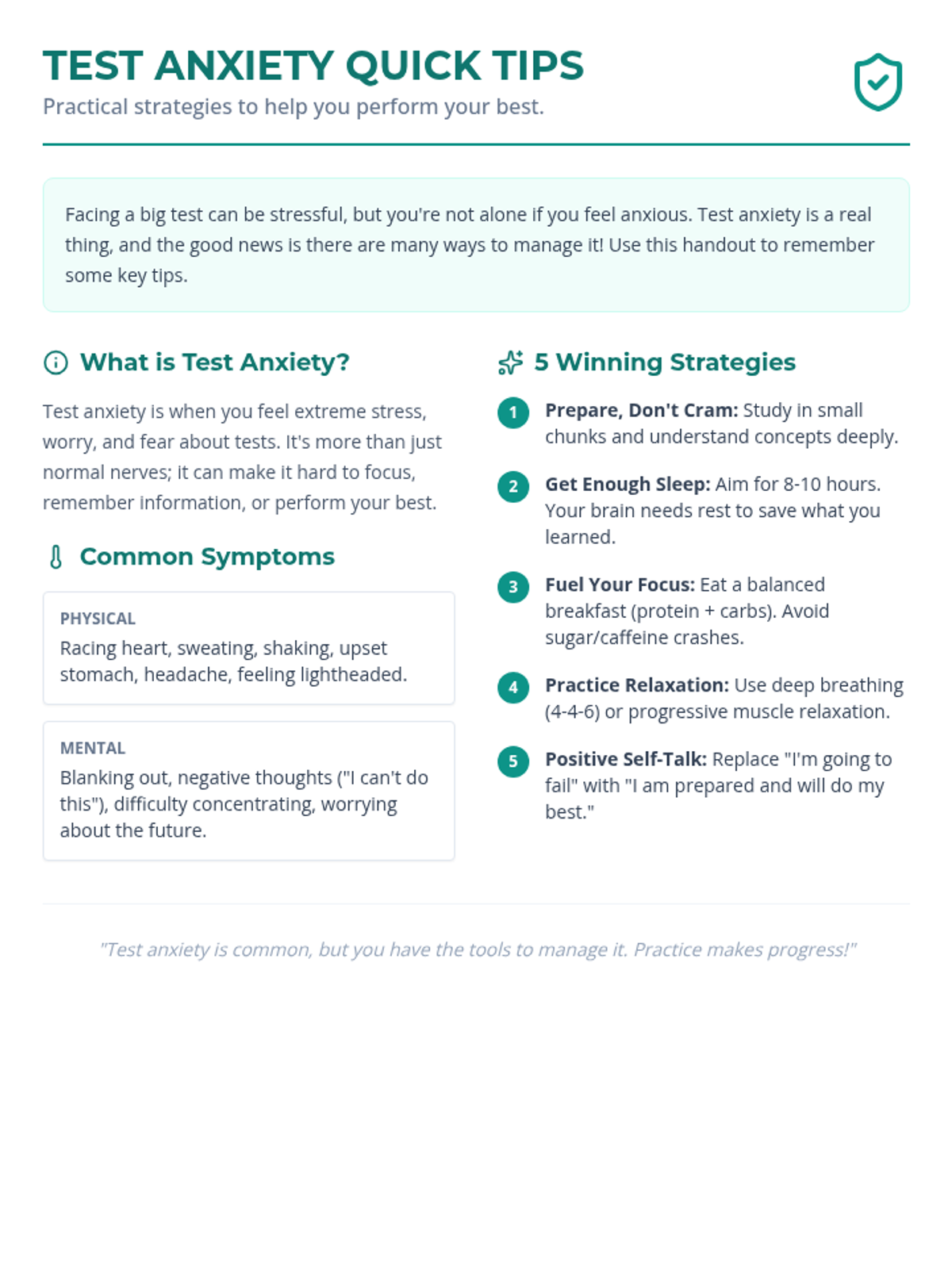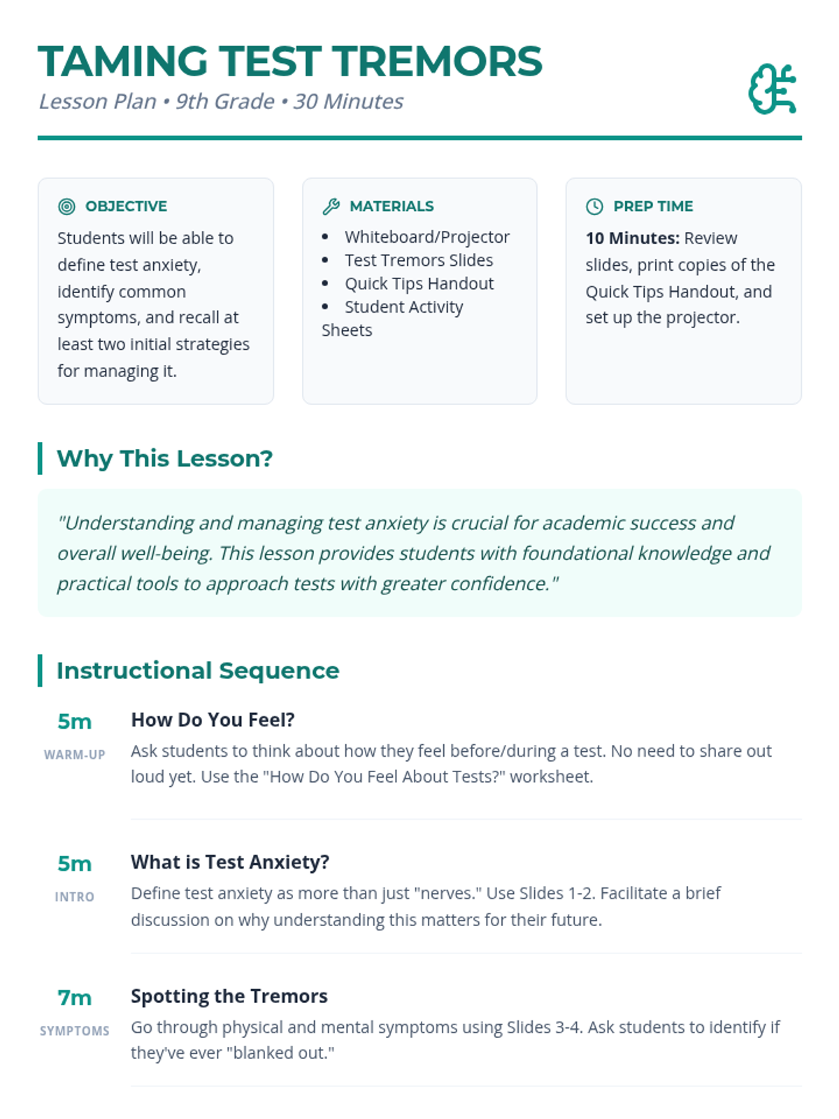 A 30-minute lesson for 9th-grade students designed to help them identify test anxiety symptoms and develop practical coping strategies. Students will create a personalized action plan to manage stress during high-stakes assessments.