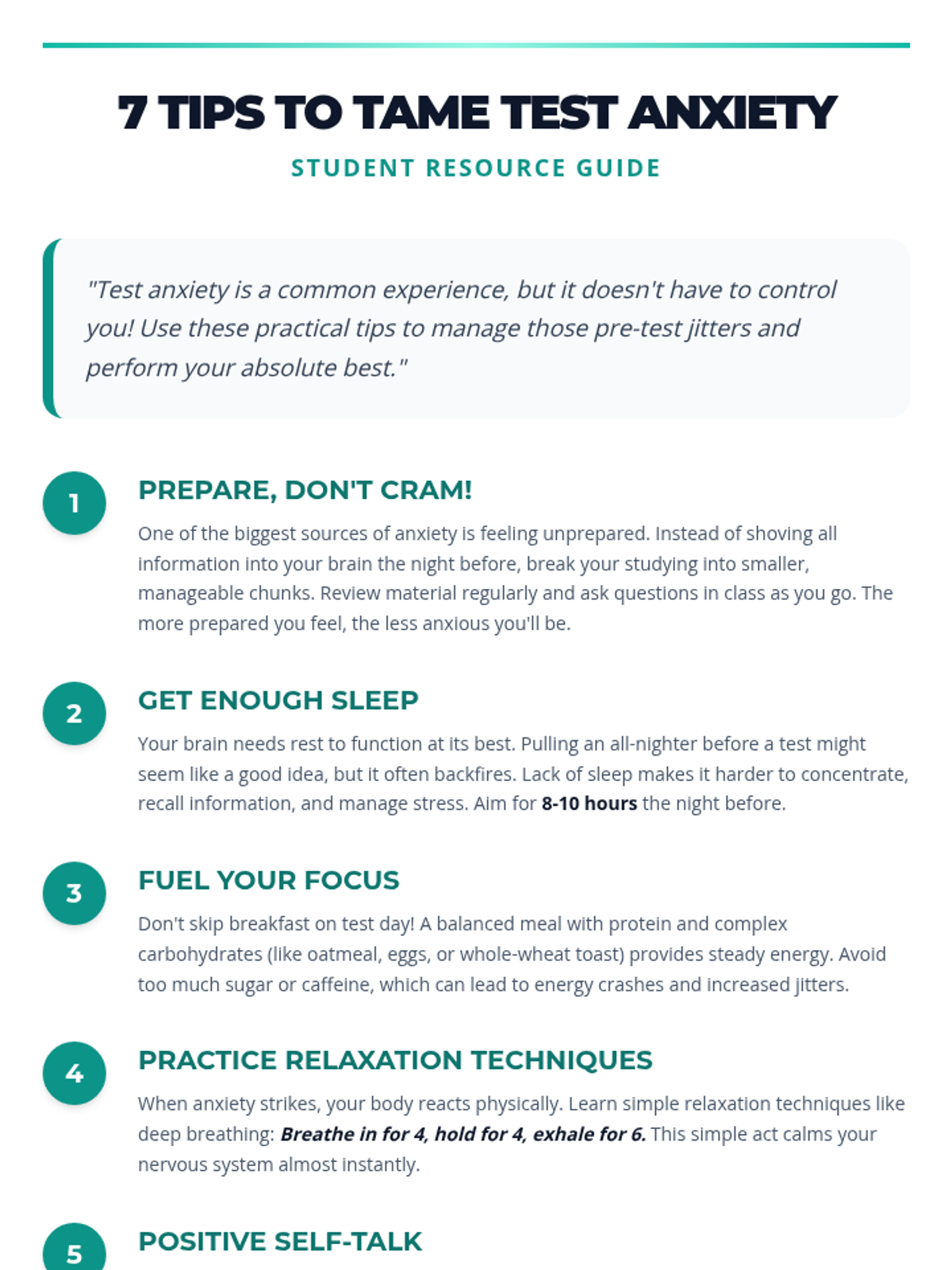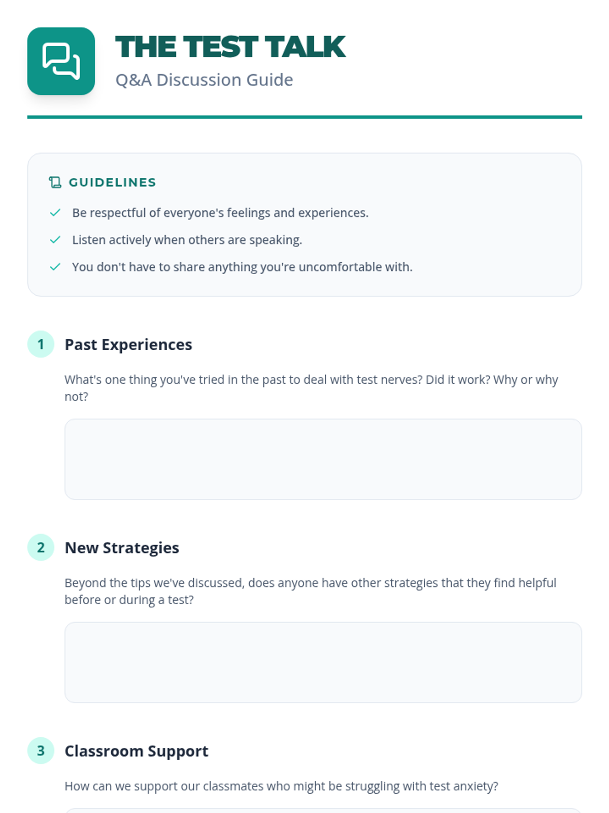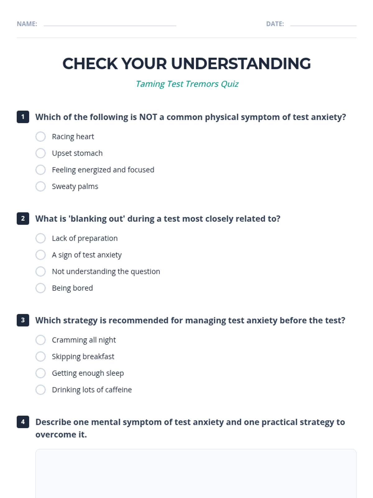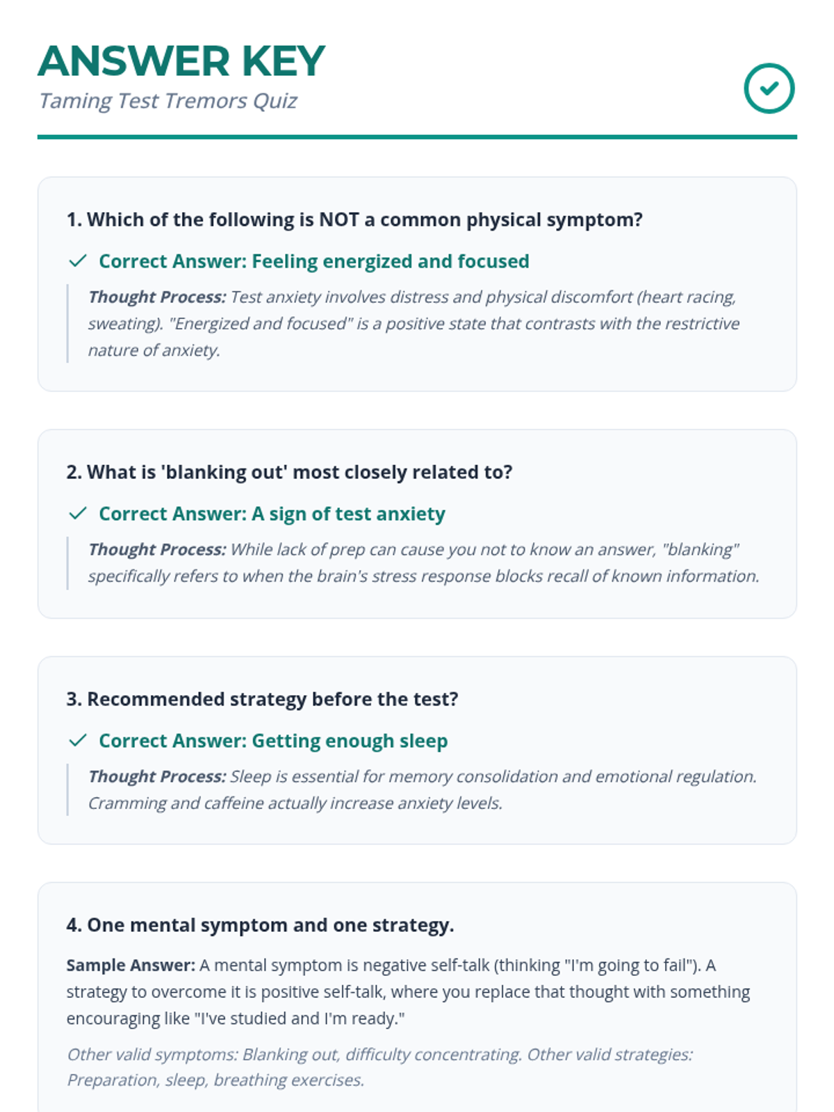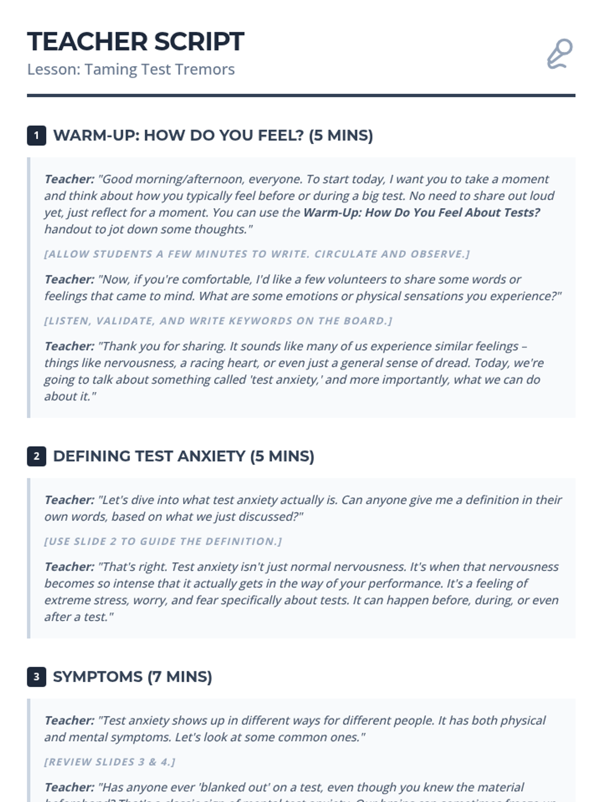 A 30-minute lesson for 9th-grade students designed to help them identify test anxiety symptoms and develop practical coping strategies. Students will create a personalized action plan to manage stress during high-stakes assessments.