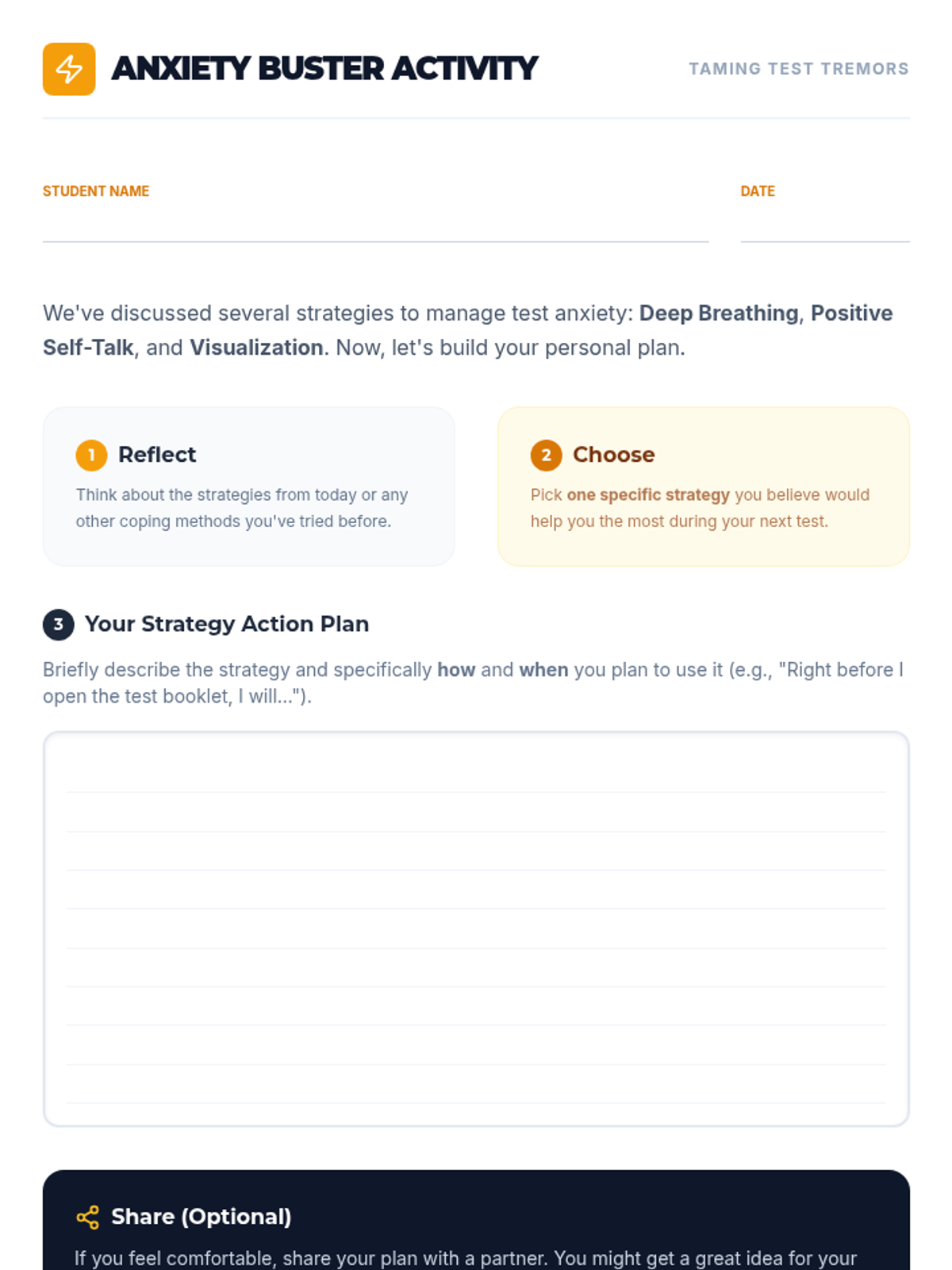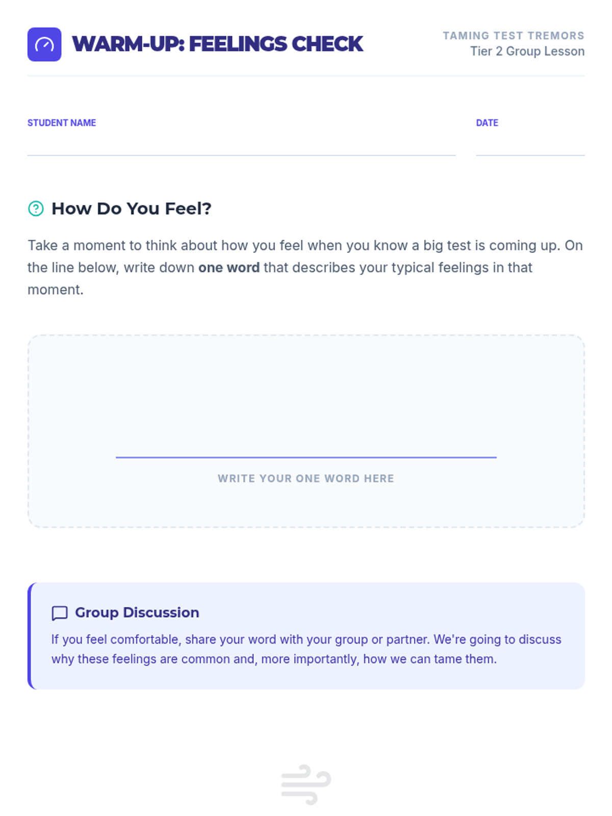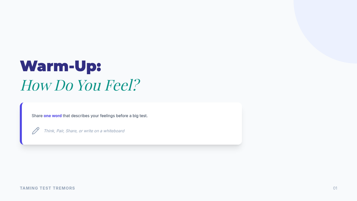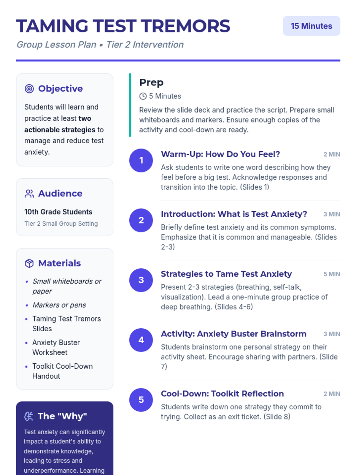 A 15-minute Tier 2 small group lesson for 10th-grade students focused on identifying symptoms of test anxiety and practicing actionable coping strategies like deep breathing and positive self-talk.