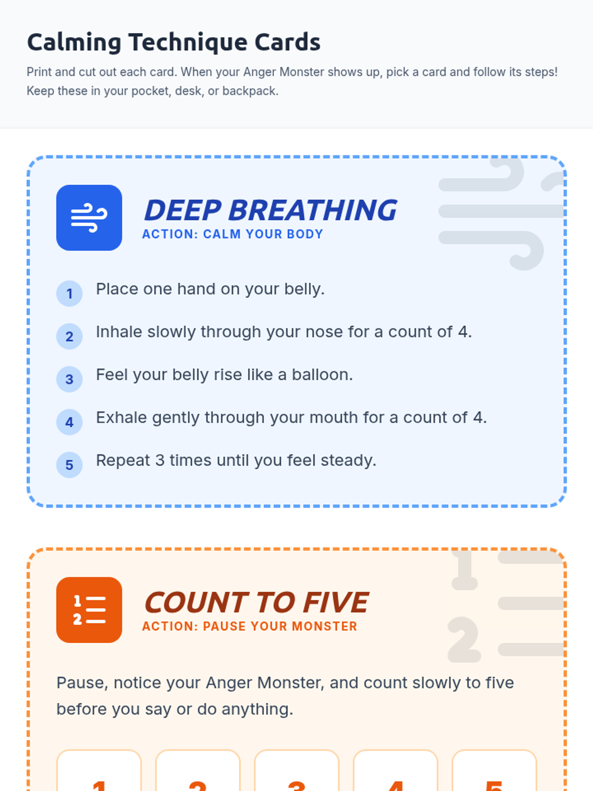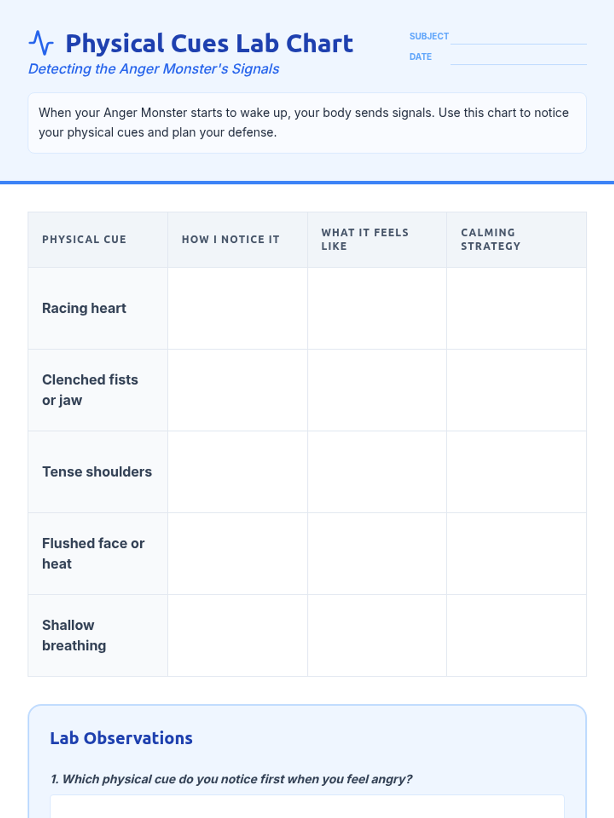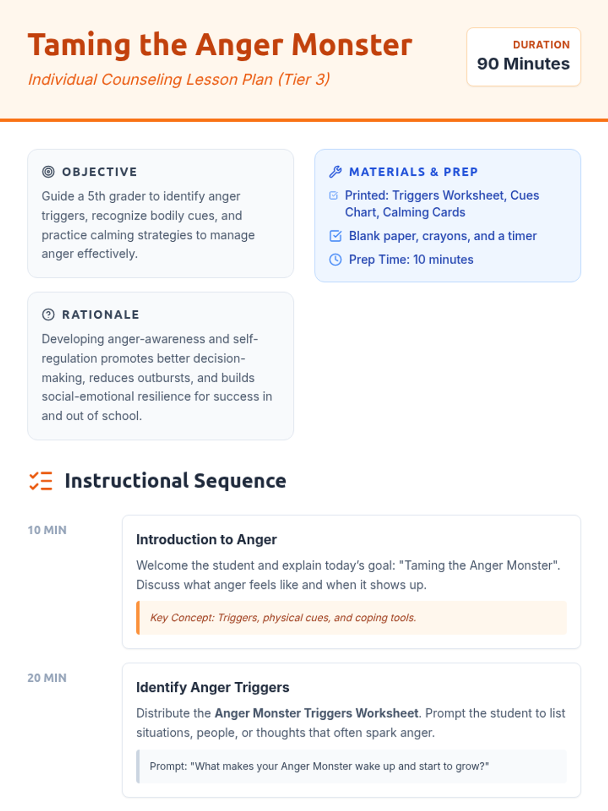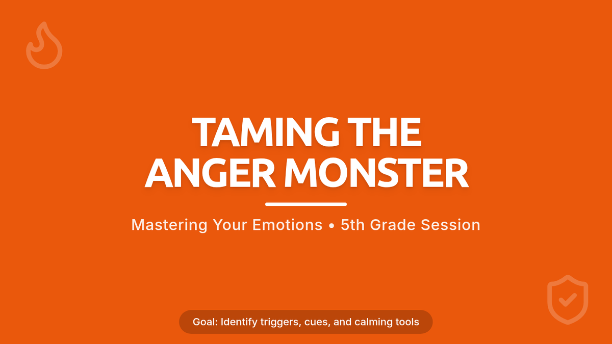 A 90-minute one-on-one session designed to help a 5th grader understand and manage anger effectively. This individualized lesson provides targeted strategies and tools to identify triggers, recognize physical cues, and apply calming techniques, empowering the student to regulate emotions and improve self-control.