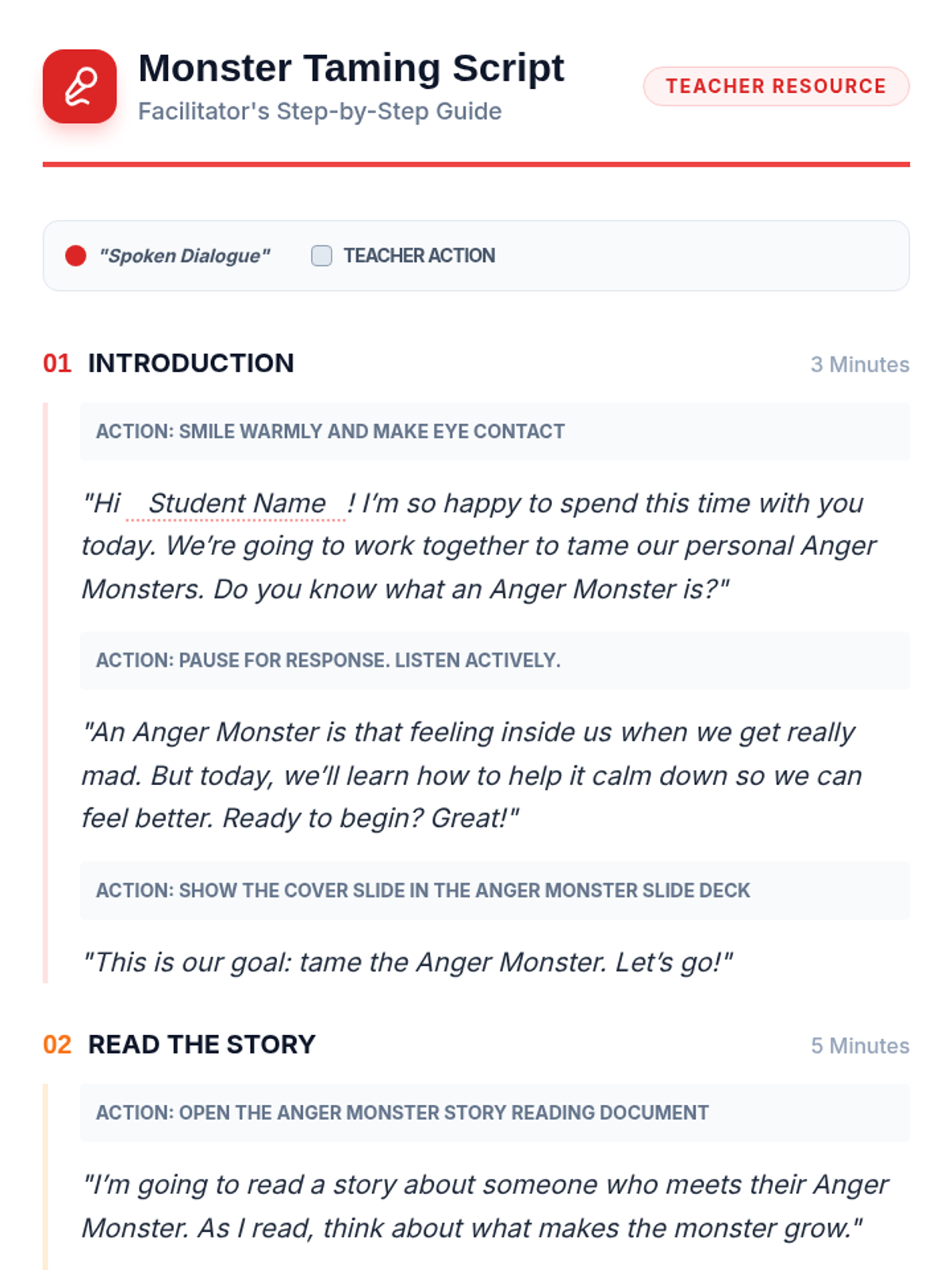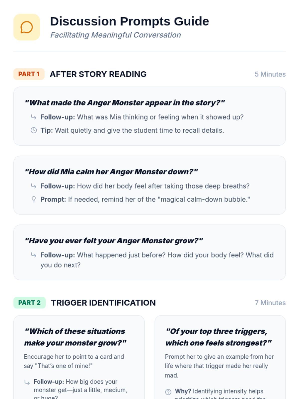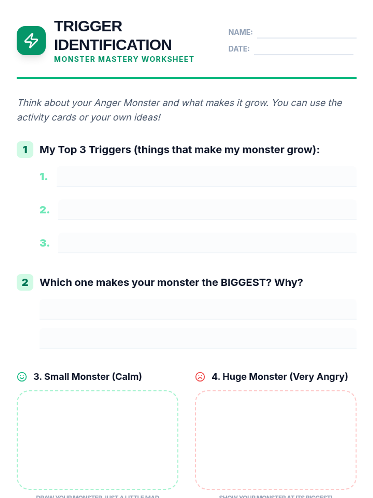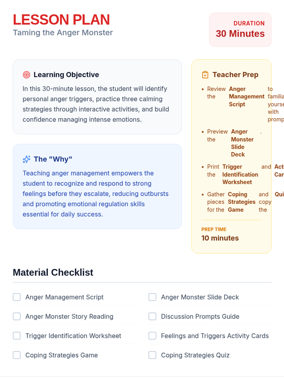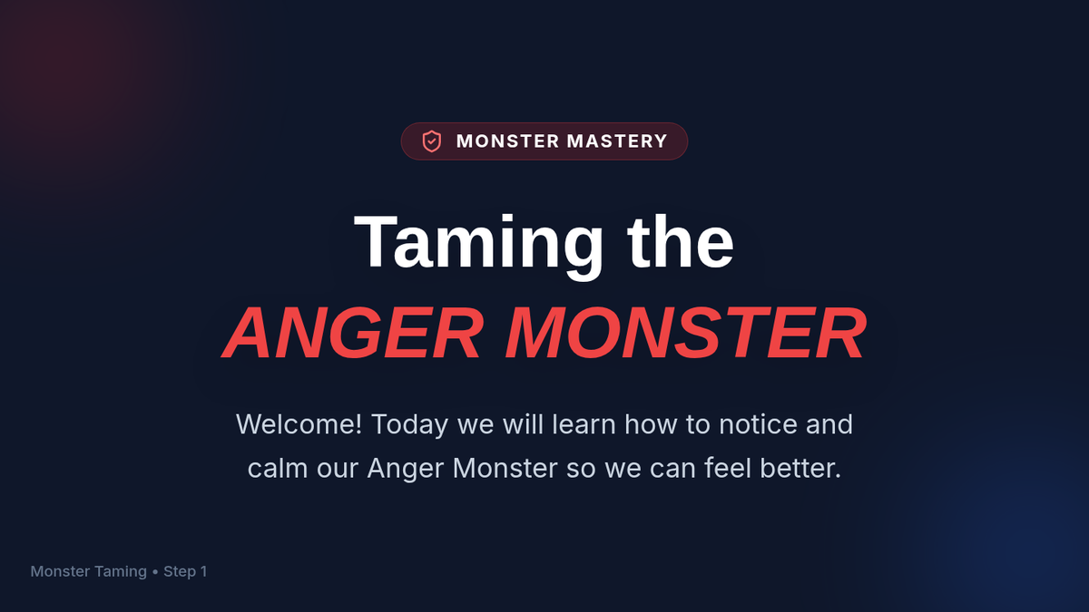 A 30-minute one-on-one lesson designed for a 9-year-old student to identify anger triggers, learn calming strategies, and build emotional regulation skills through an 'Anger Monster' theme.