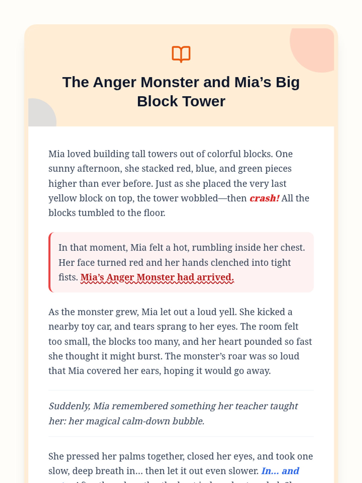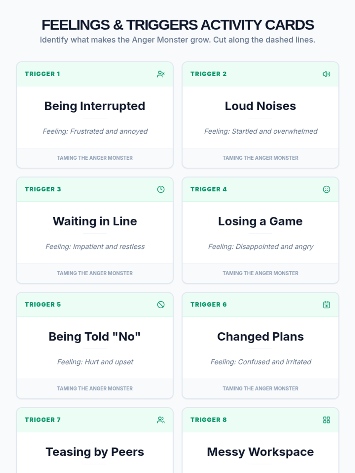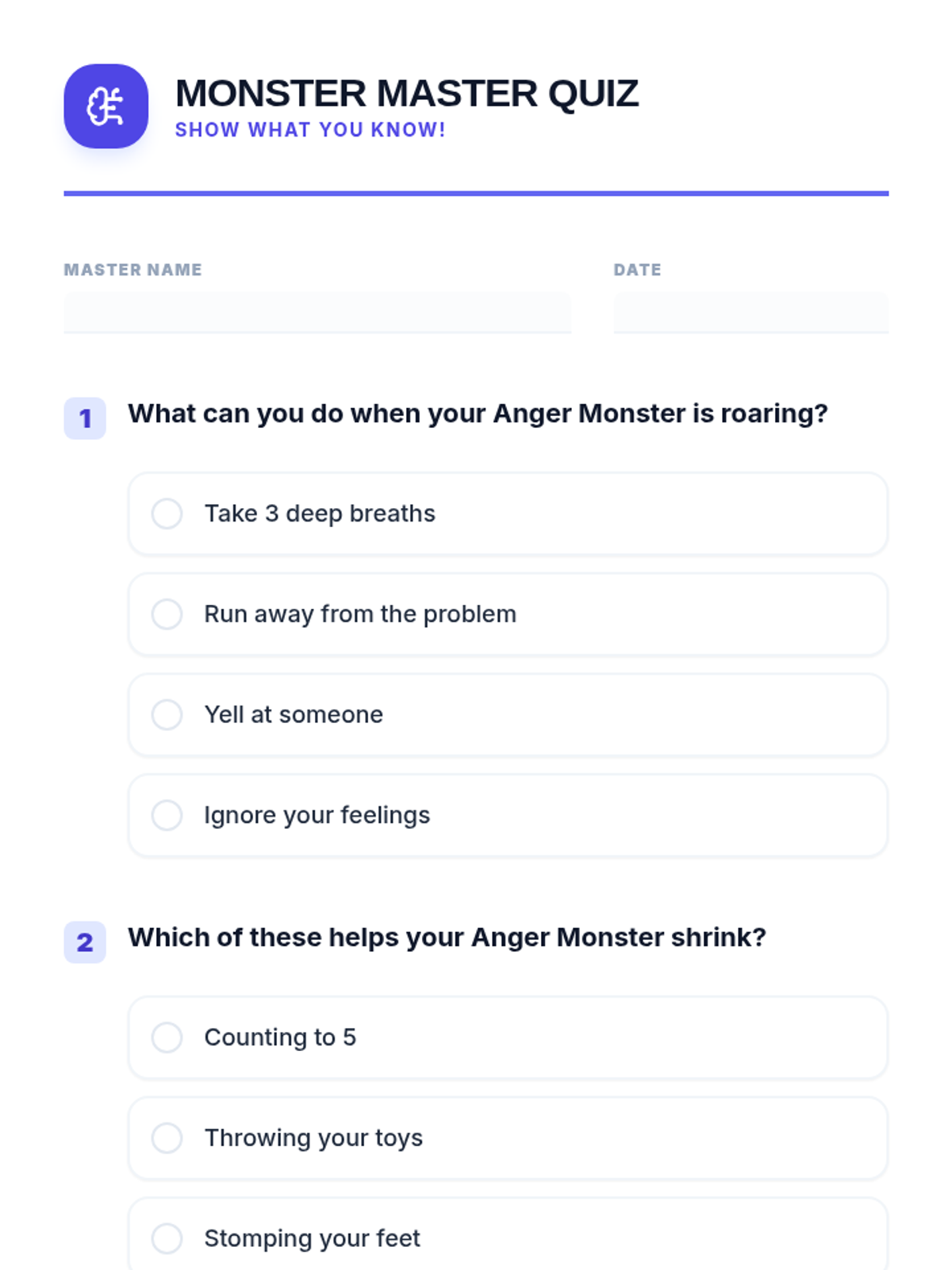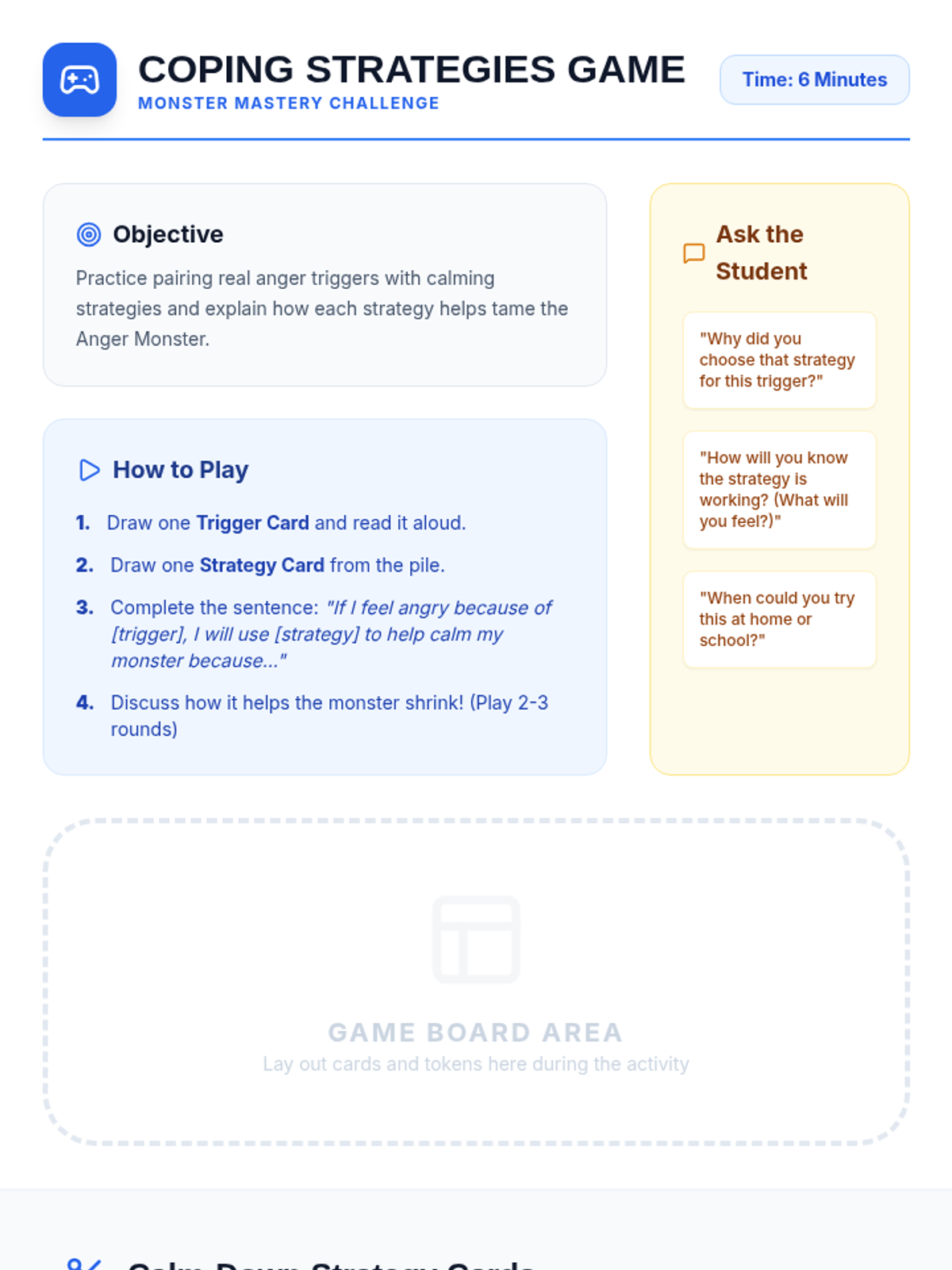 A 30-minute one-on-one lesson designed for a 9-year-old student to identify anger triggers, learn calming strategies, and build emotional regulation skills through an 'Anger Monster' theme.