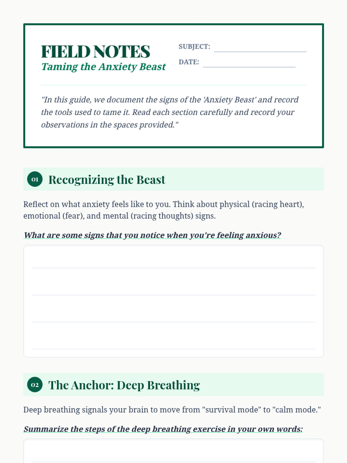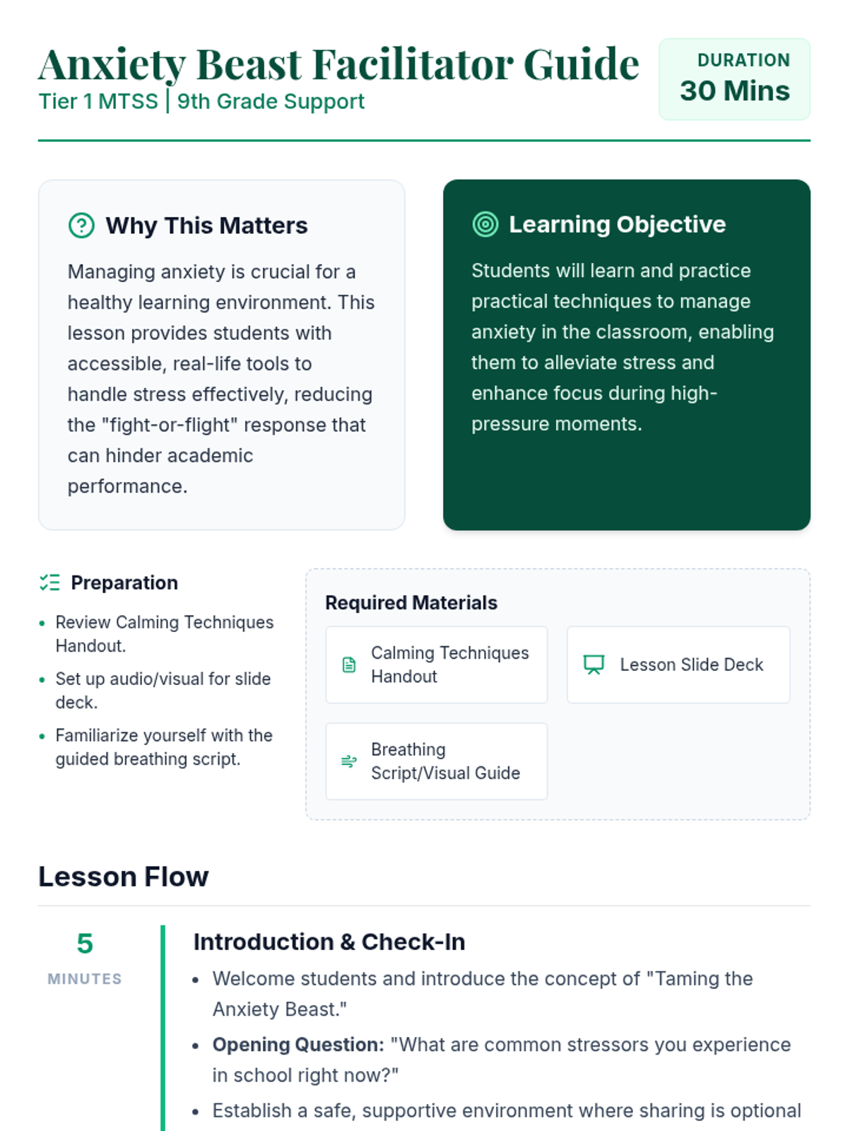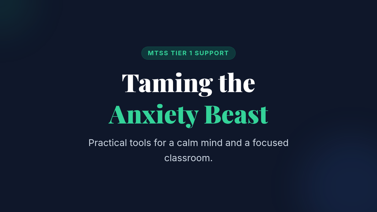 A 30-minute Tier 1 MTSS lesson for 9th graders focused on identifying anxiety and learning practical calming techniques like deep breathing and visualization.