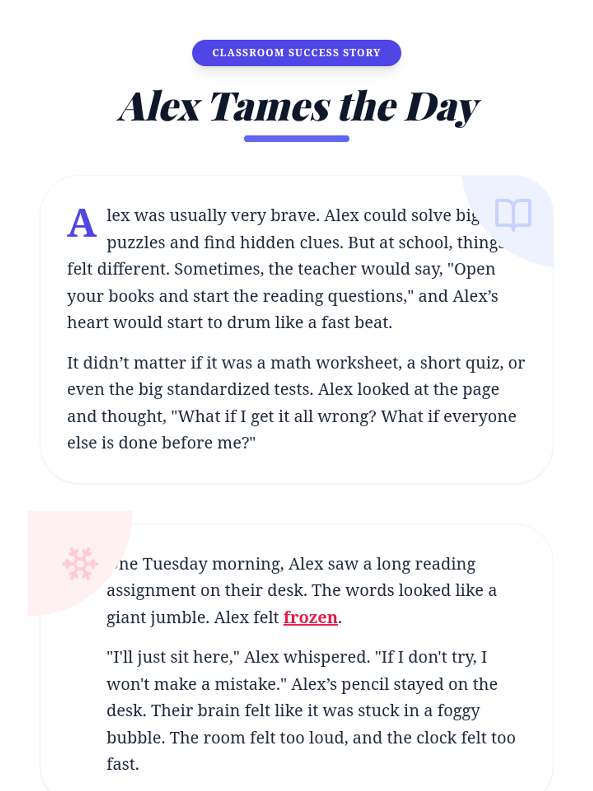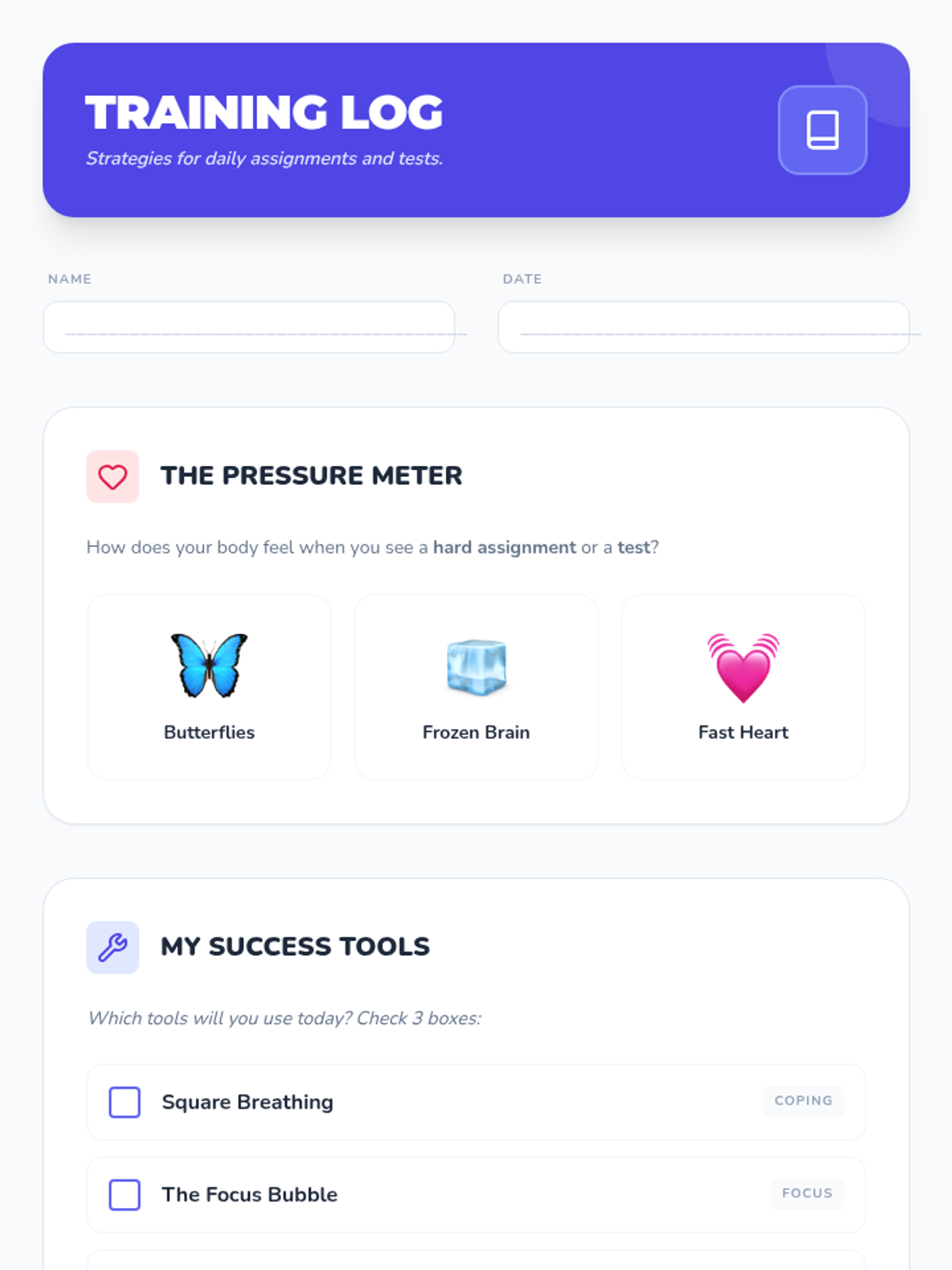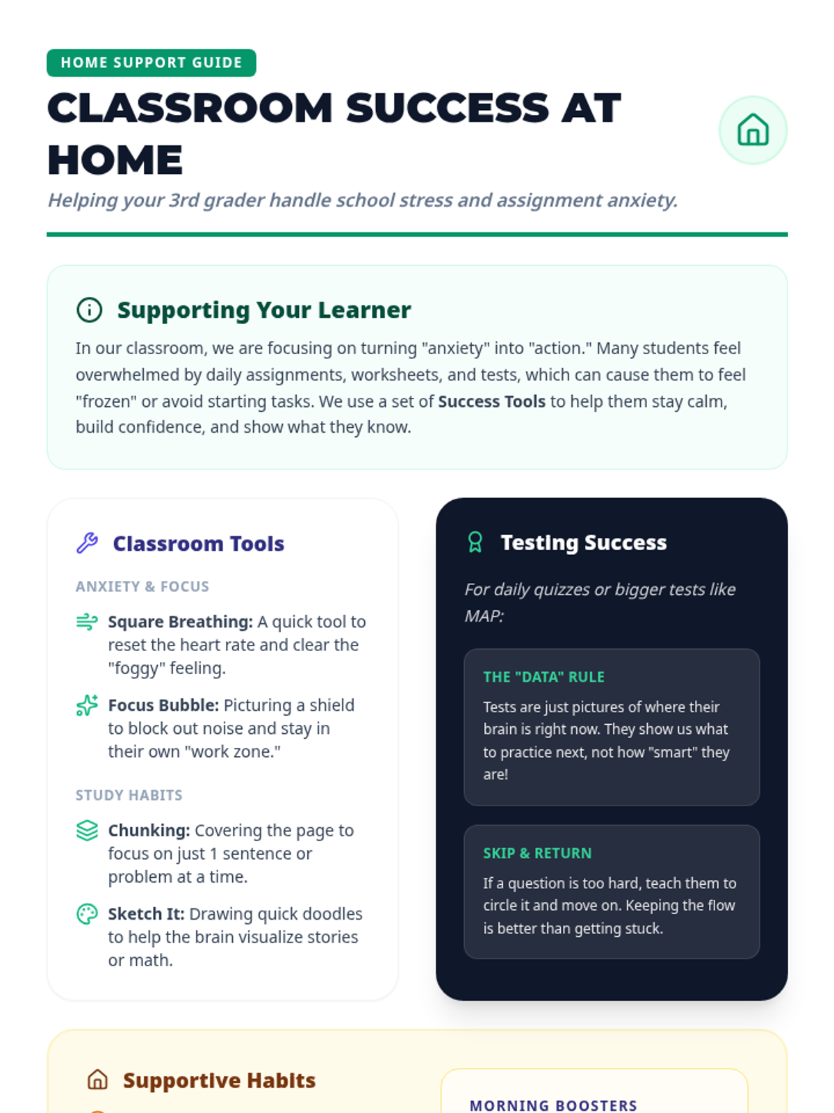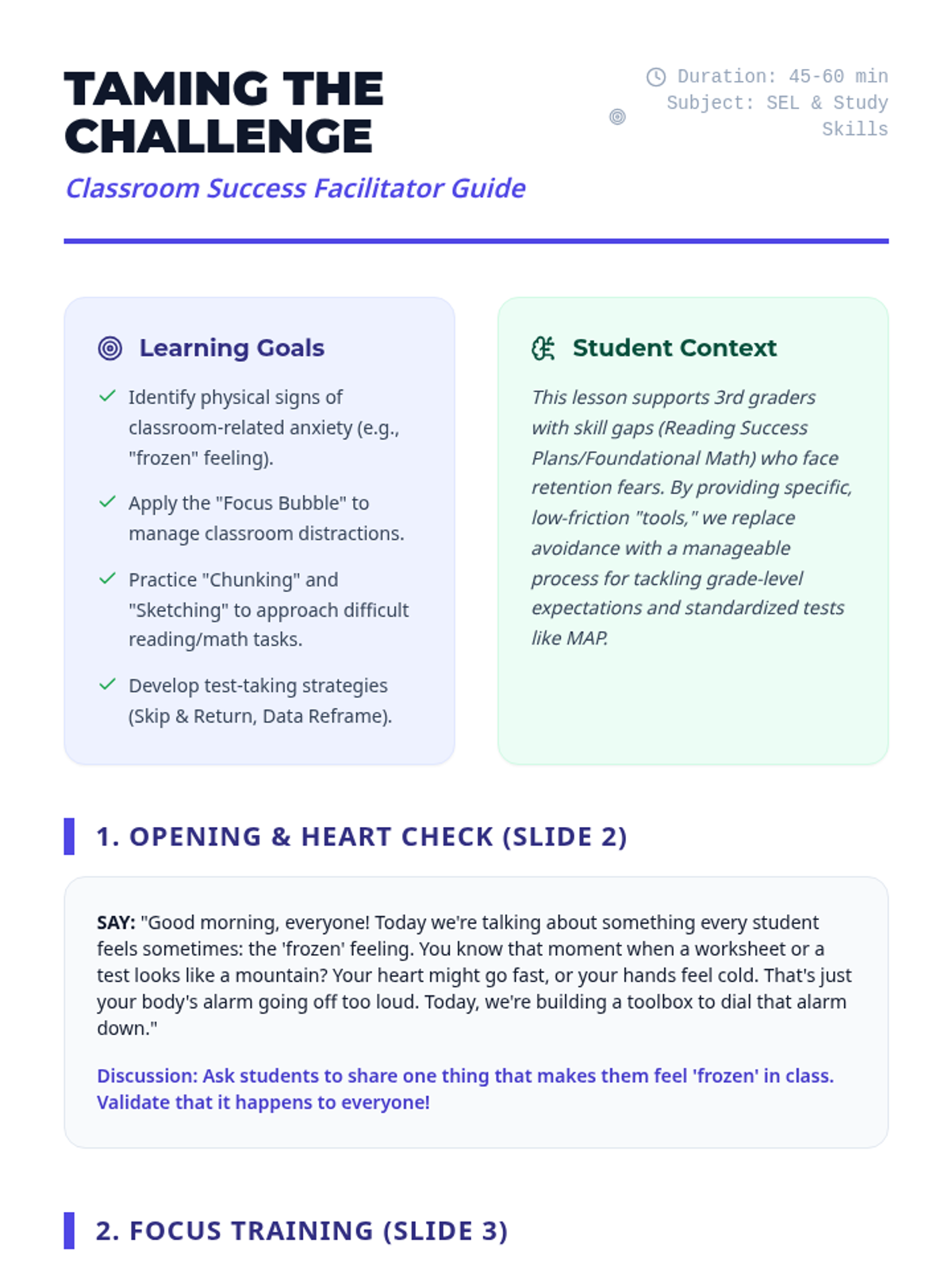 This lesson helps students identify classroom anxiety, learn tools for tackling daily assignments and tests, and build confidence through specific coping and study strategies. It covers anxiety reduction, focus tips, and step-by-step methods for approaching challenging work.