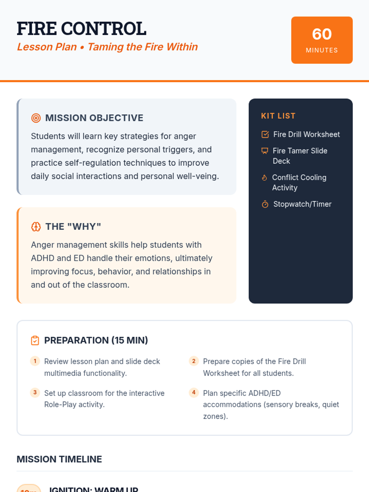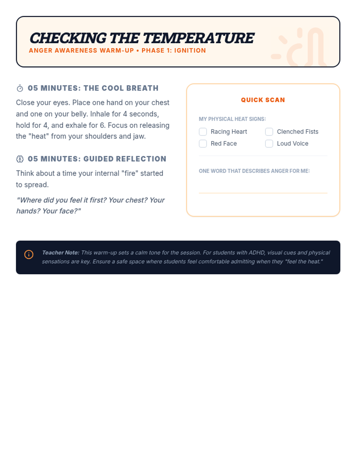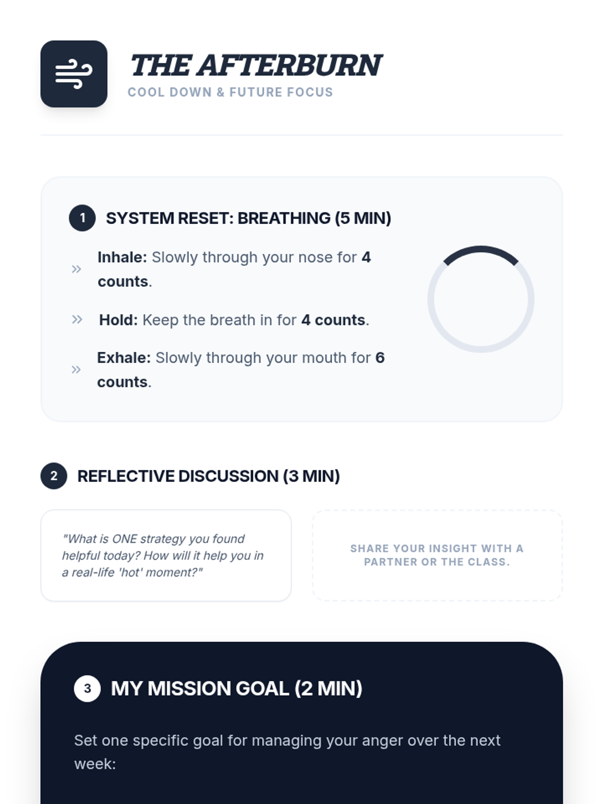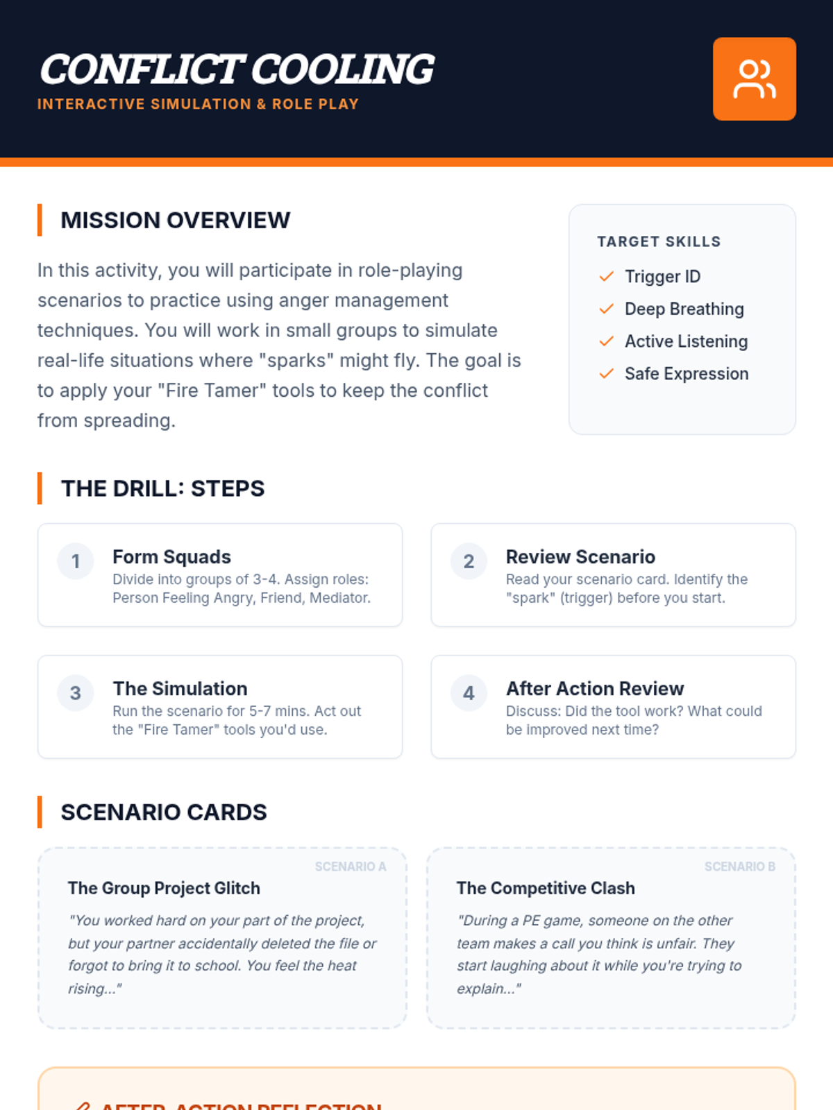 A 60-minute session for 7th-grade students, focusing on anger management strategies tailored for students with ADHD and emotional disturbances. Students identify triggers and practice self-regulation techniques to improve social interactions.