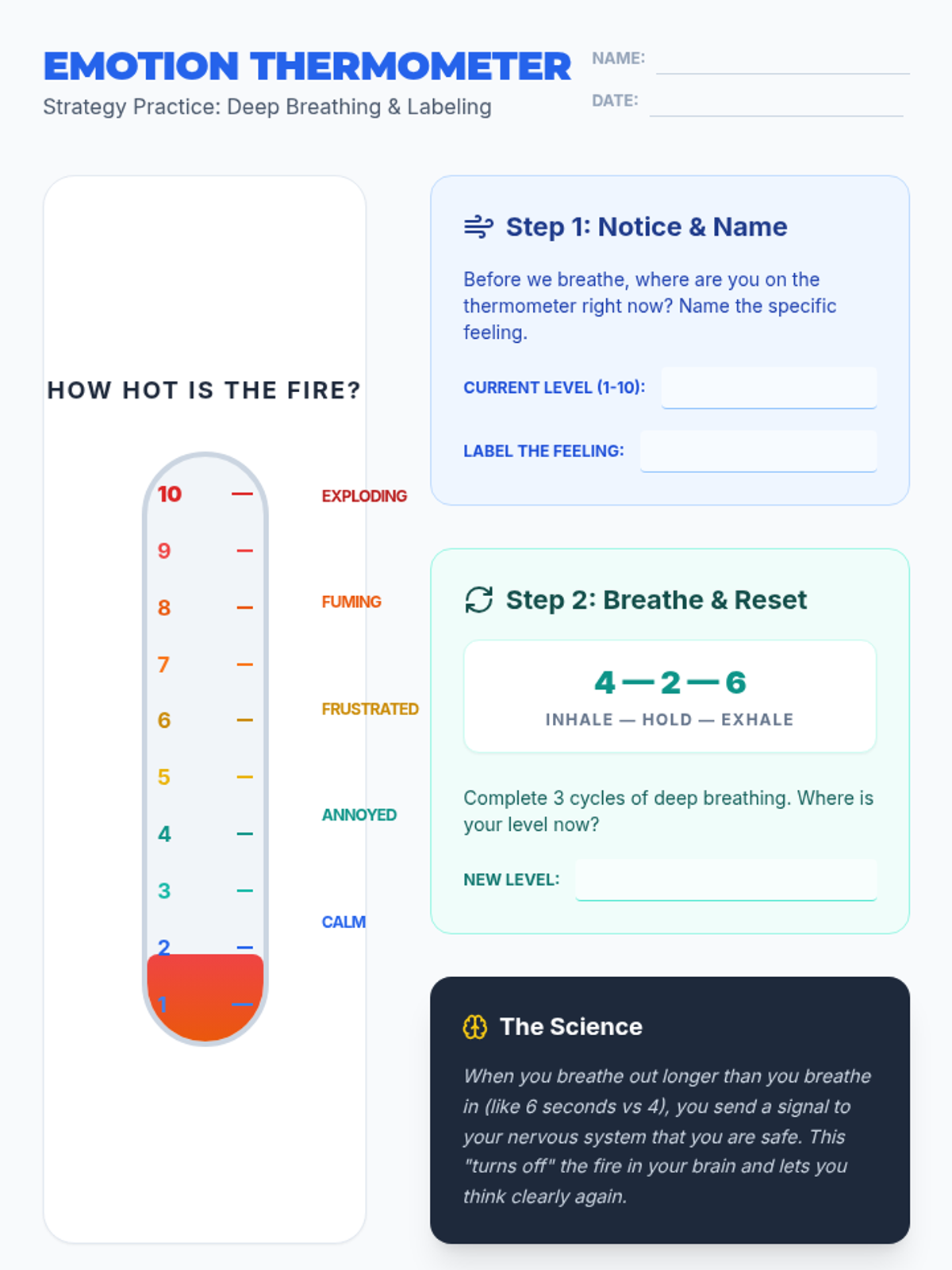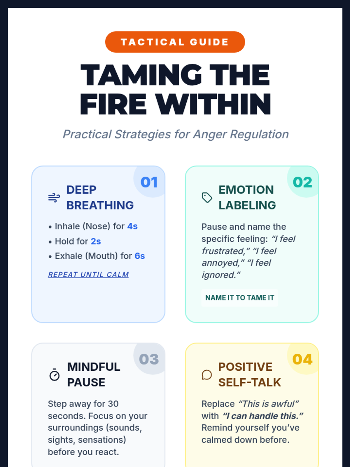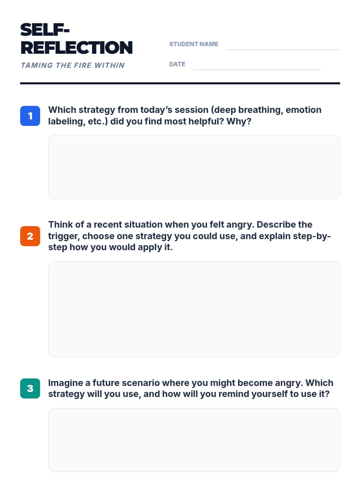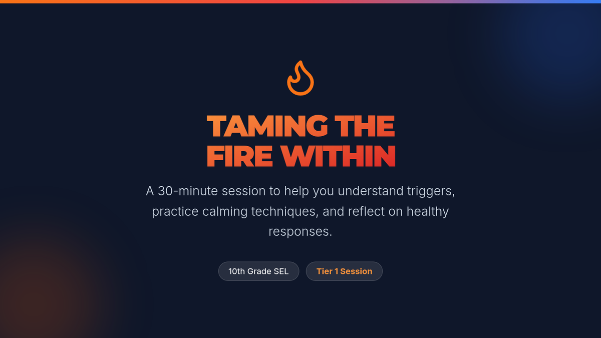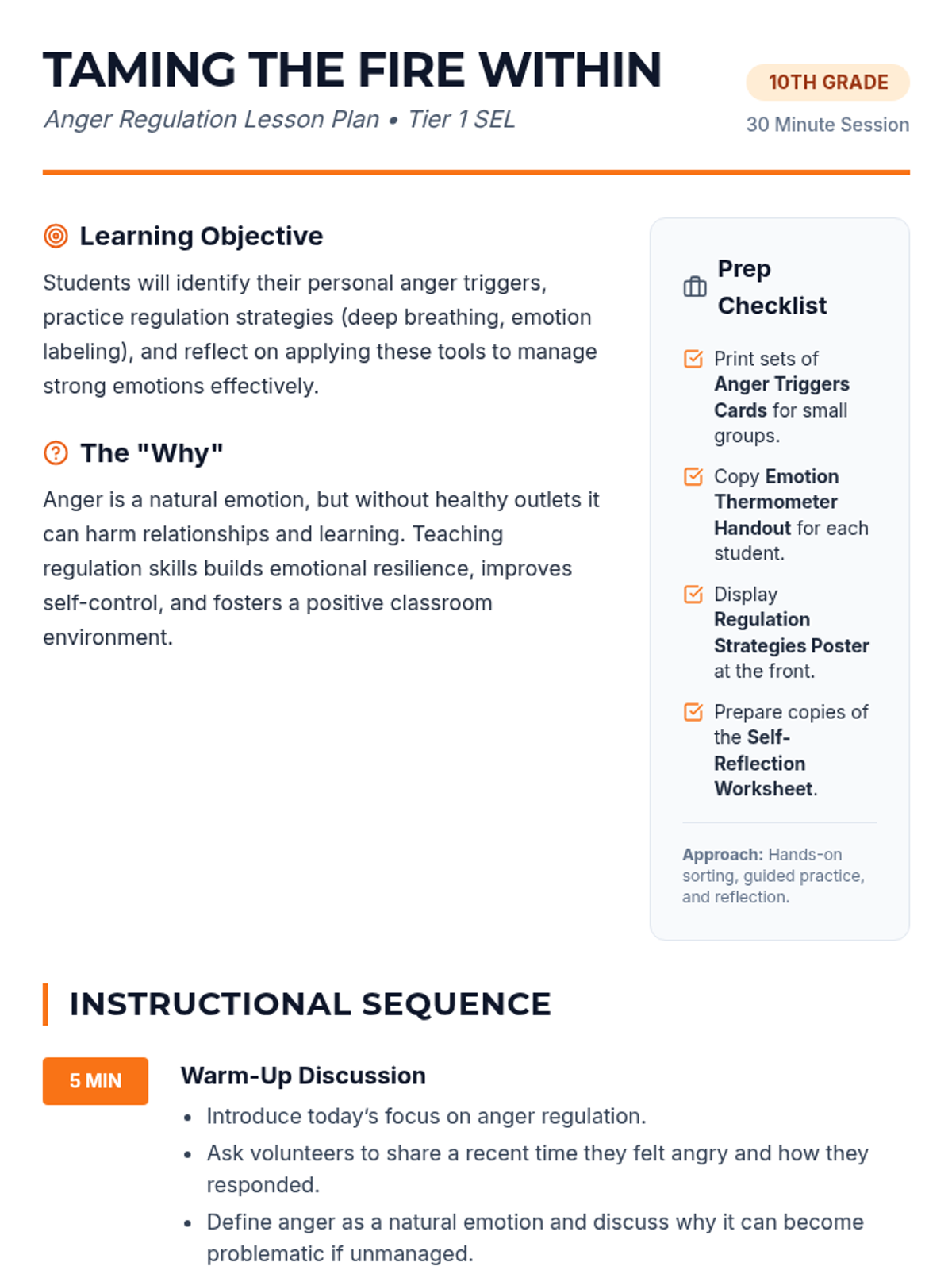 A 30-minute Tier 1 SEL lesson for 10th graders focused on identifying anger triggers and practicing evidence-based regulation strategies like deep breathing and emotion labeling.