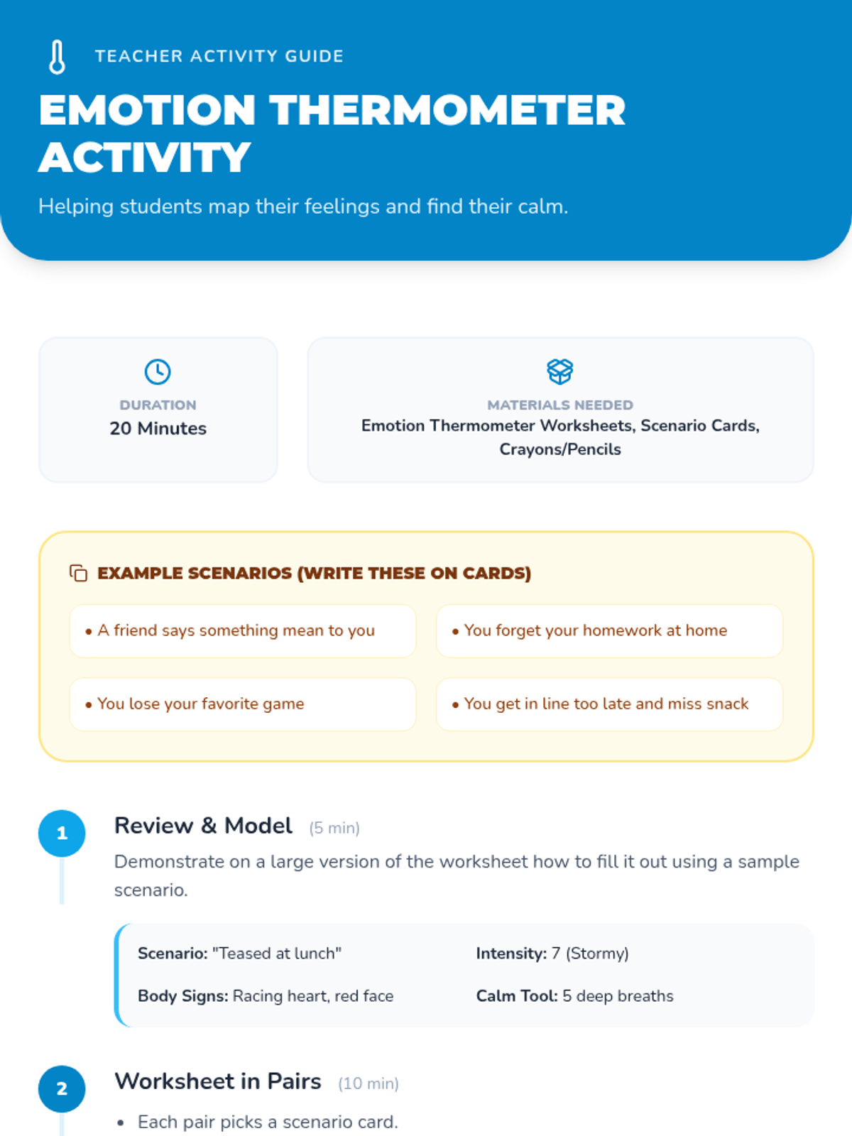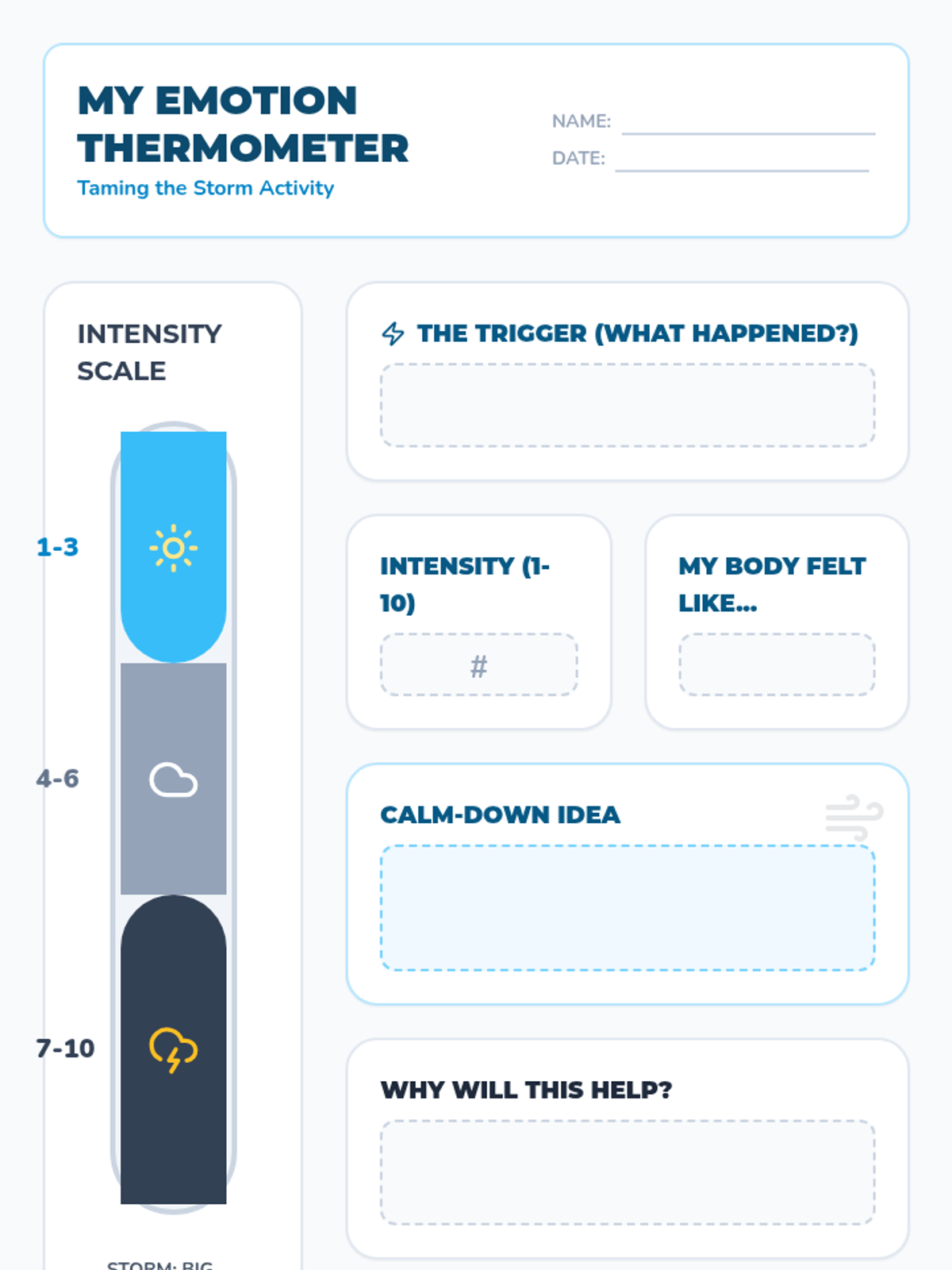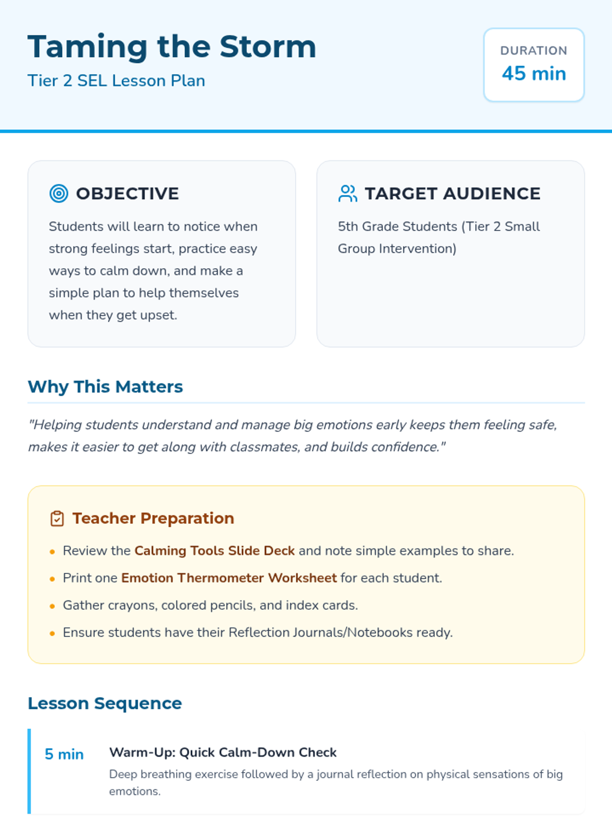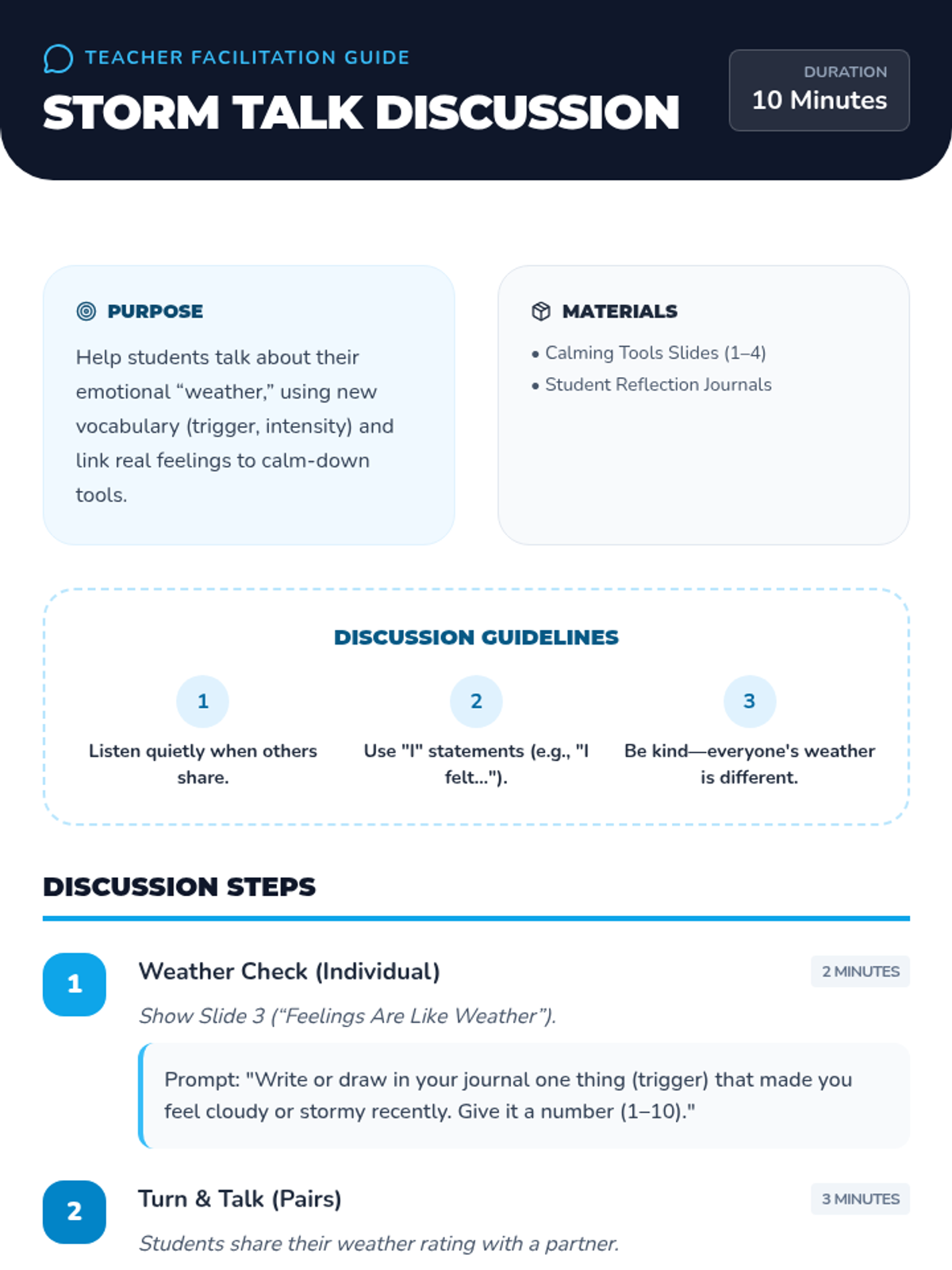 A 45-minute Tier 2 SEL lesson for students to identify triggers, rate emotional intensity using a weather metaphor, and practice self-regulation strategies.