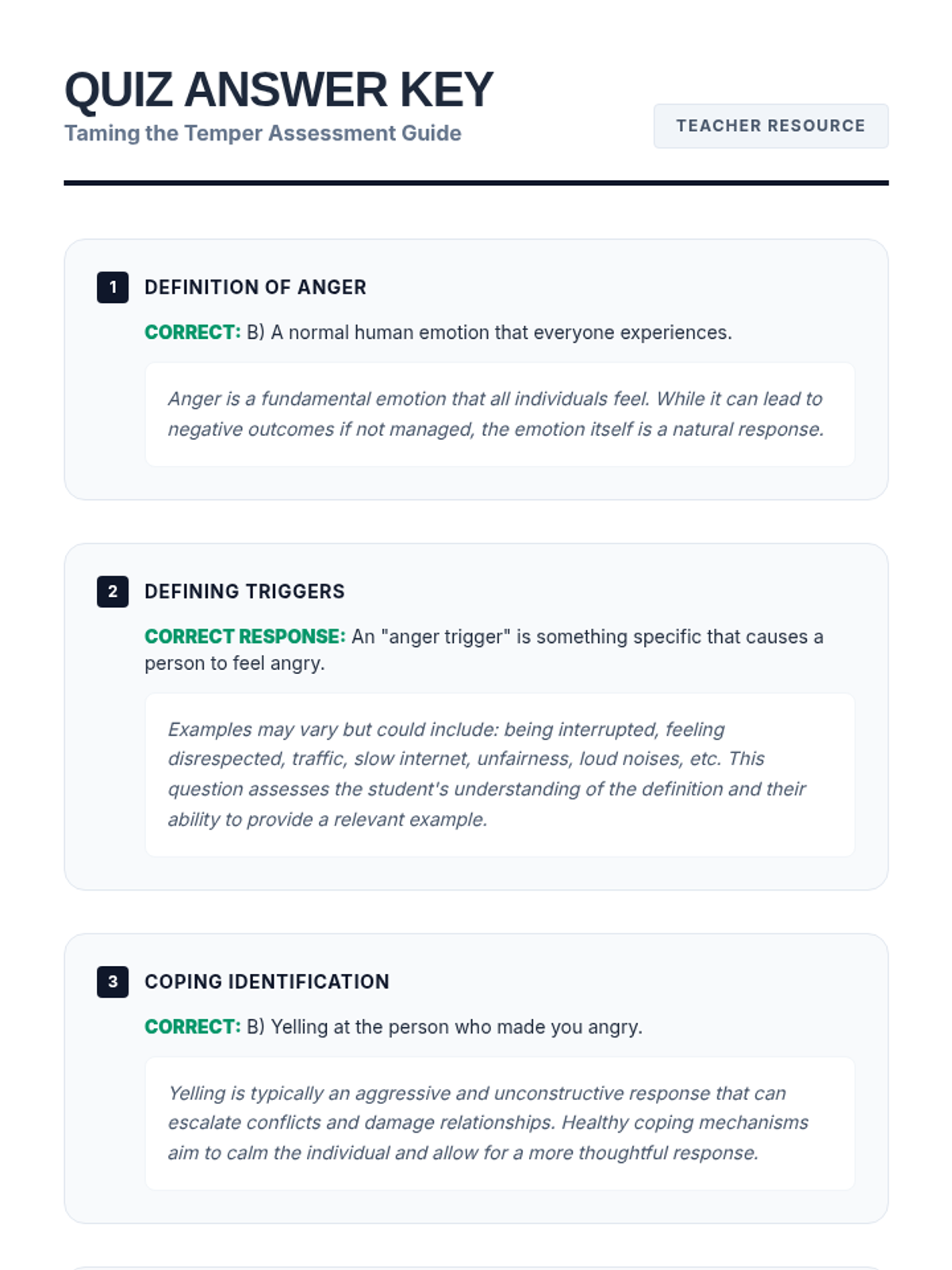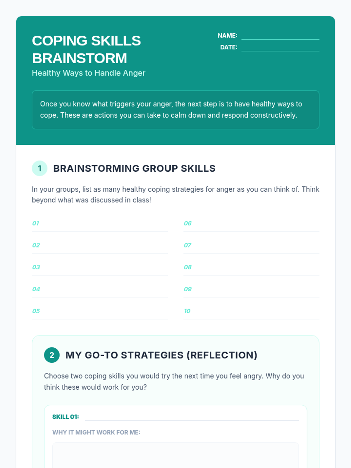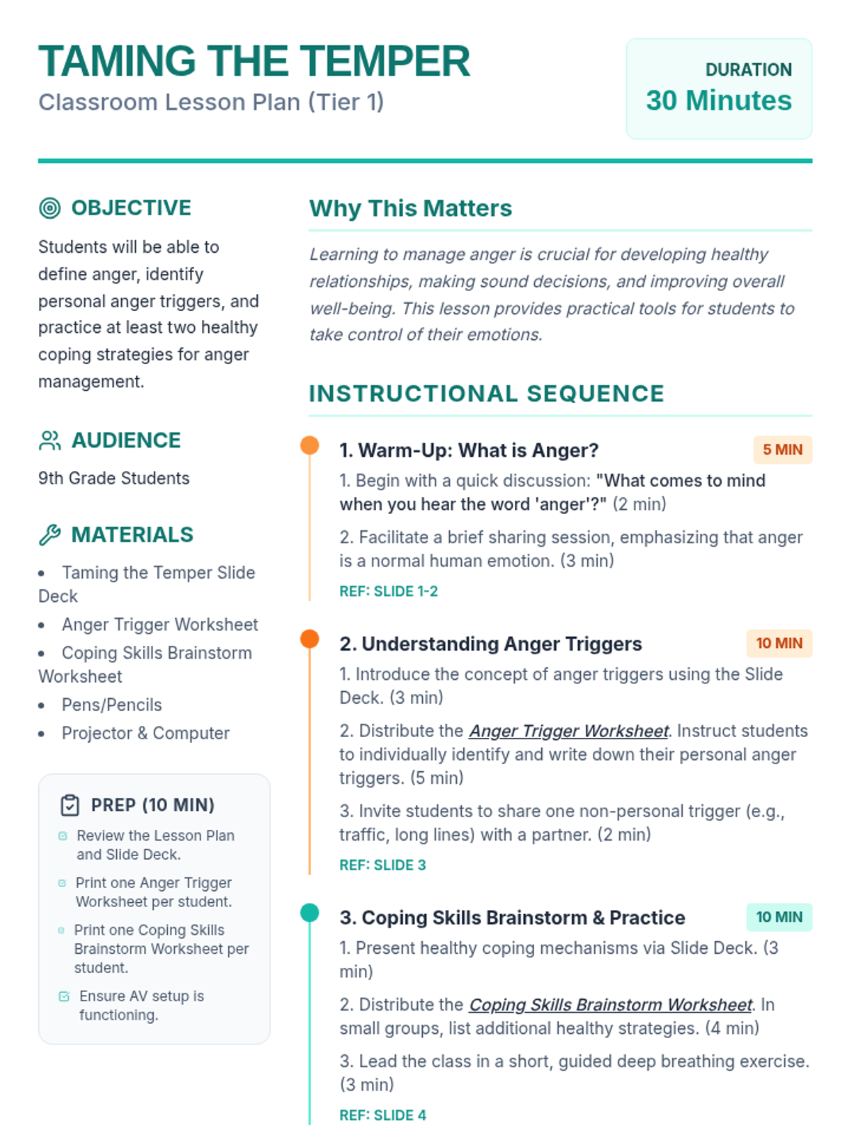 This lesson helps 9th-grade students understand what anger is, identify their anger triggers, and learn healthy coping mechanisms to manage their anger effectively. It empowers them with essential life skills to navigate challenging emotions.