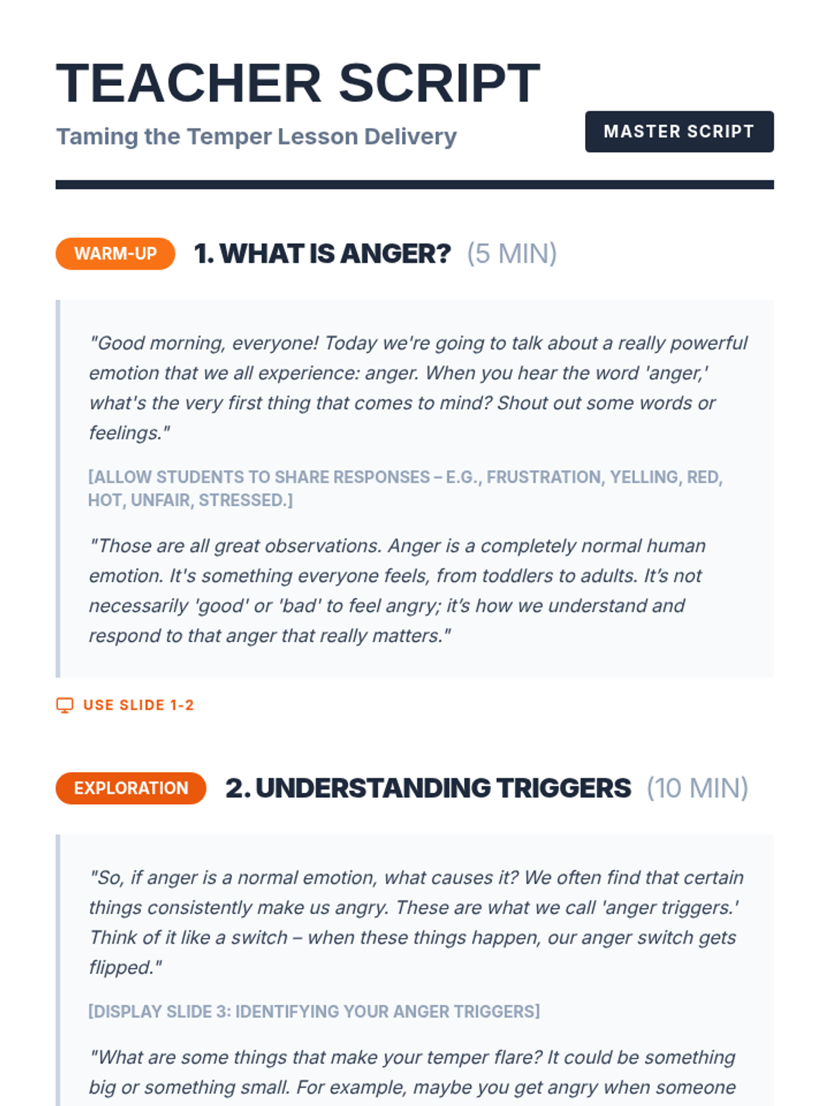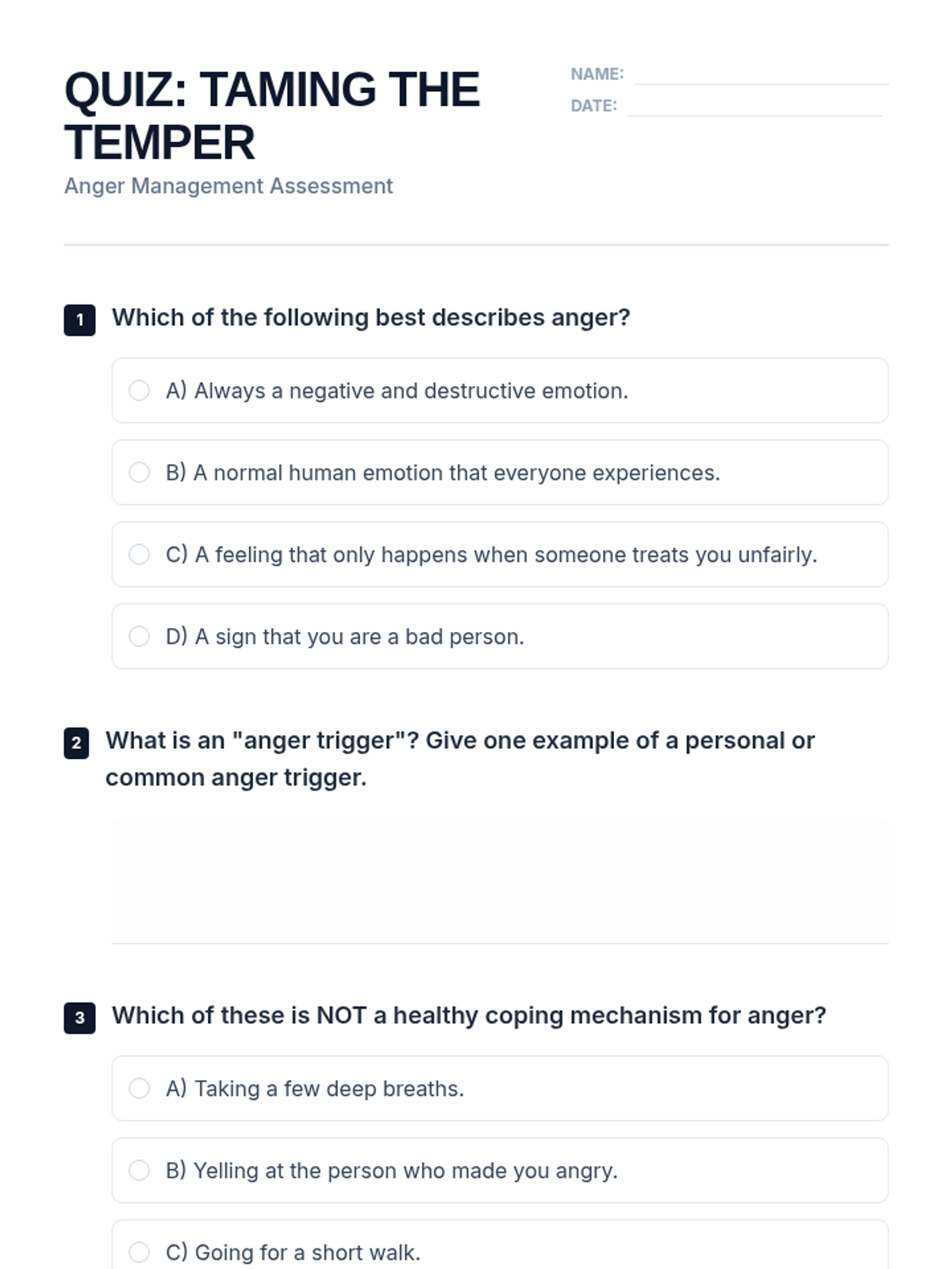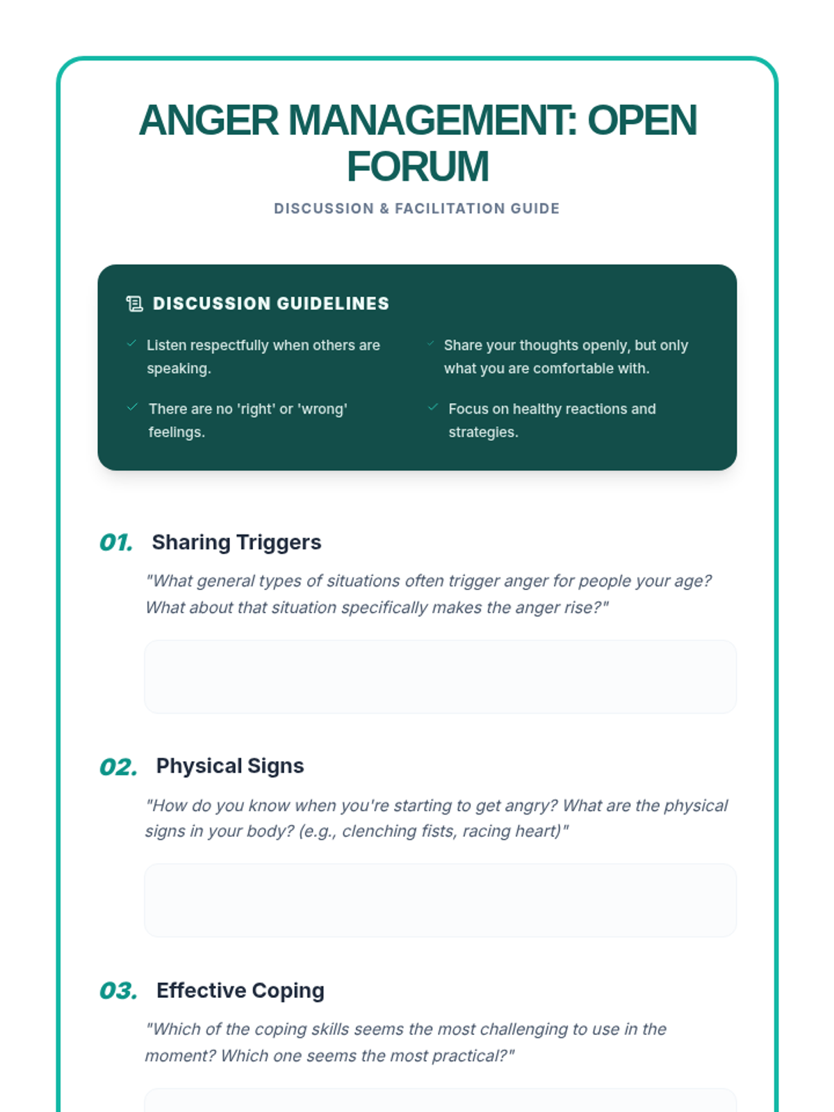 This lesson helps 9th-grade students understand what anger is, identify their anger triggers, and learn healthy coping mechanisms to manage their anger effectively. It empowers them with essential life skills to navigate challenging emotions.