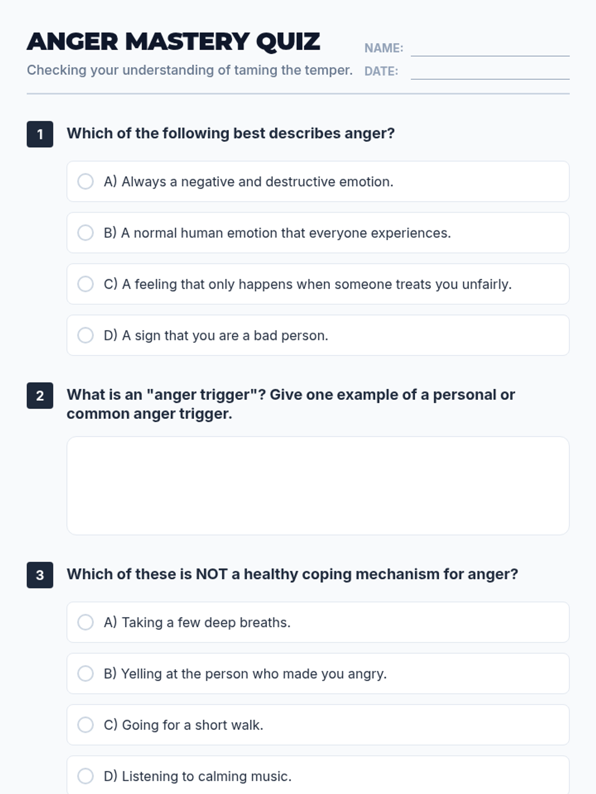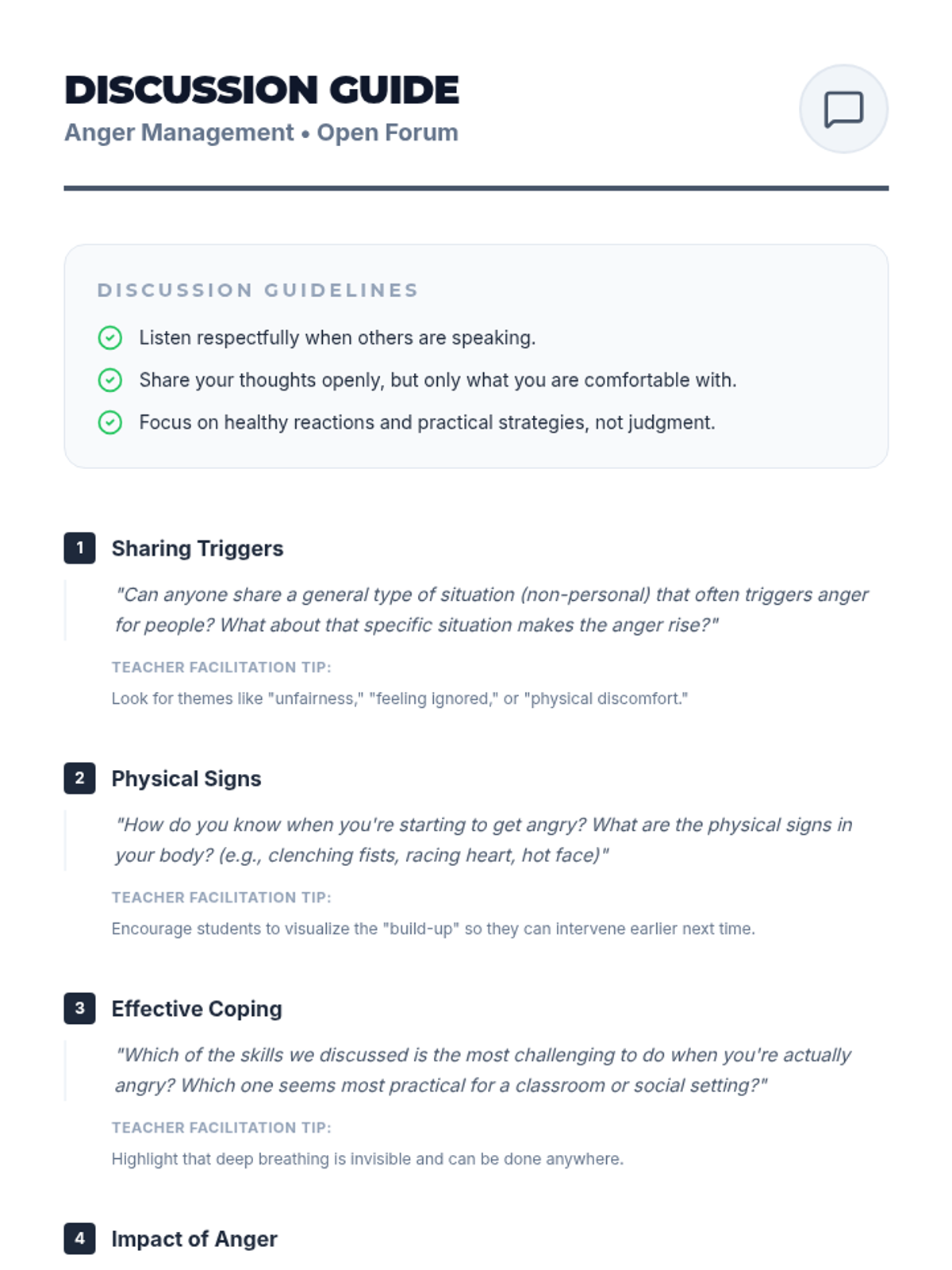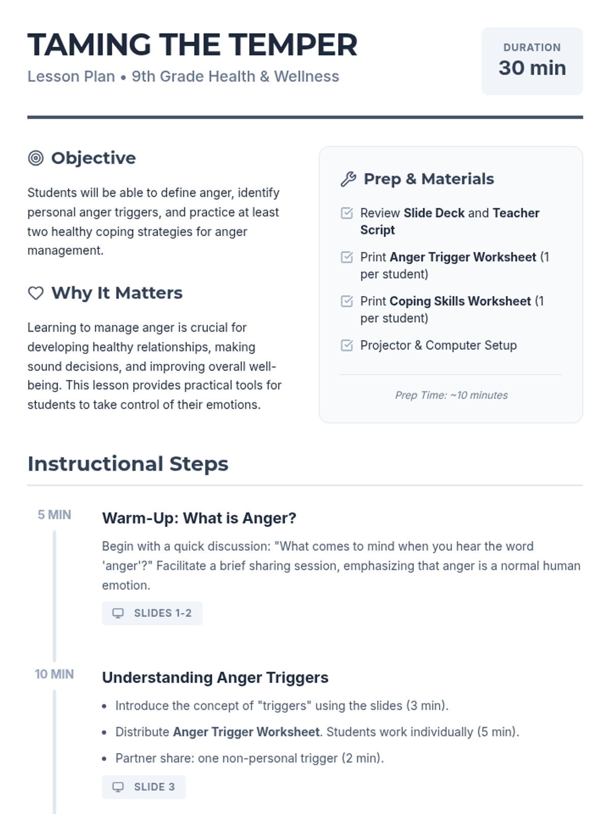 This lesson helps 9th-grade students understand anger, identify personal triggers, and learn healthy coping mechanisms to manage emotions effectively. It empowers them with essential life skills through interactive discussion and guided practice.