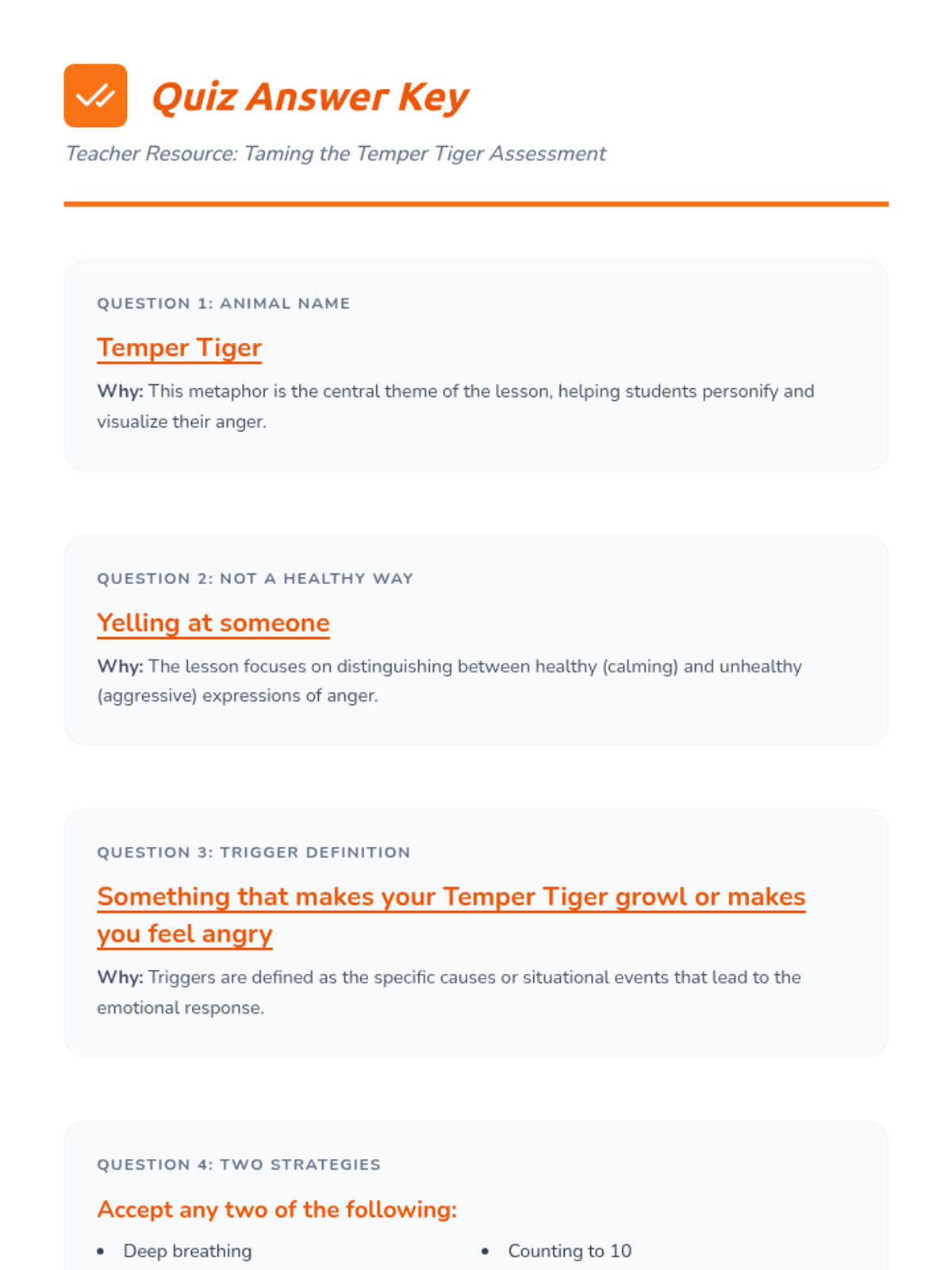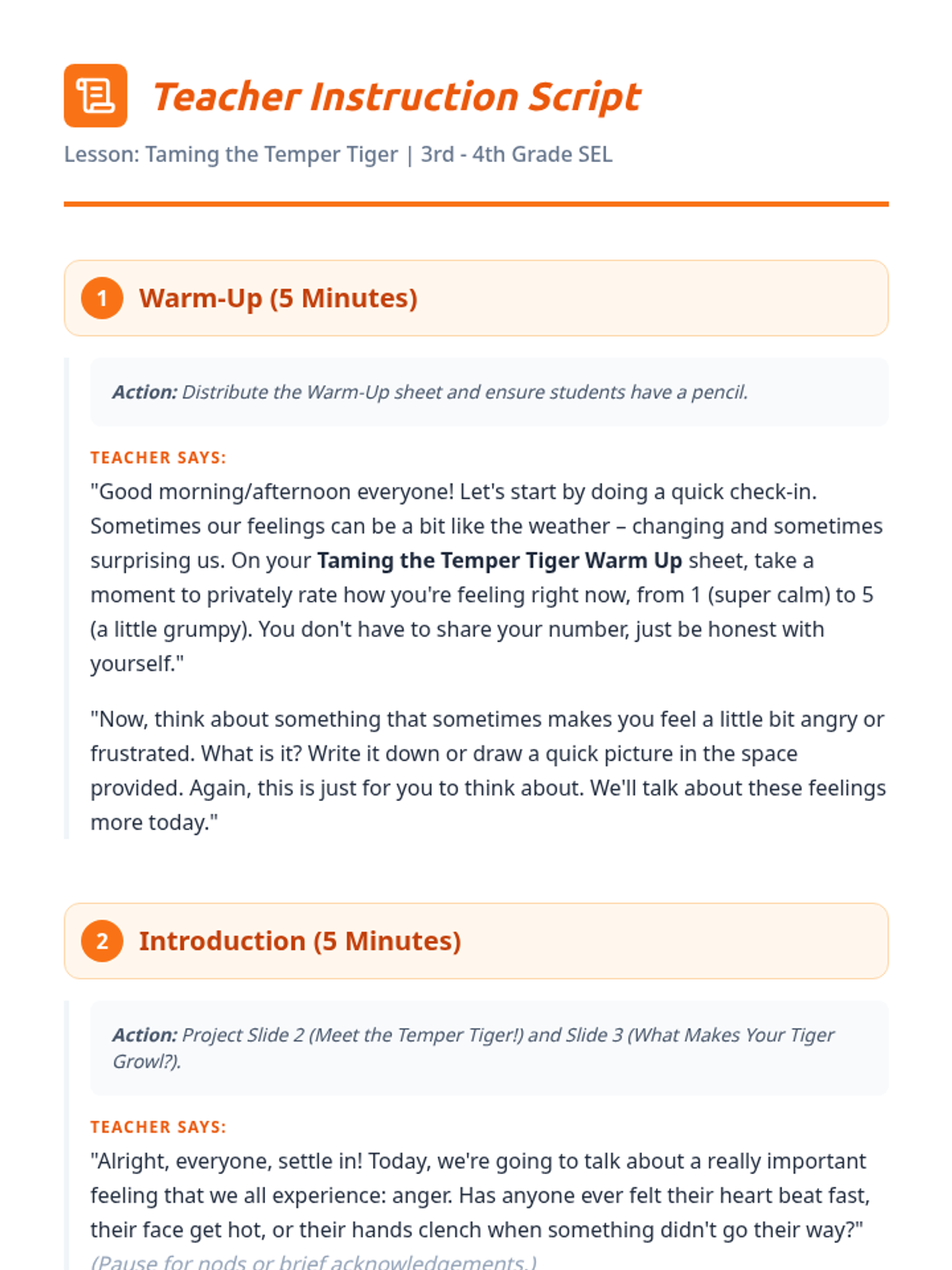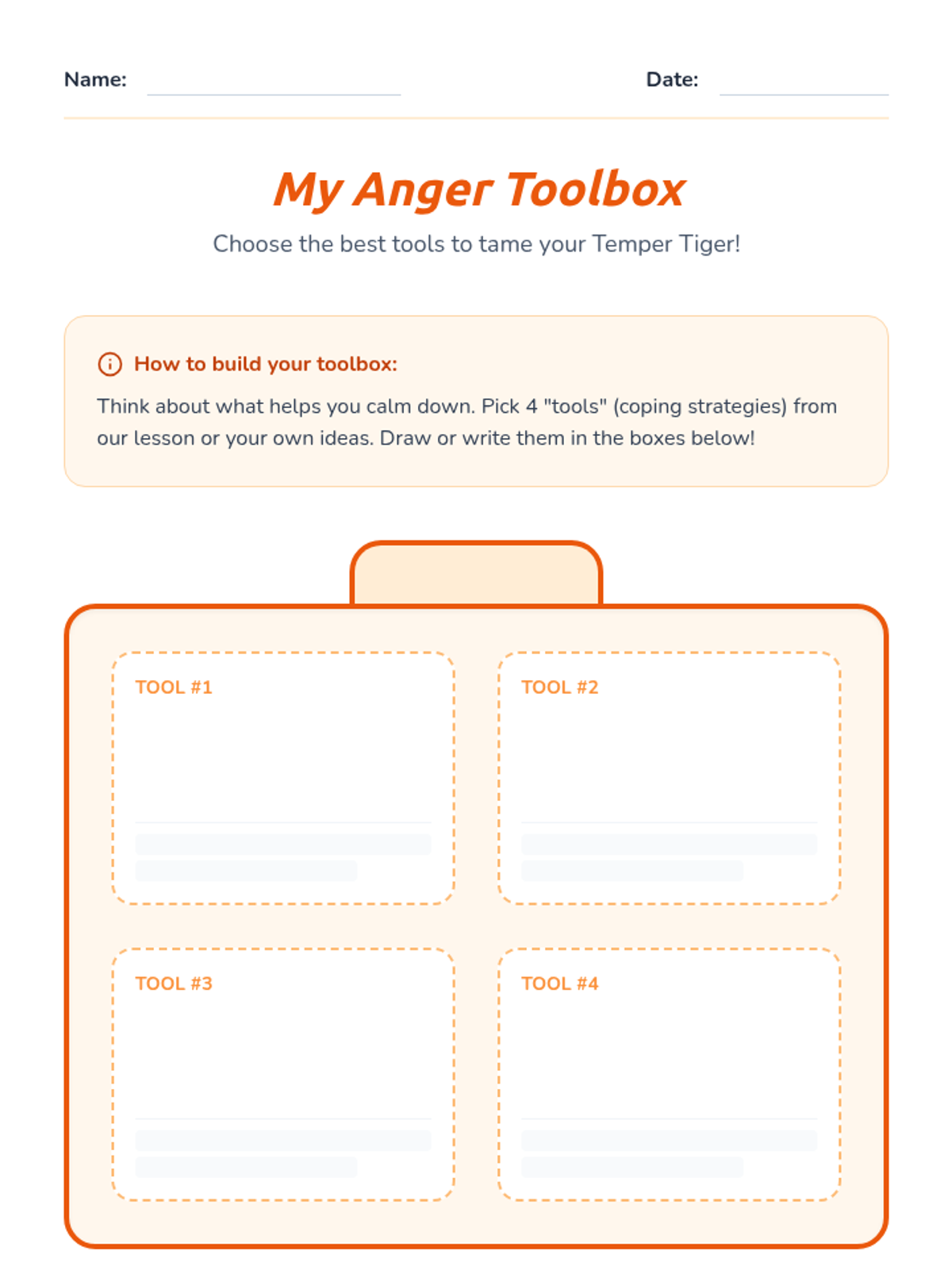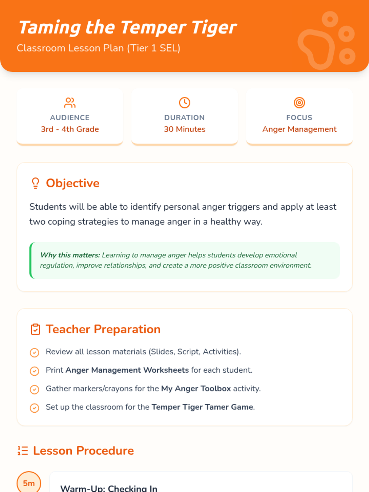 A 30-minute SEL lesson for 3rd and 4th graders focused on identifying anger triggers and building a 'toolbox' of healthy coping strategies using the 'Temper Tiger' metaphor.