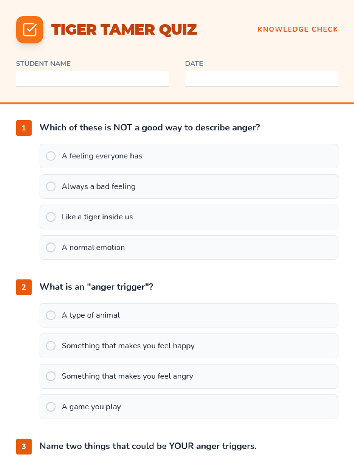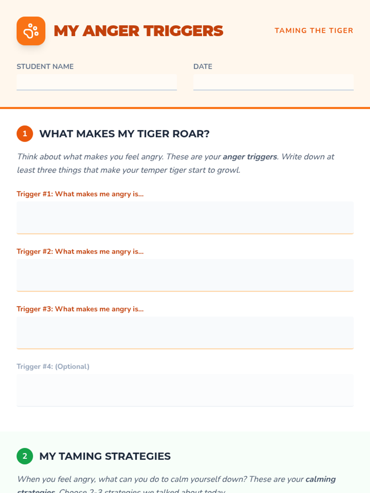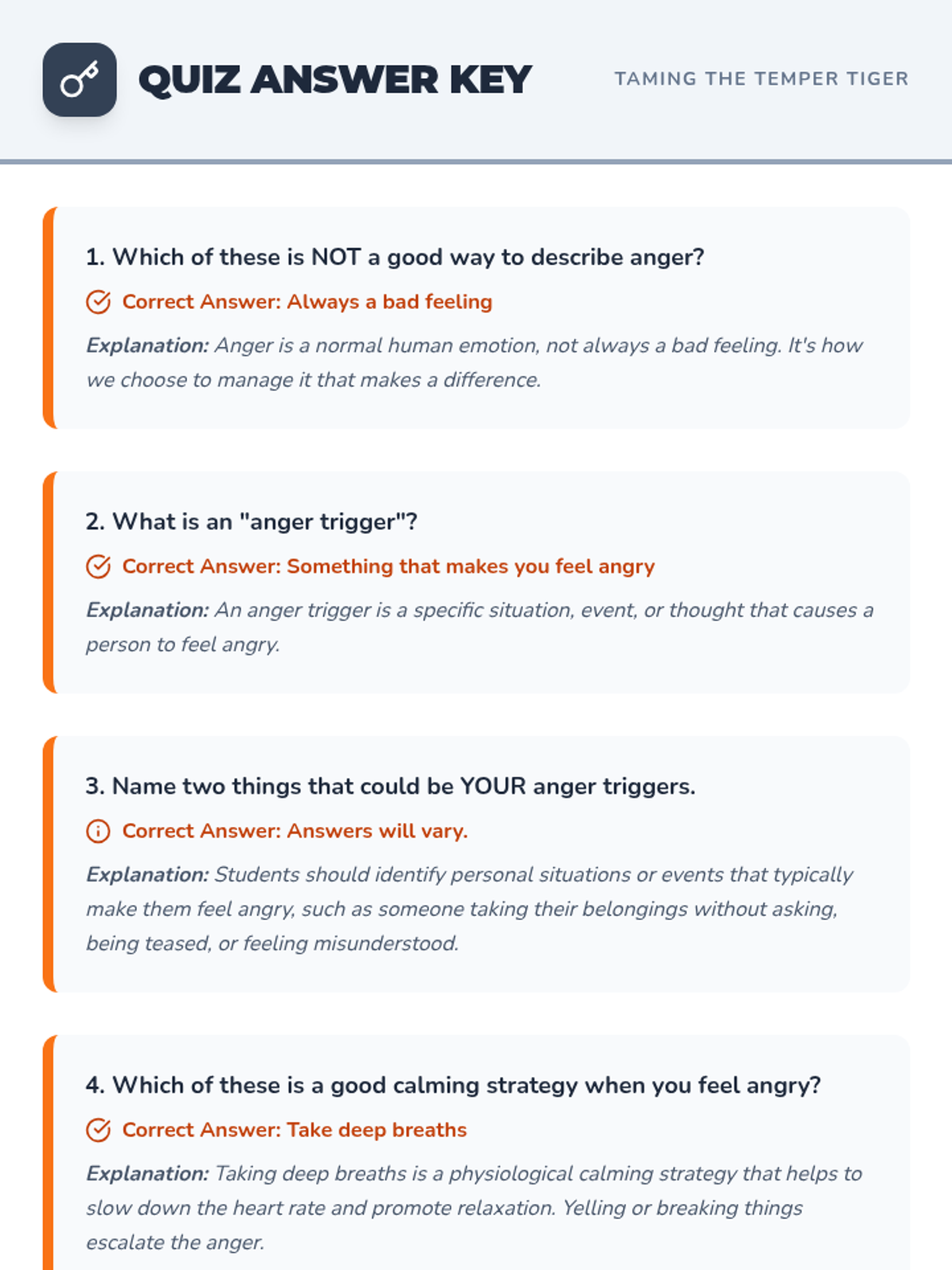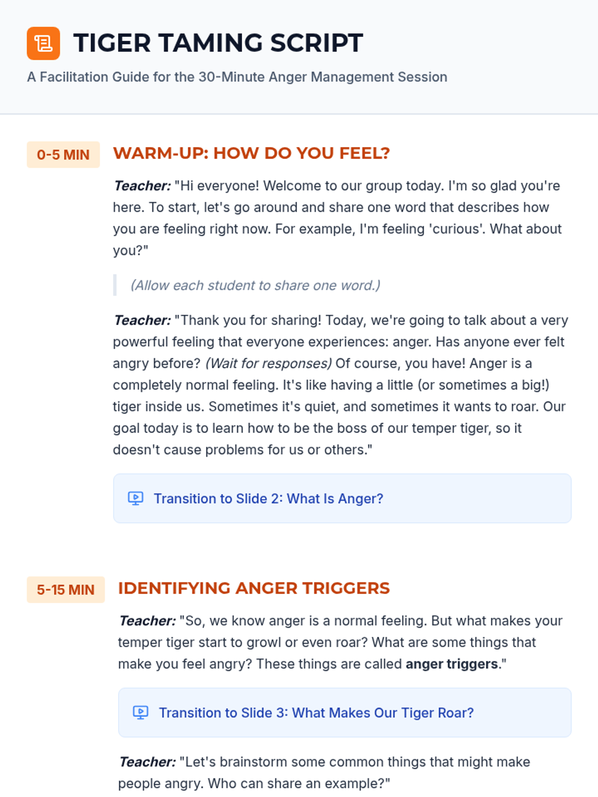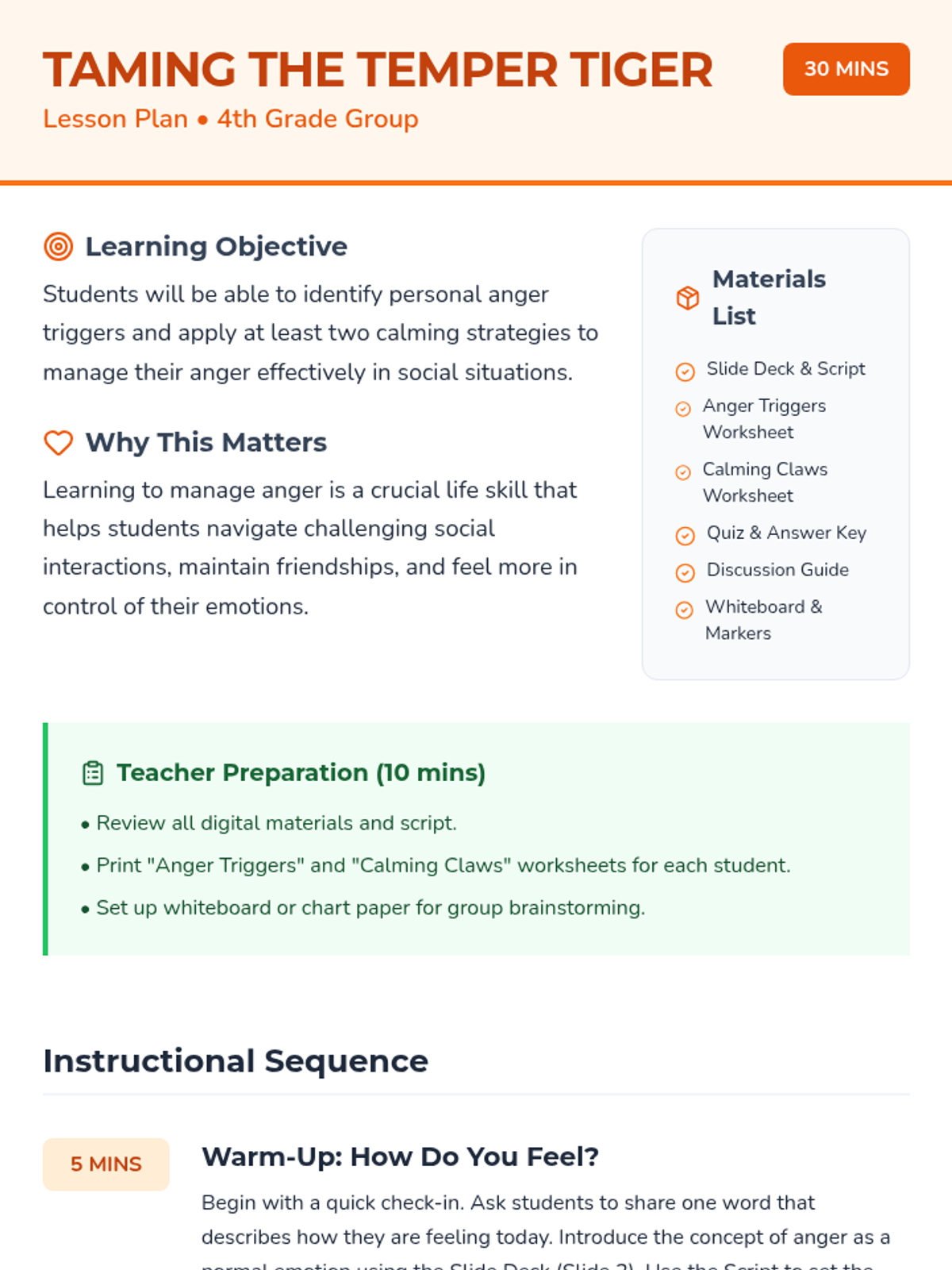 A small-group social-emotional learning lesson designed for 4th-grade students to identify personal anger triggers and practice effective calming strategies using a "Temper Tiger" metaphor.