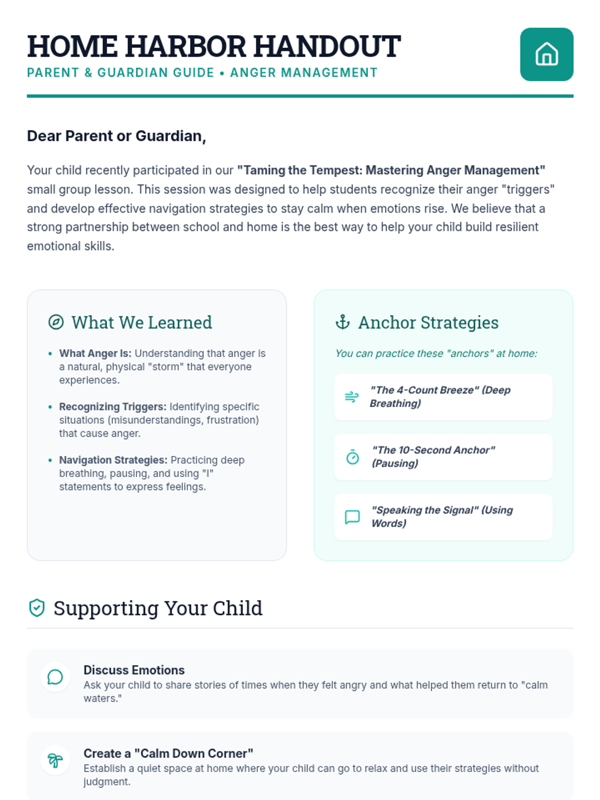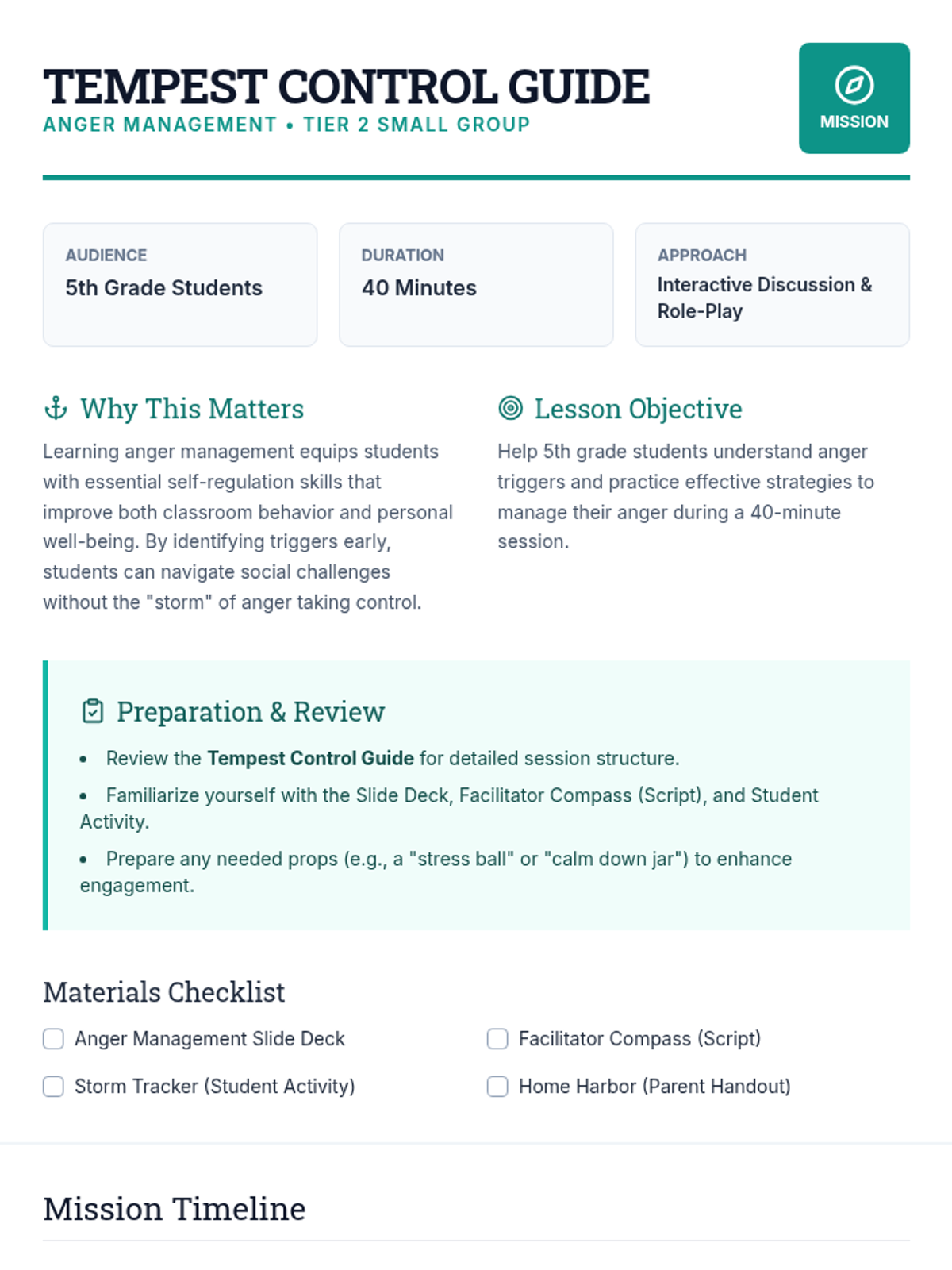 A 40-minute Tier 2 small group lesson for 5th graders focused on identifying anger triggers and practicing self-regulation strategies through role-play.