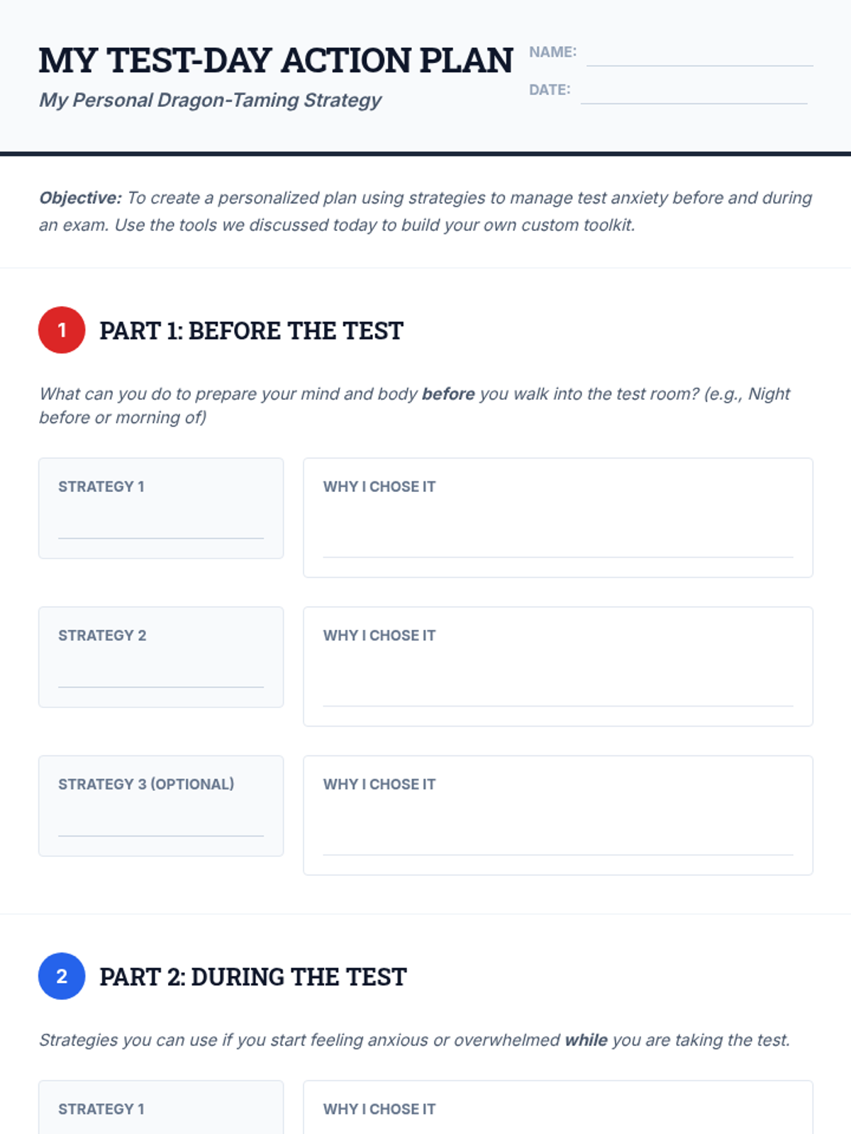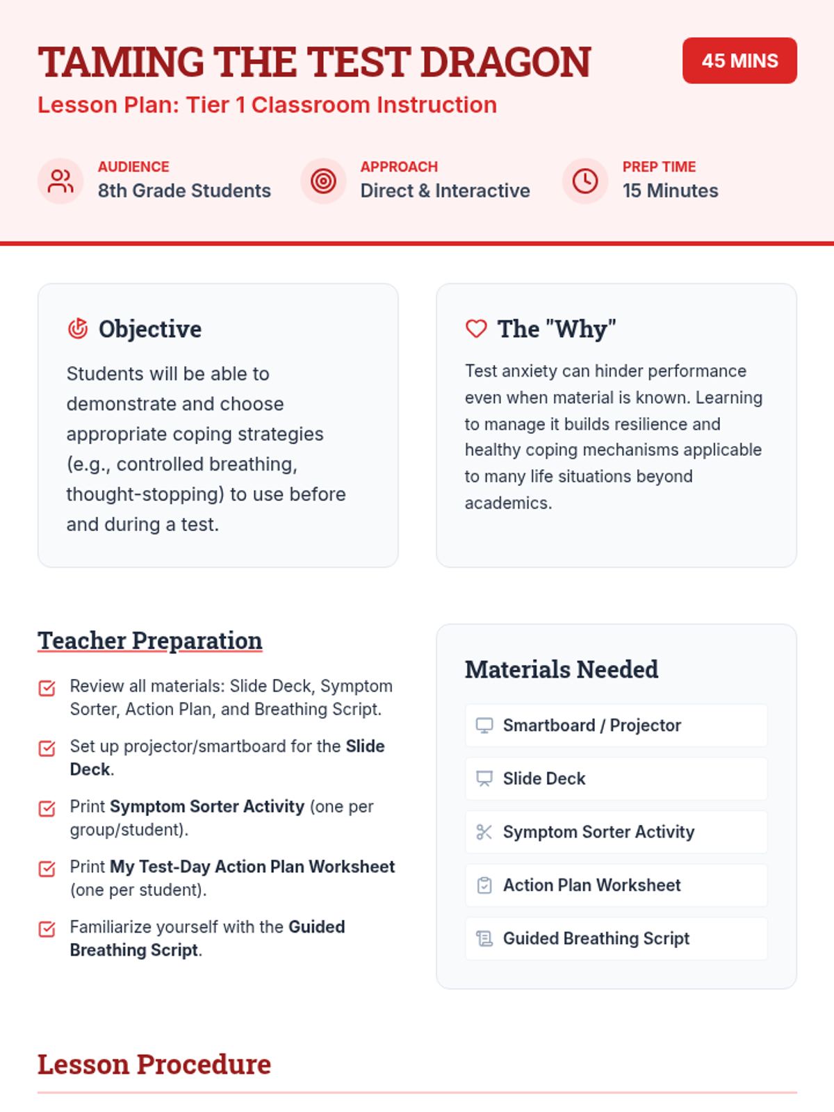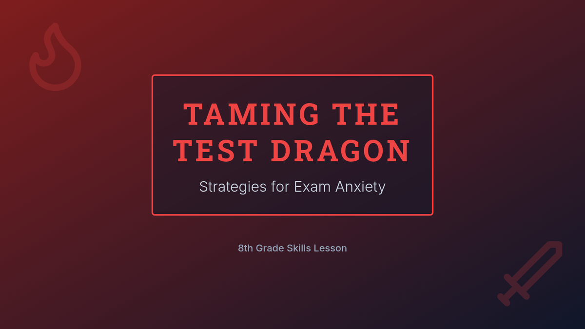 This lesson helps 8th-grade students identify and manage test anxiety through practical coping strategies like controlled breathing and positive visualization. Students will create a personalized action plan to empower them to approach exams with greater confidence and resilience.