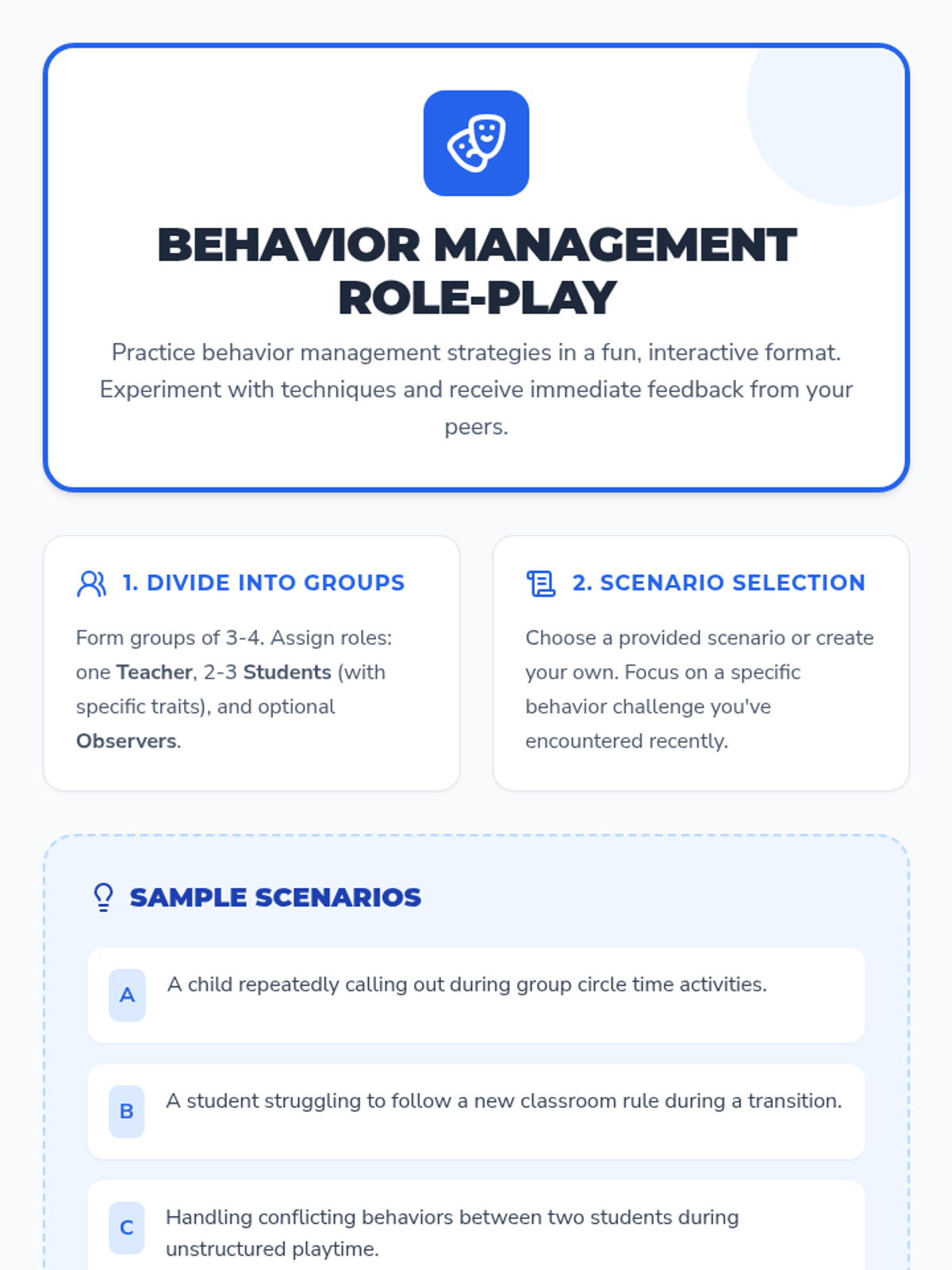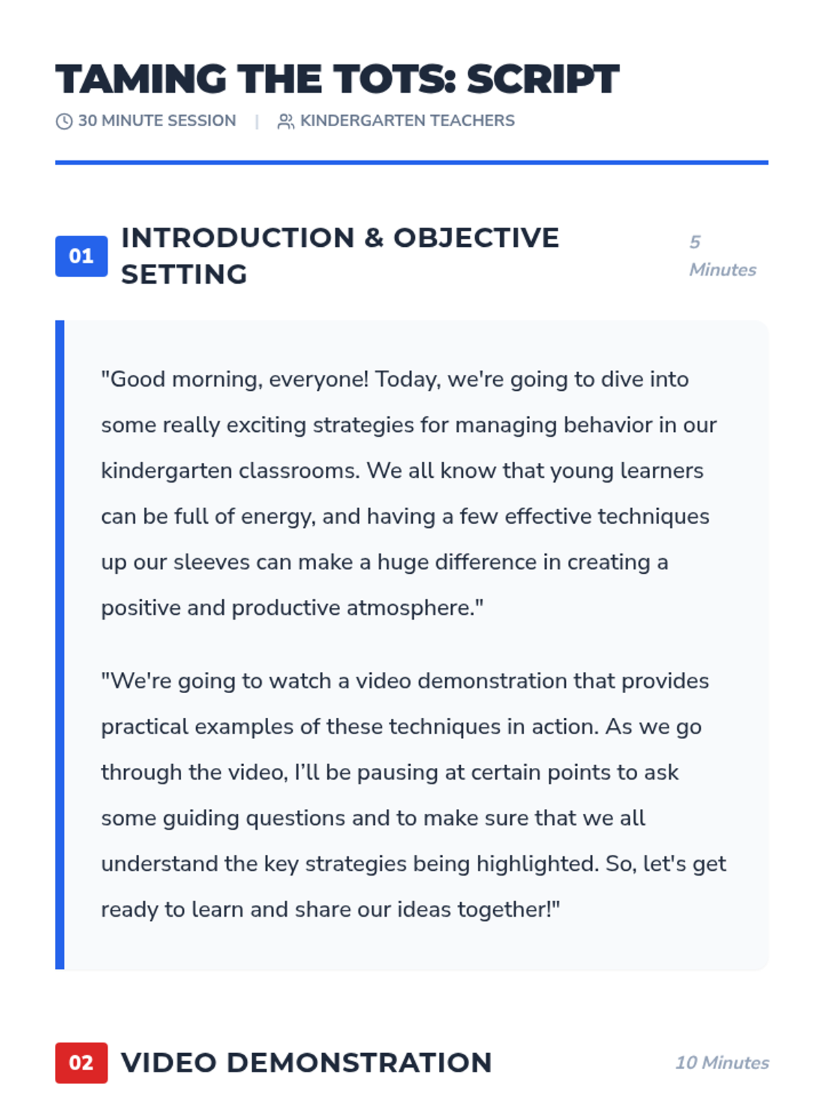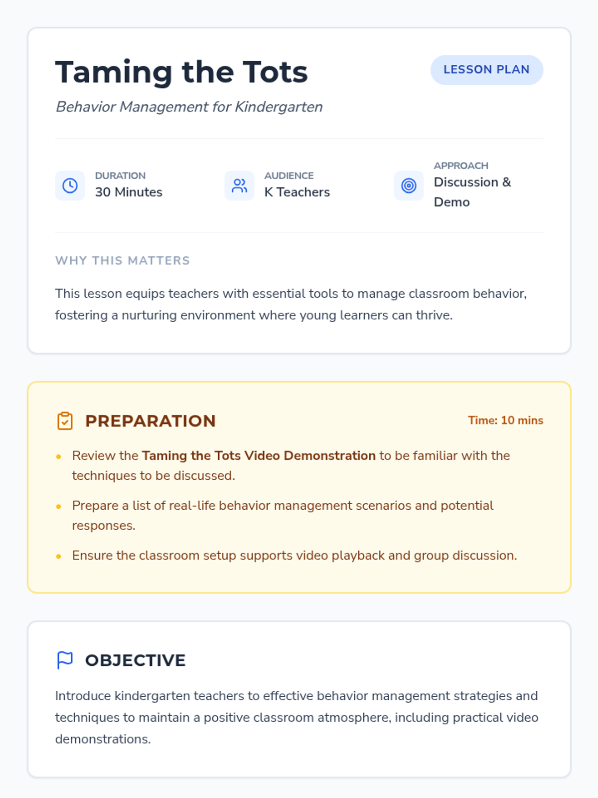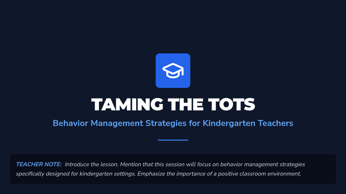 This lesson focuses on behavior management strategies for kindergarten teachers, providing them with tools and techniques to maintain a positive and productive classroom environment. It is designed for a single 30-minute session and includes a video demonstration, discussion, and role-play activity.