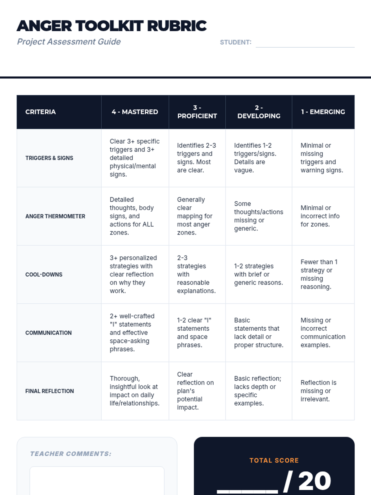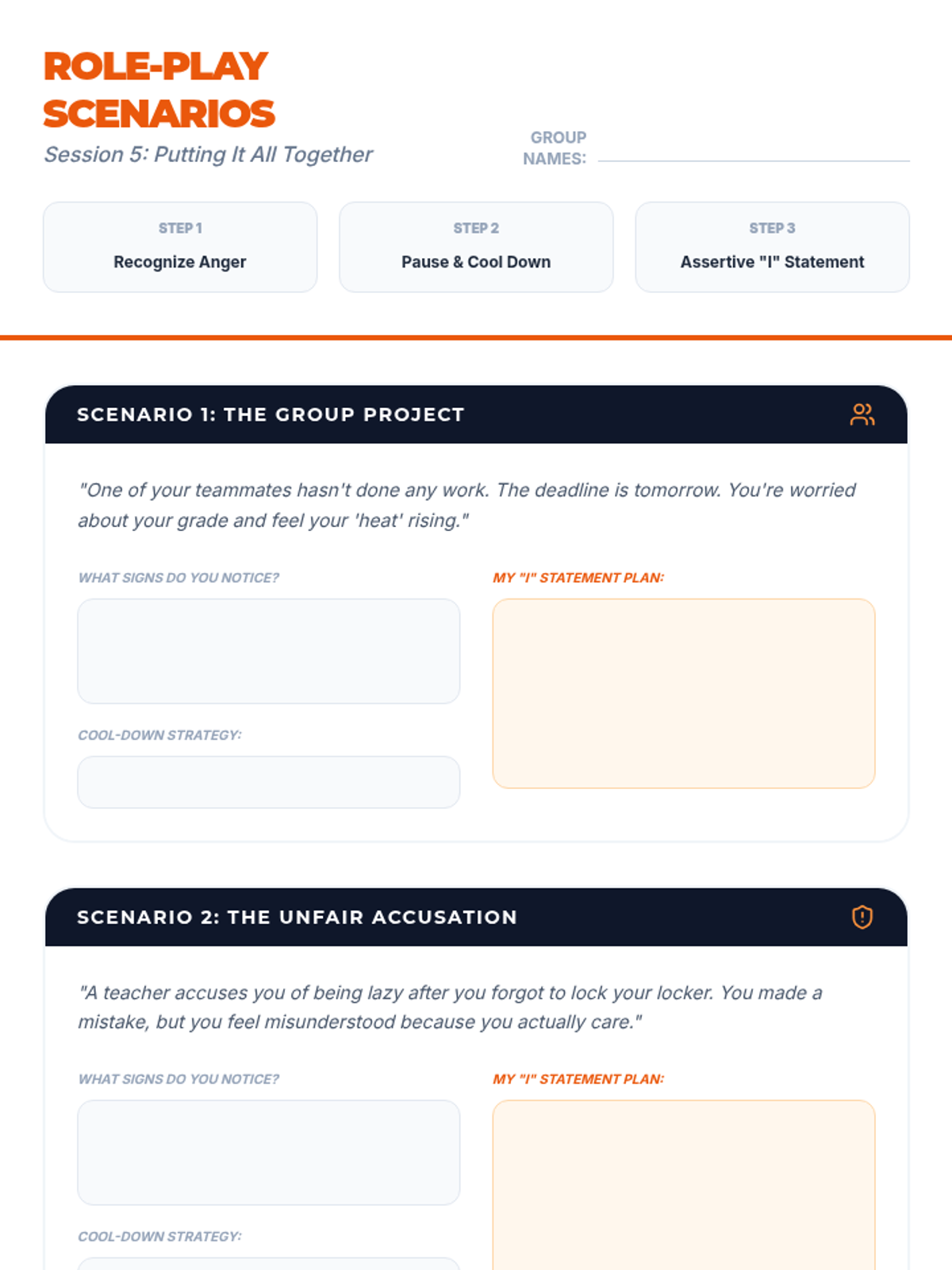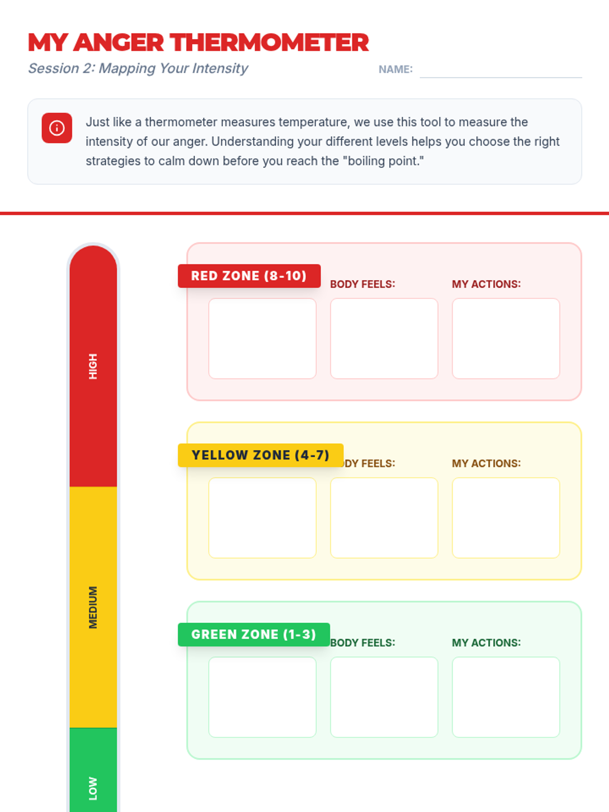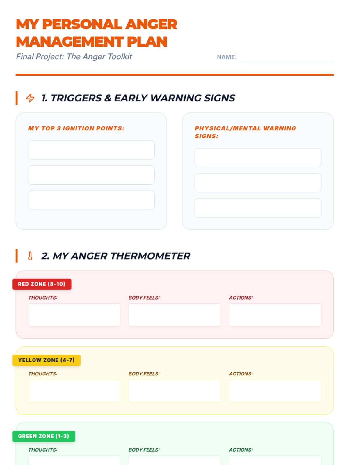 A 6-session small group intervention for 9th graders to identify anger triggers, utilize the anger thermometer, practice cool-down strategies, and develop assertive communication skills through a personalized 'Anger Toolkit' project.