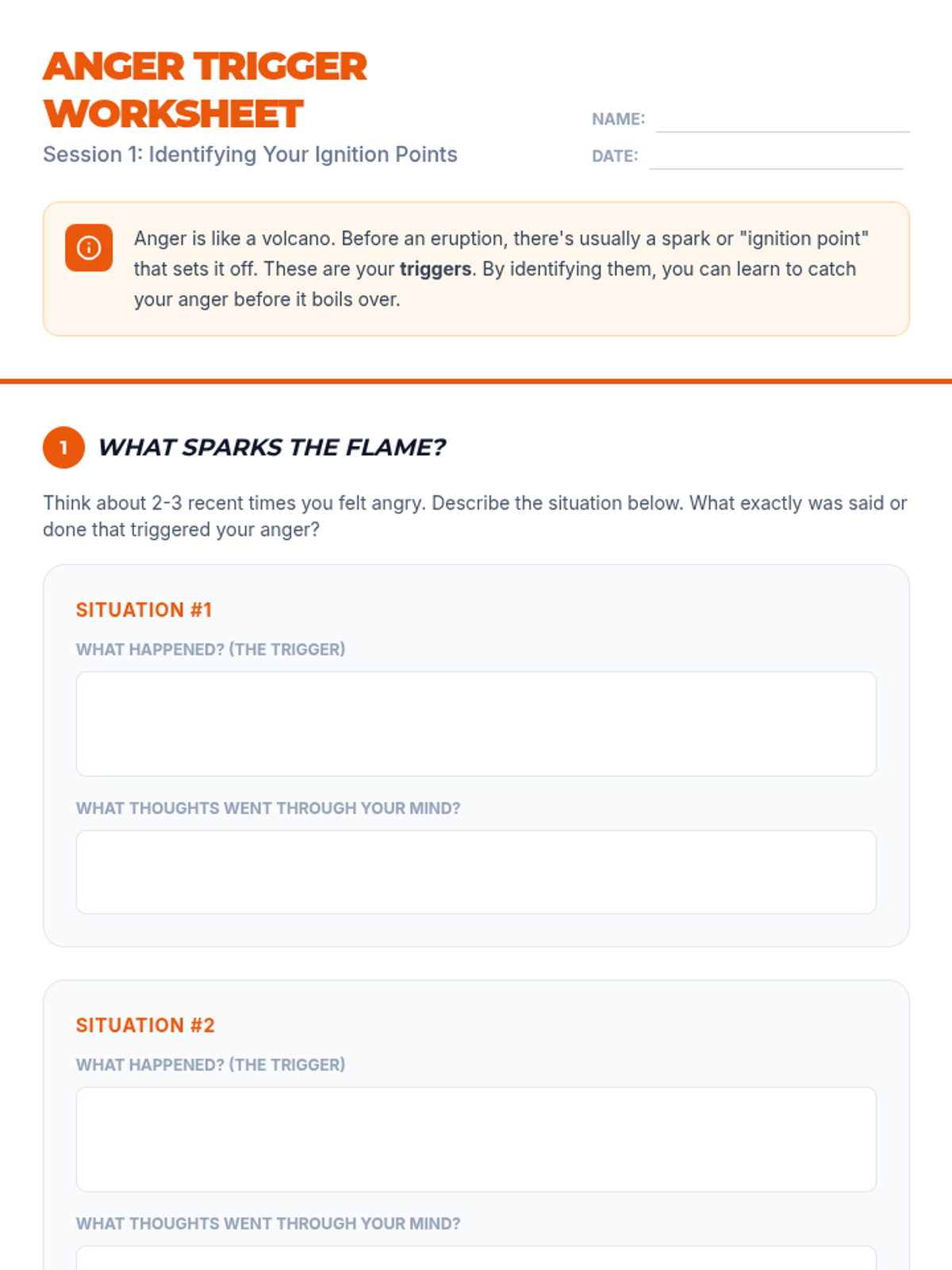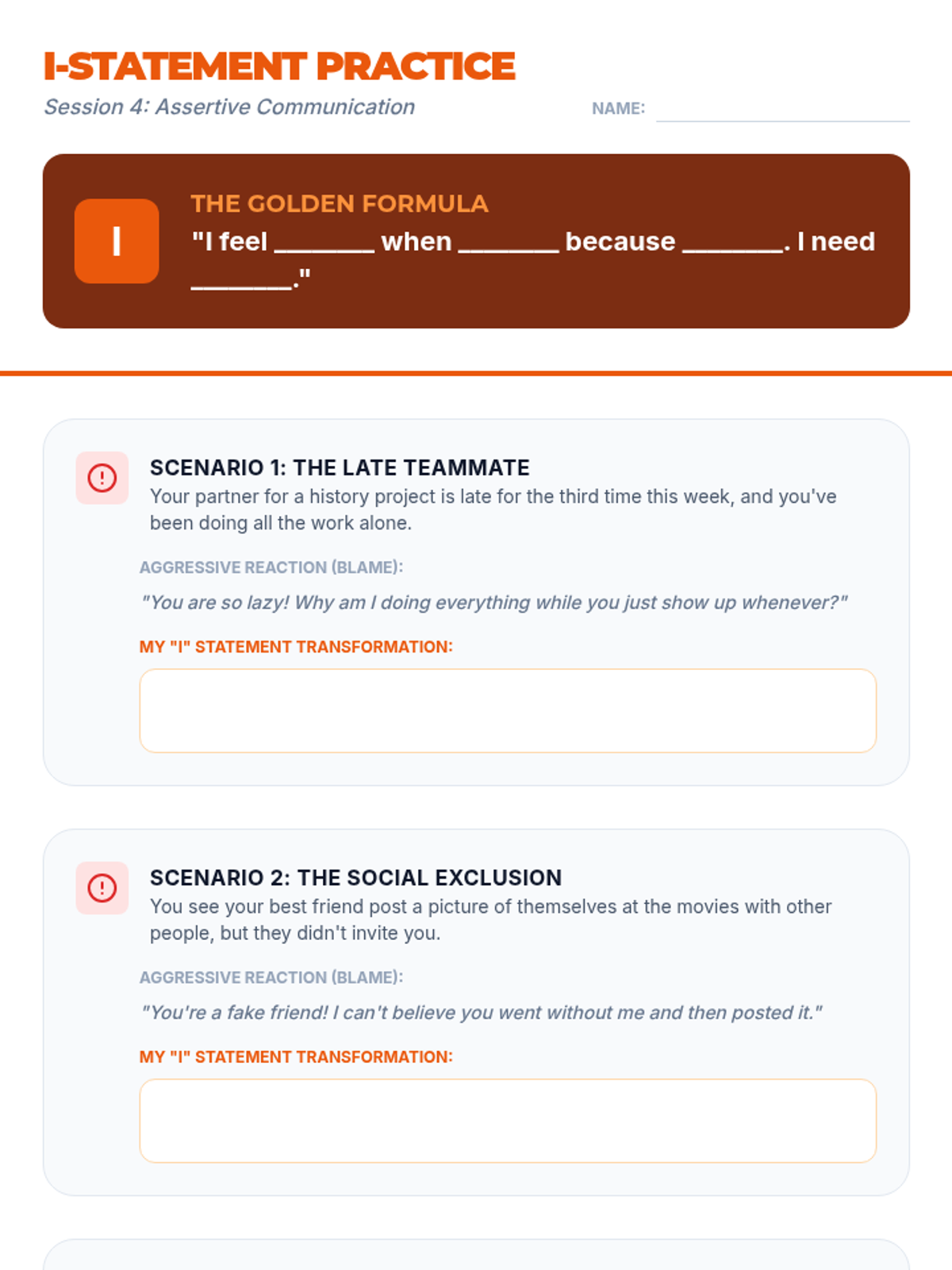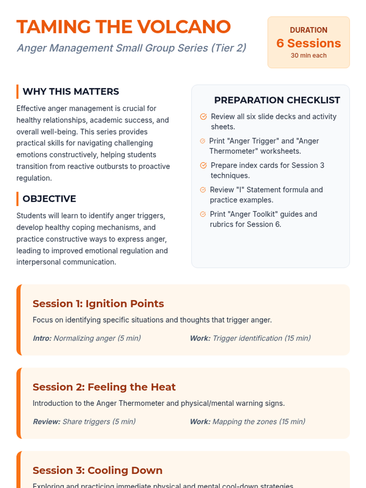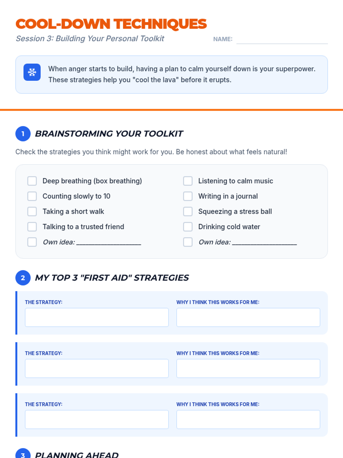 A 6-session small group intervention for 9th graders to identify anger triggers, utilize the anger thermometer, practice cool-down strategies, and develop assertive communication skills through a personalized 'Anger Toolkit' project.