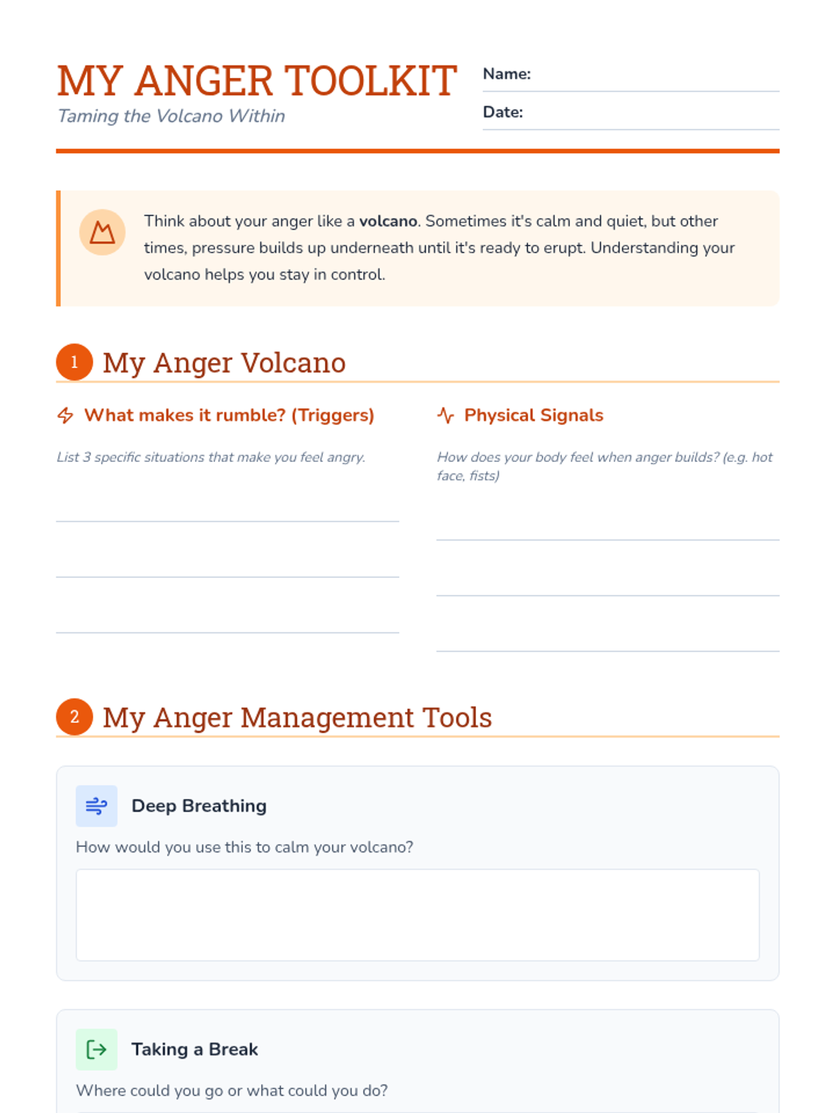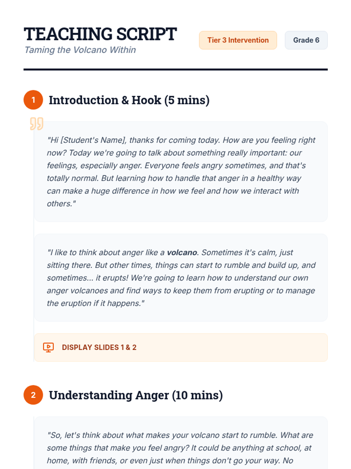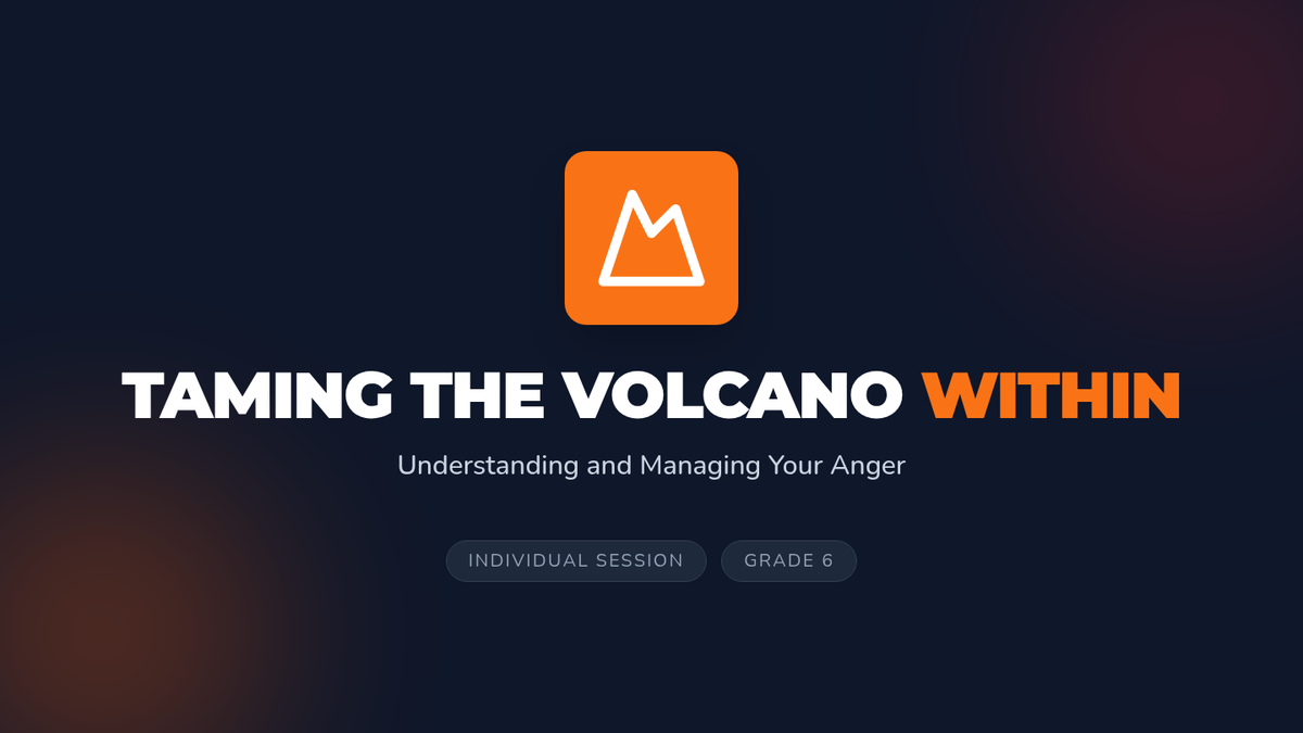 This individual Tier 3 lesson helps 6th-grade students understand and manage anger using the volcano metaphor. Students identify triggers, physical signals, and build a personalized toolkit of coping strategies.