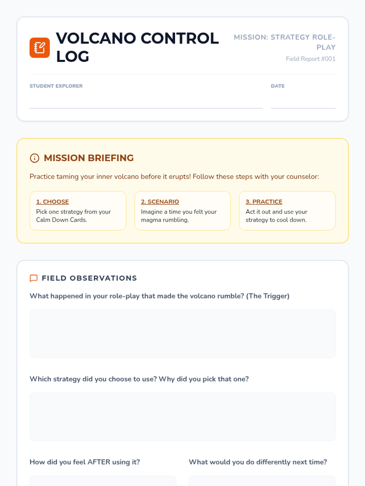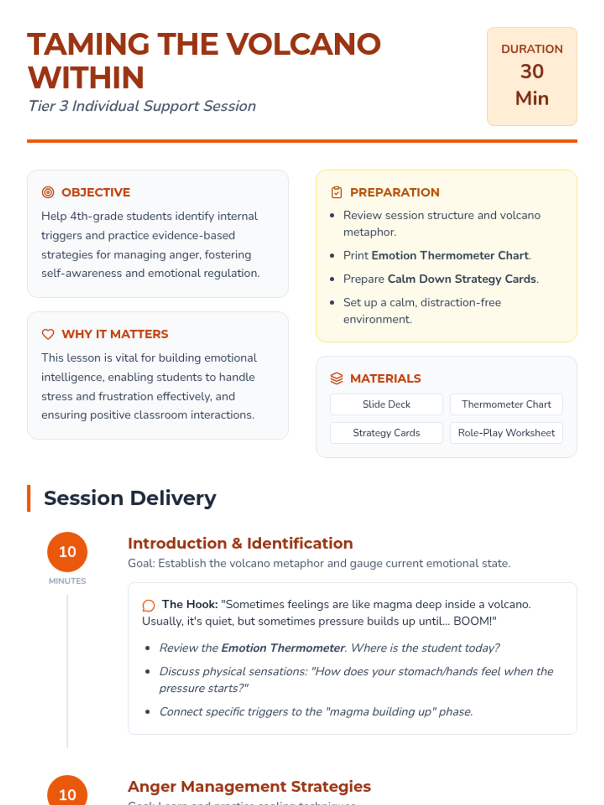 A Tier 3 individual support session for 4th-grade students to master anger management and emotional regulation through the metaphor of a volcano.