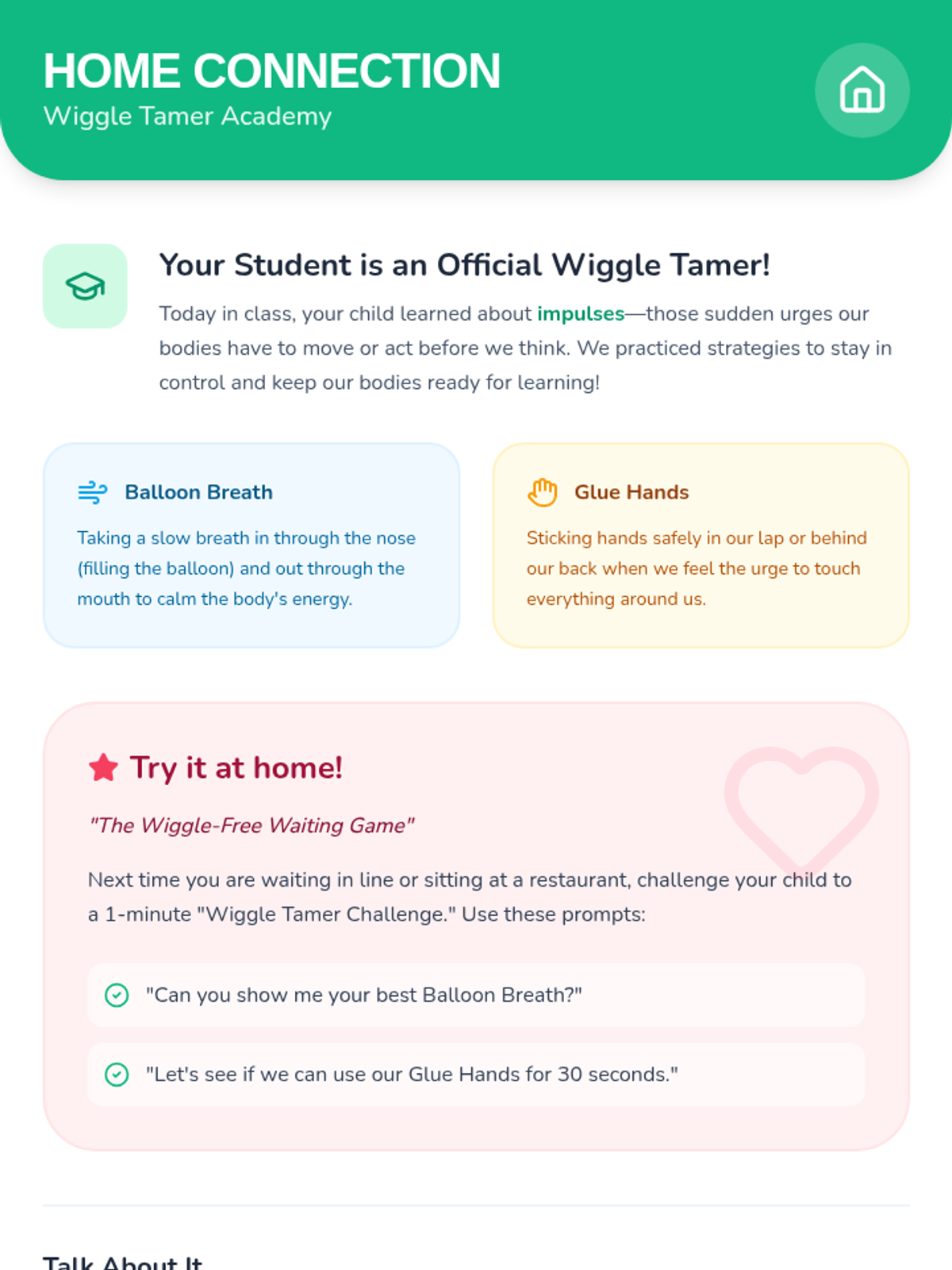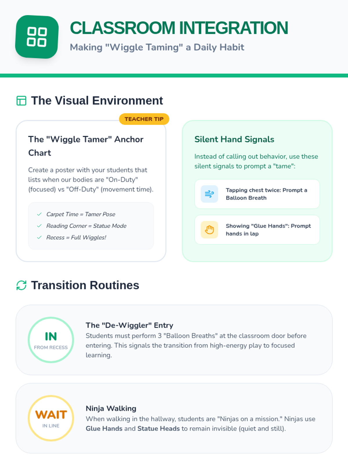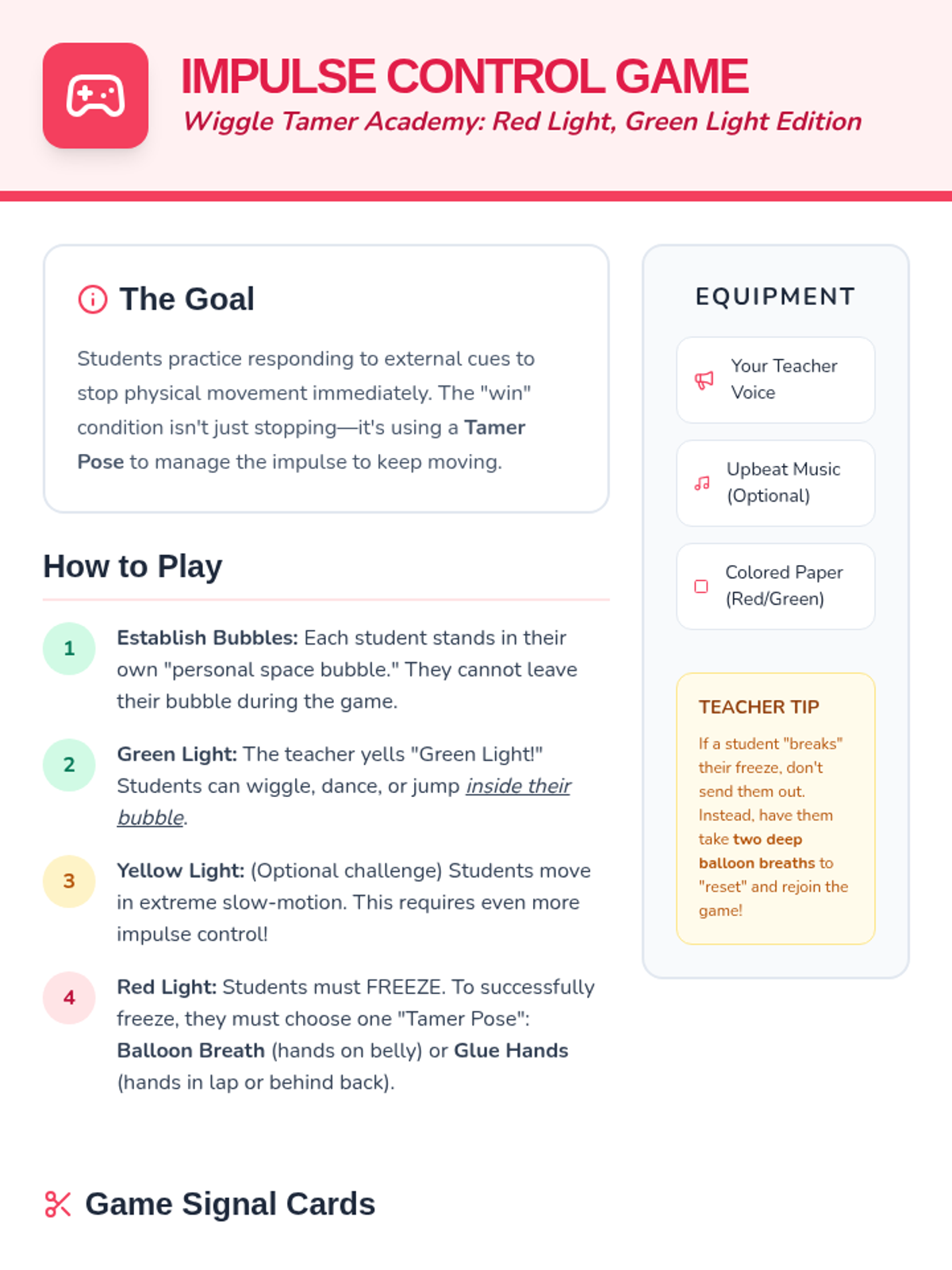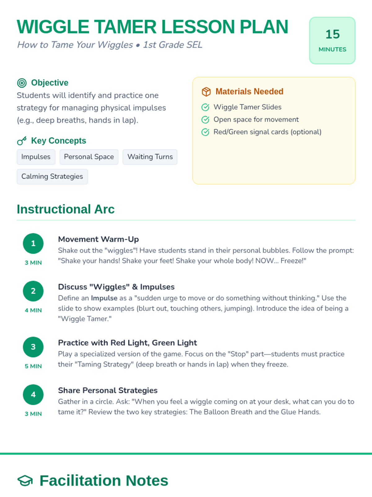 A high-energy 15-minute lesson for 1st graders to learn about managing physical impulses through the concept of 'taming wiggles' using interactive games and calming strategies.