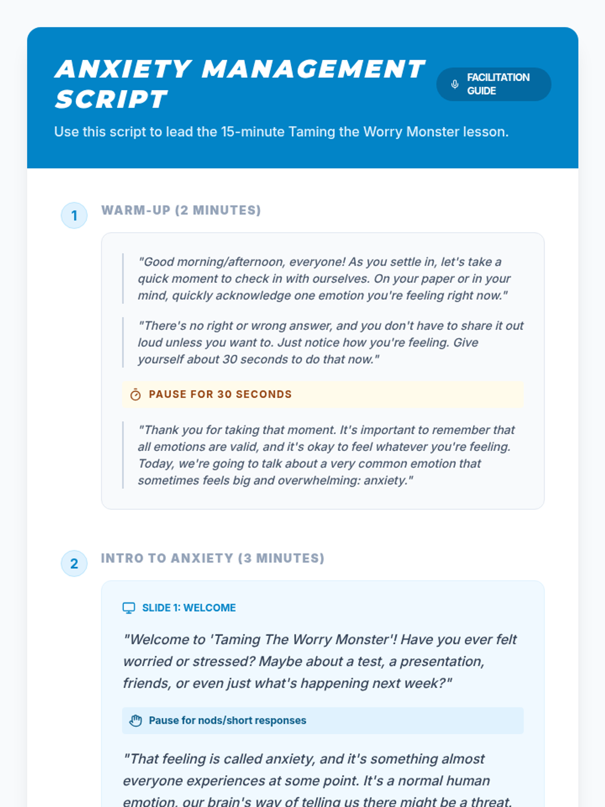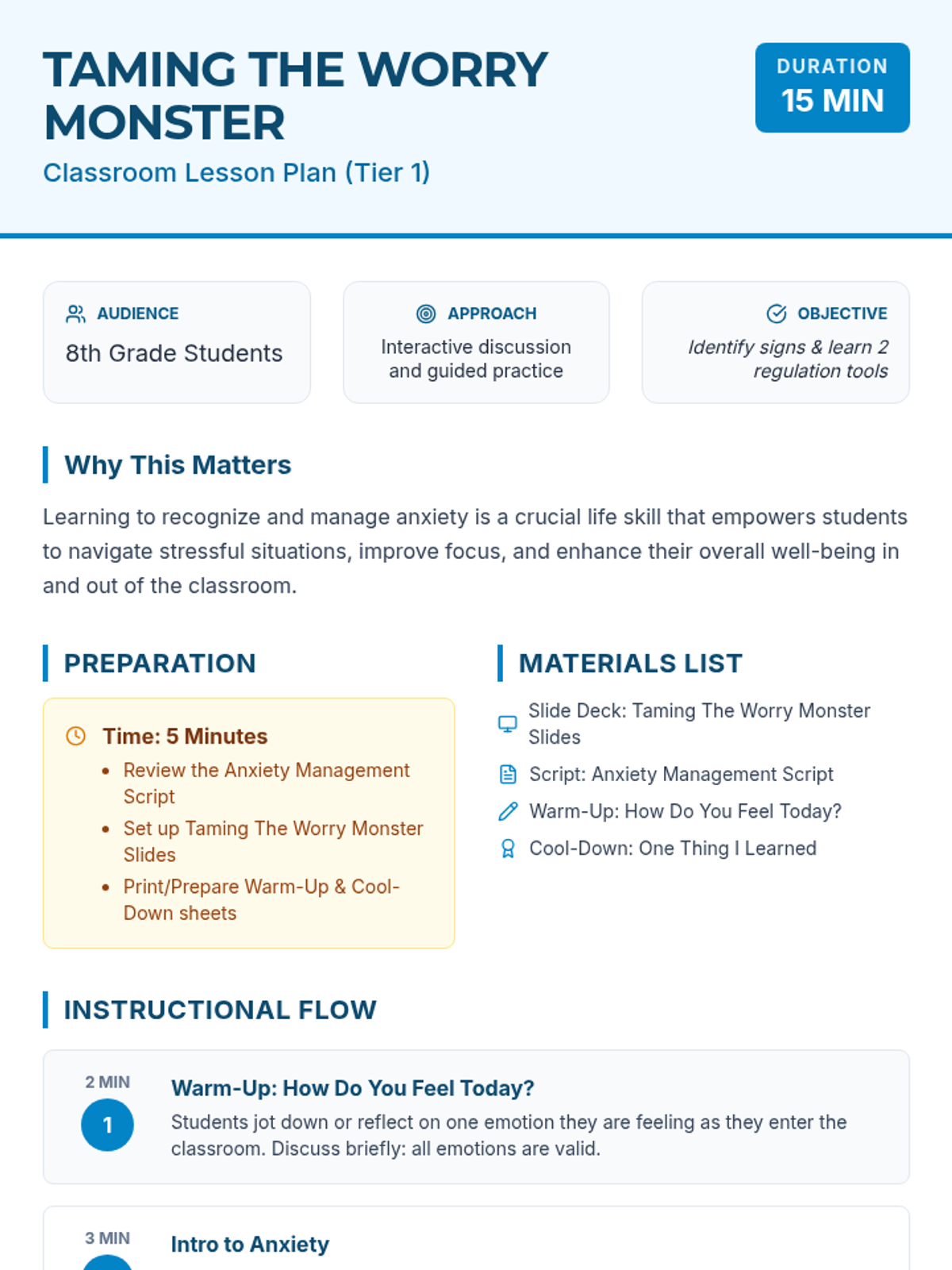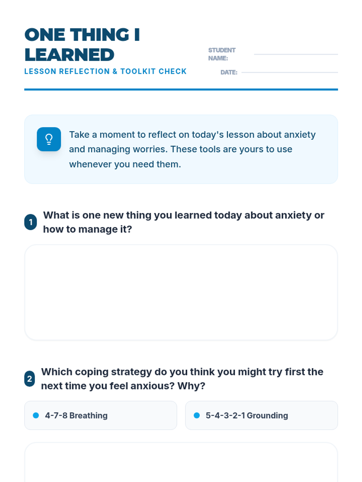 A 15-minute lesson for 8th graders introducing common signs of anxiety and two practical strategies (4-7-8 breathing and 5-4-3-2-1 grounding) for immediate emotional regulation.