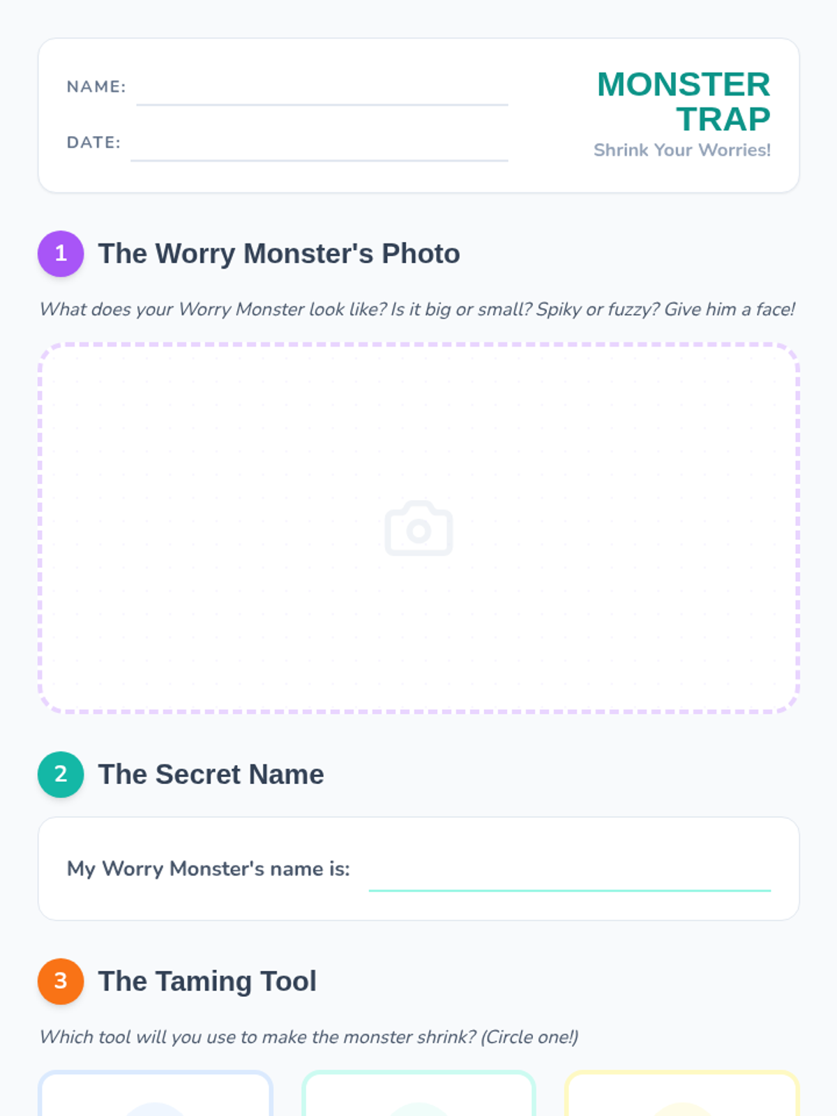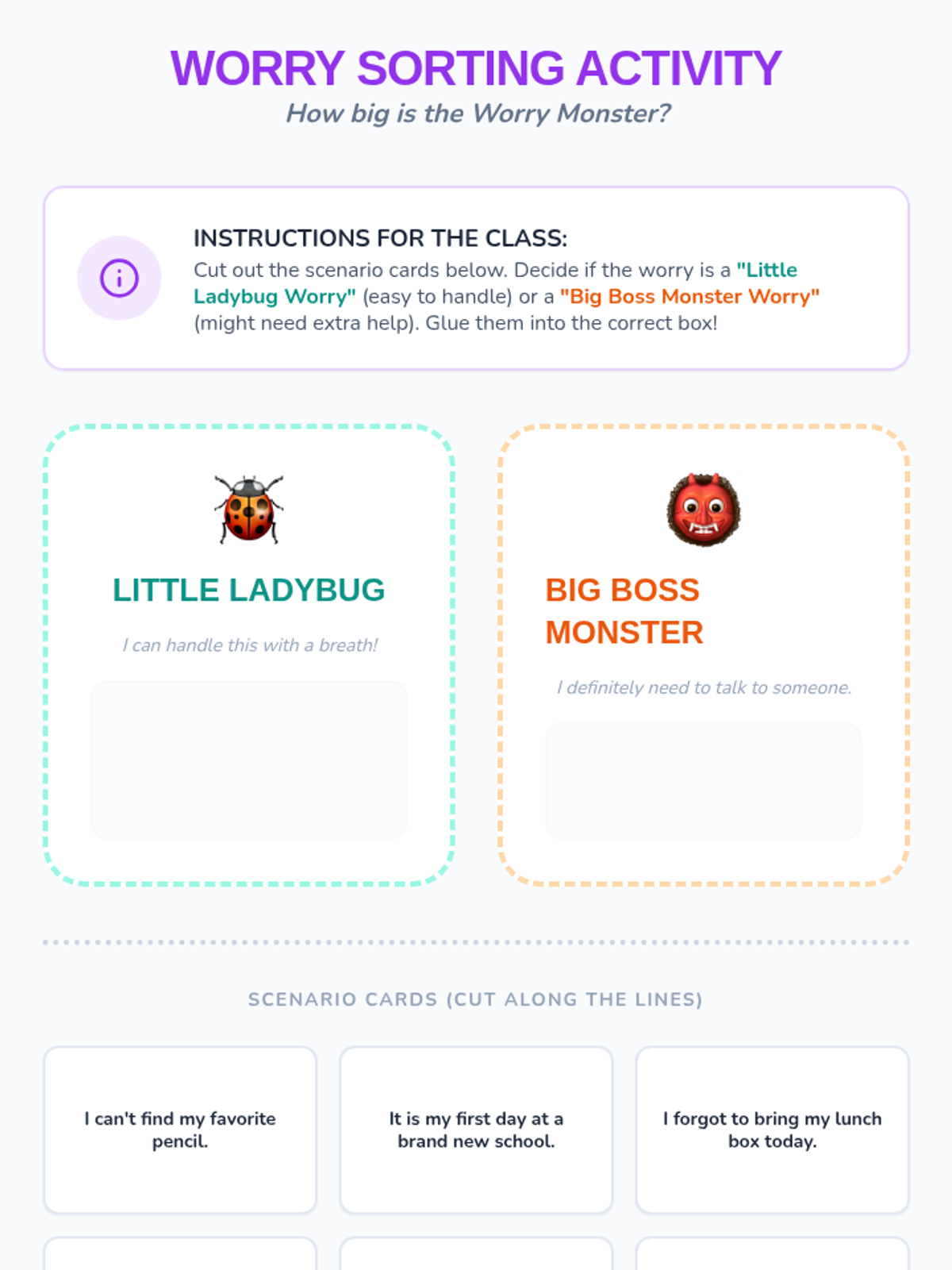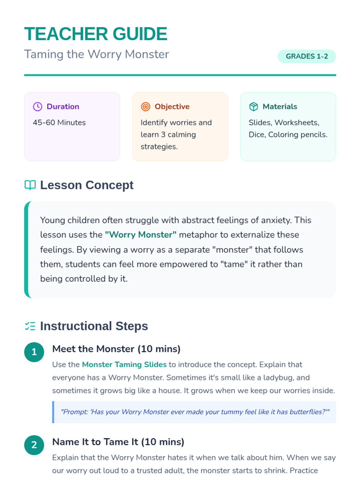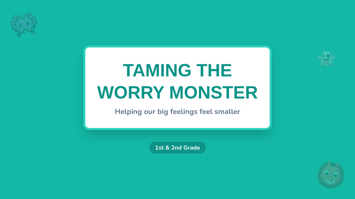 A lesson for 1st and 2nd graders that uses the 'Worry Monster' metaphor to help children externalize, understand, and manage their anxieties through simple coping strategies like deep breathing and sharing feelings.