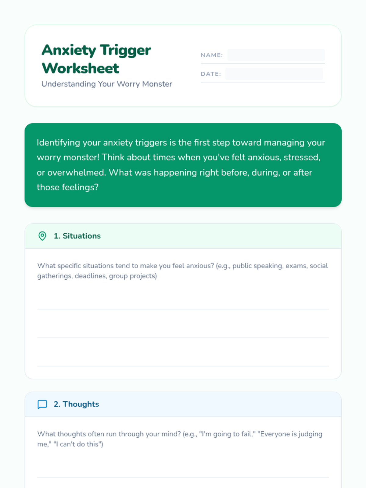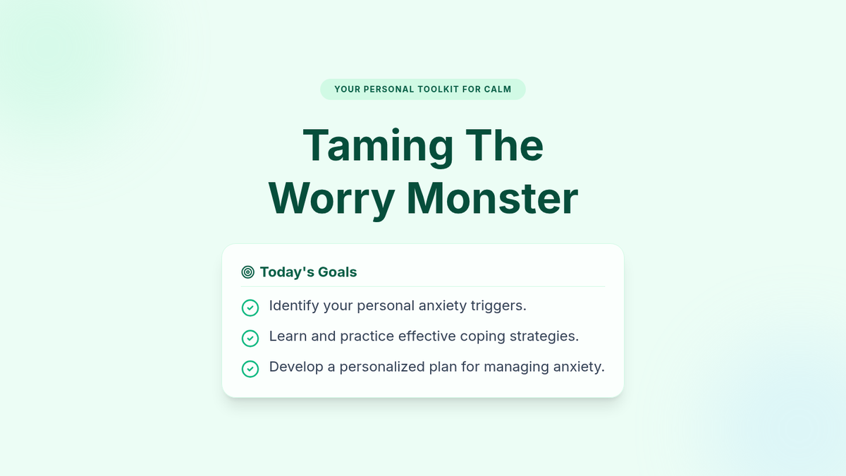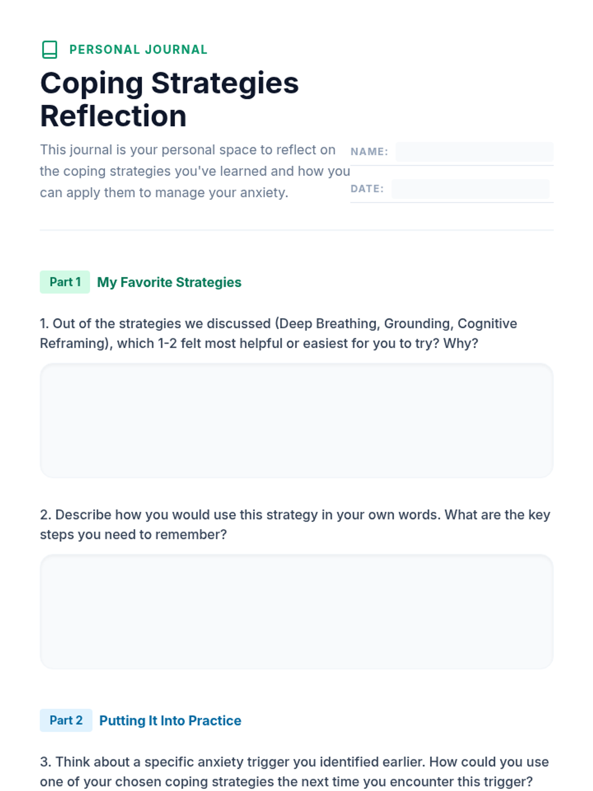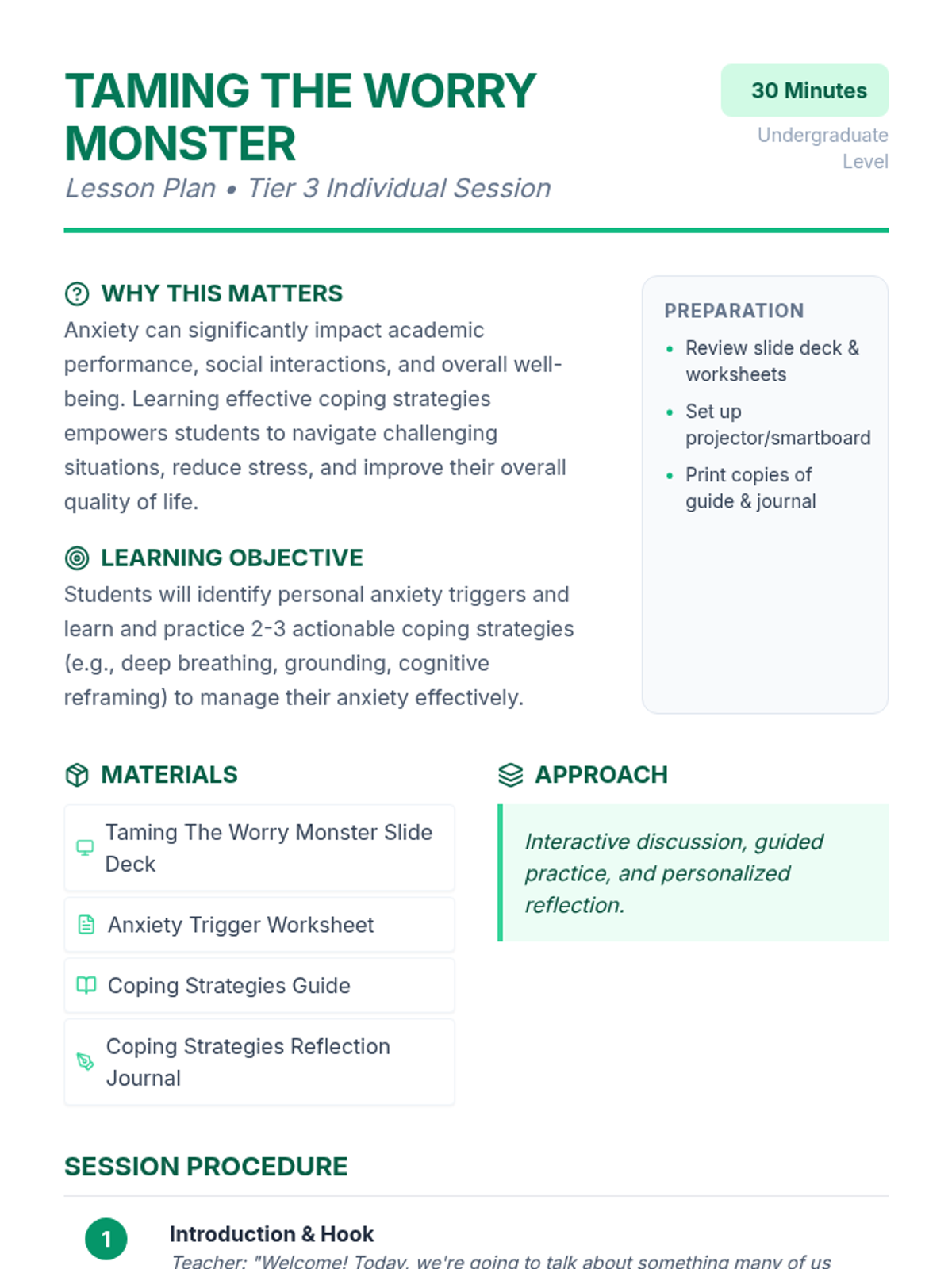 A 30-minute individual Tier 3 session for undergraduate students to identify anxiety triggers and learn practical coping mechanisms like deep breathing and grounding.