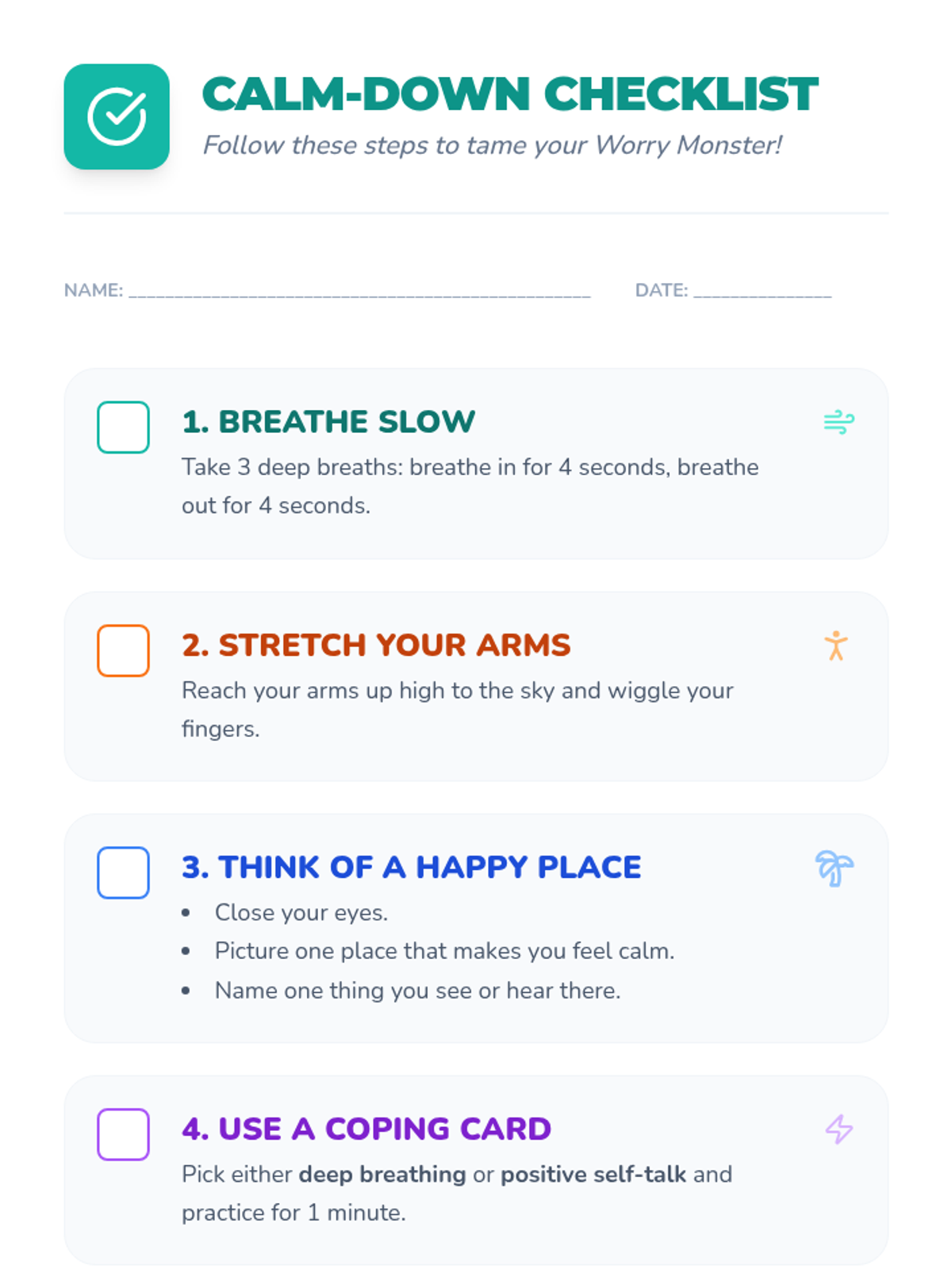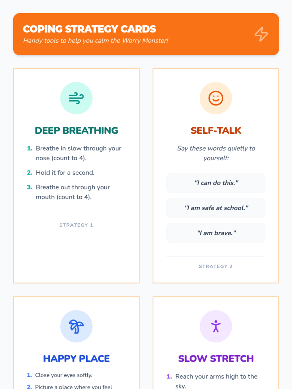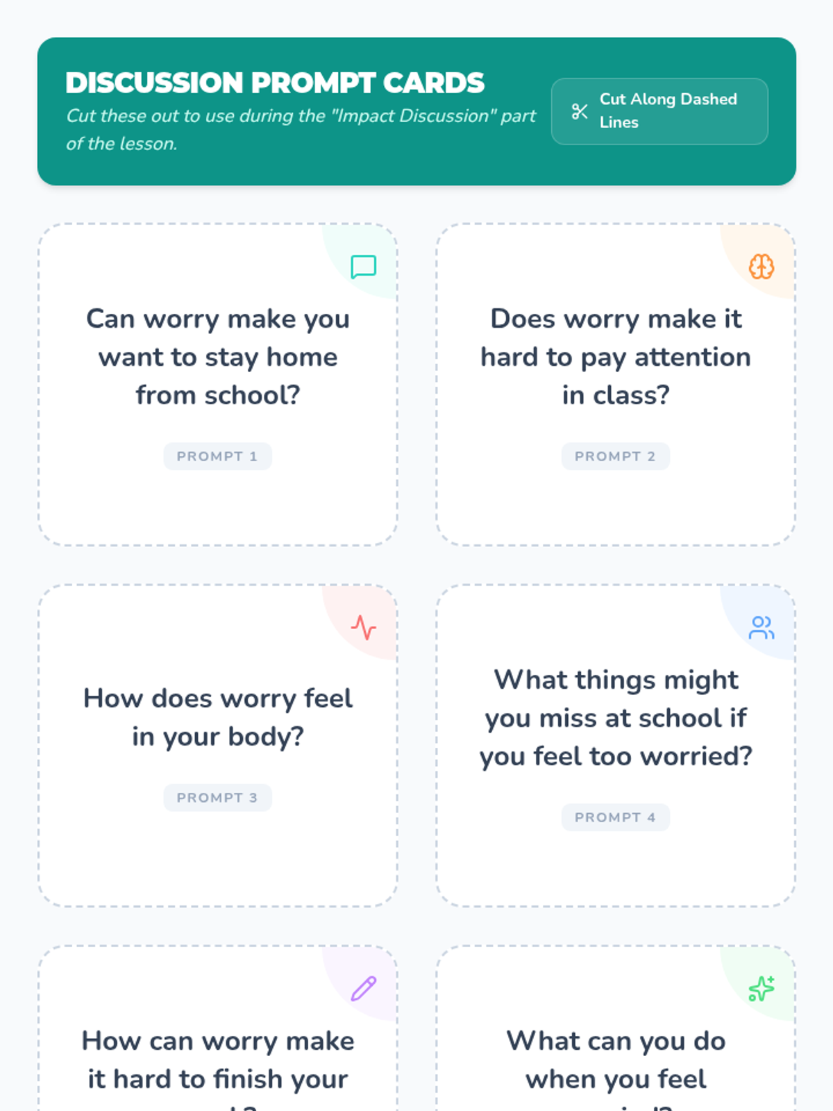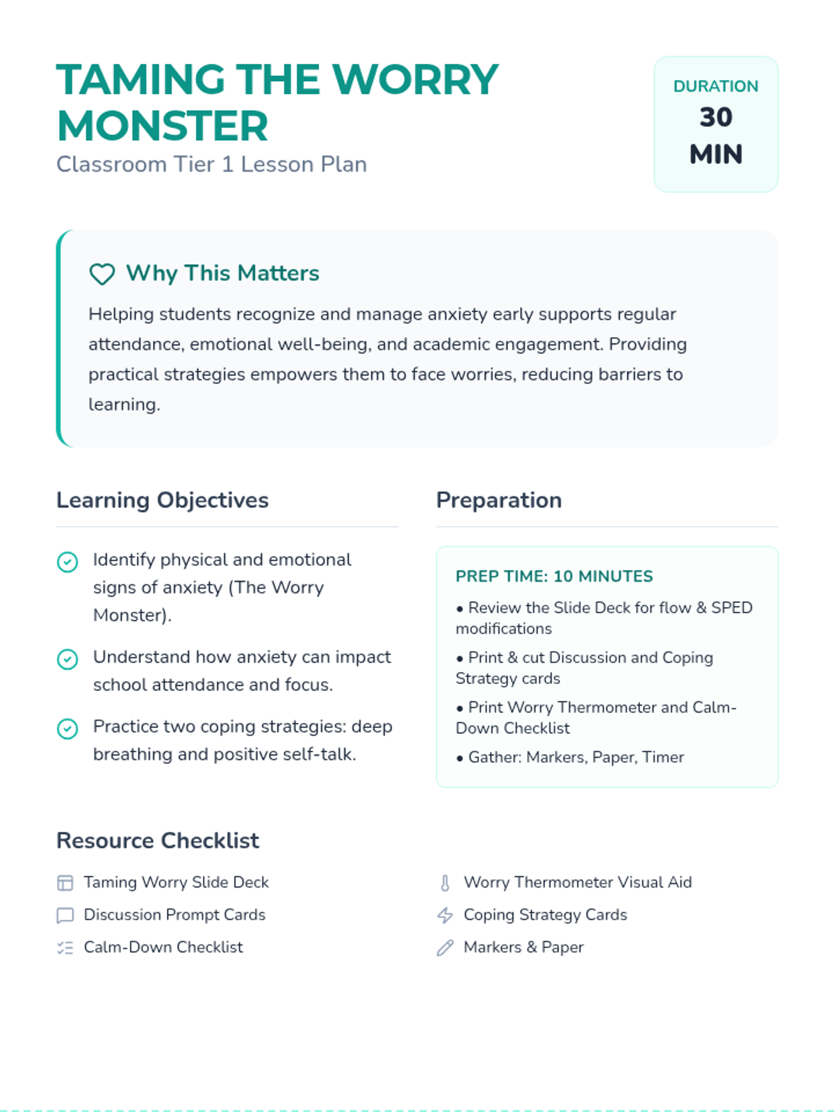 A 30-minute lesson for 4th graders to recognize anxiety, understand its impact on school attendance, and practice coping strategies using 'The Worry Monster' character.