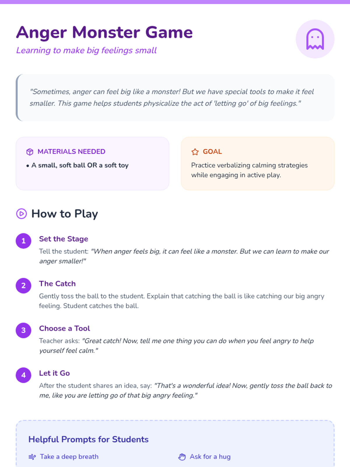A 15-minute individual Tier 3 lesson for Pre-K students to recognize and manage anger using creative expression and interactive play.