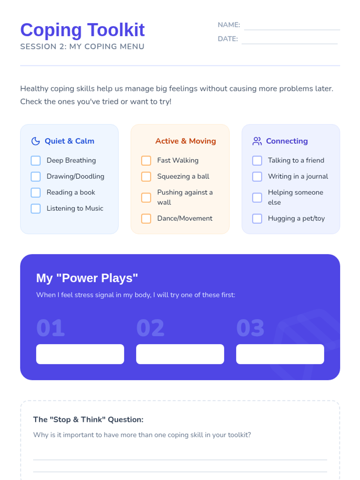 Introduction to healthy coping strategies and the development of a personalized coping skills menu.