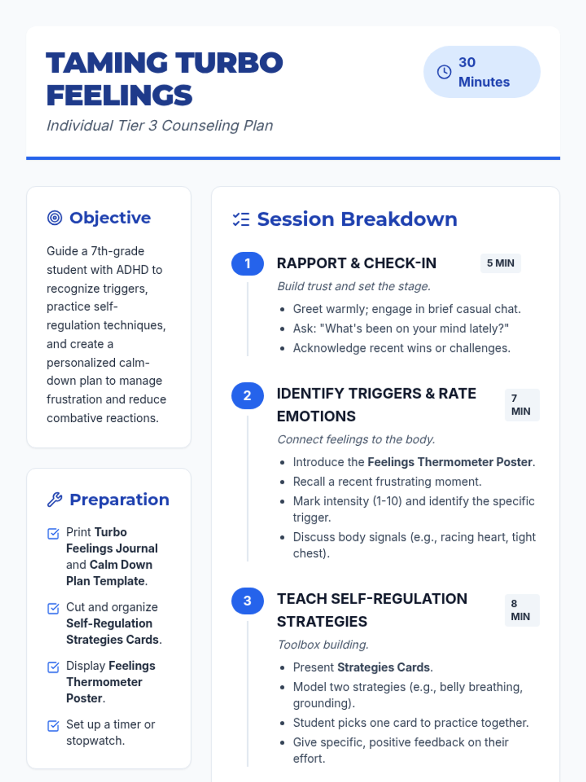 An individual Tier 3 counseling session for a 7th-grade student with ADHD to learn emotional regulation, frustration management, and self-calming strategies.