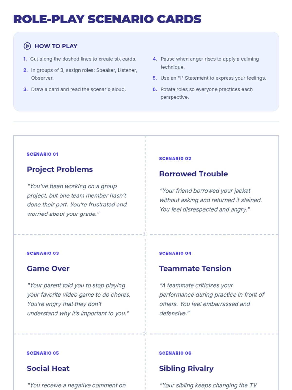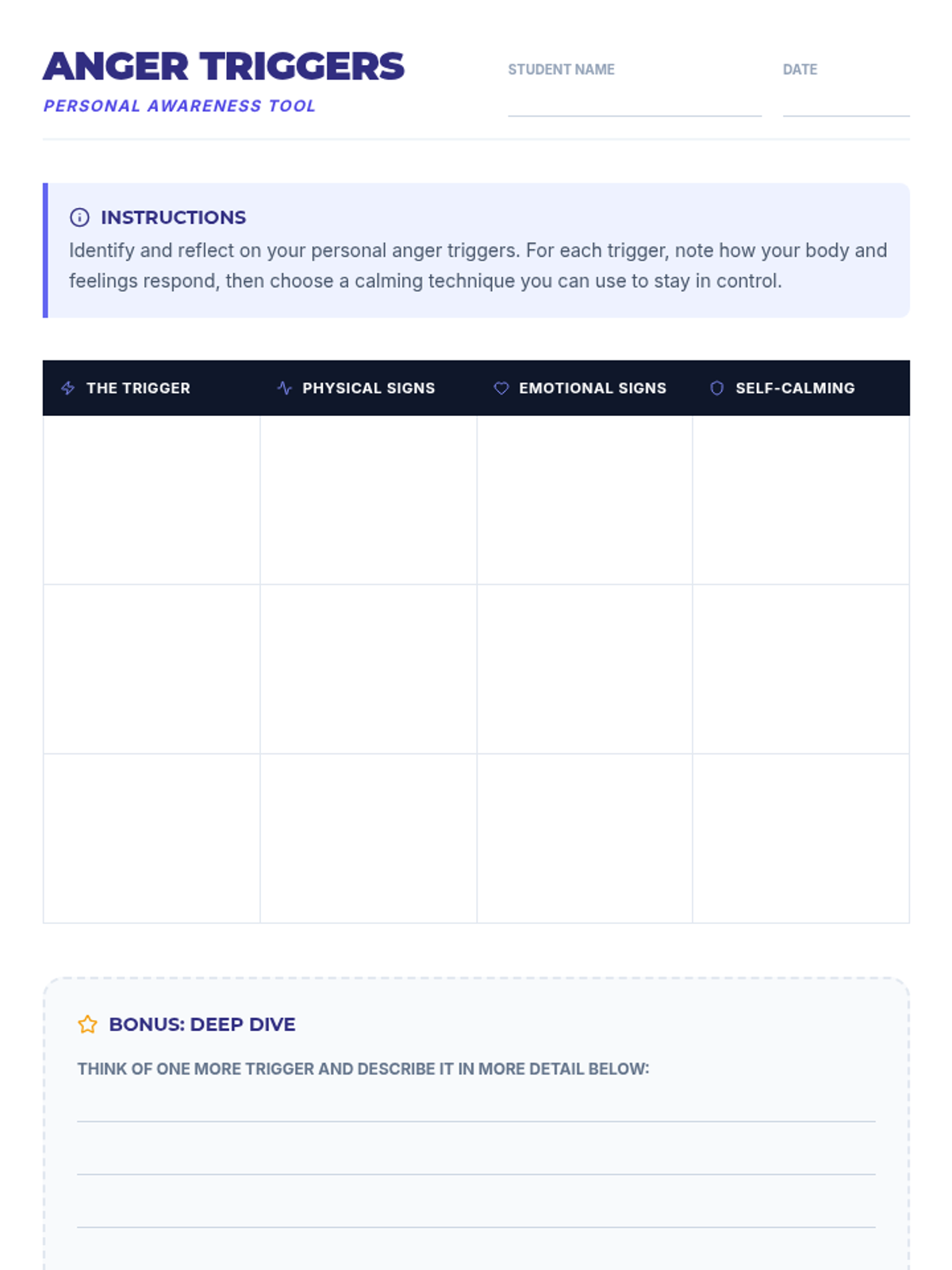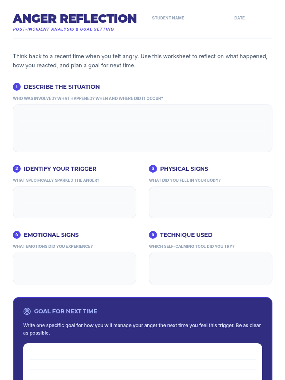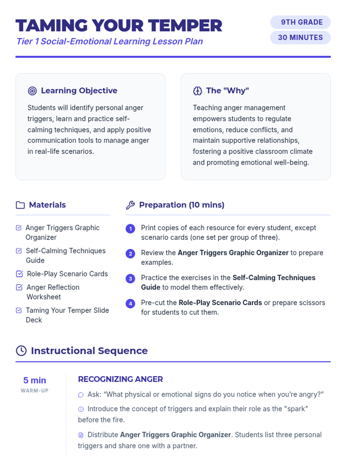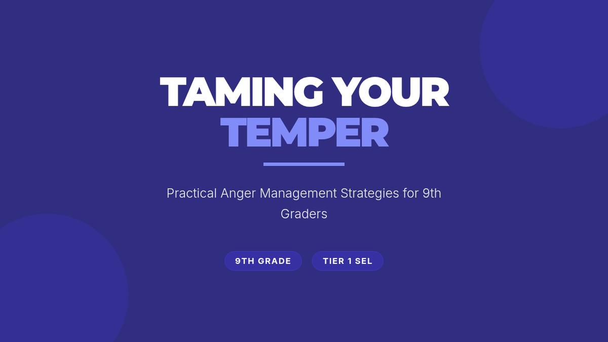 A 30-minute Tier 1 SEL lesson for 9th graders focused on identifying anger triggers, practicing self-calming techniques, and using 'I' statements to manage emotions effectively.