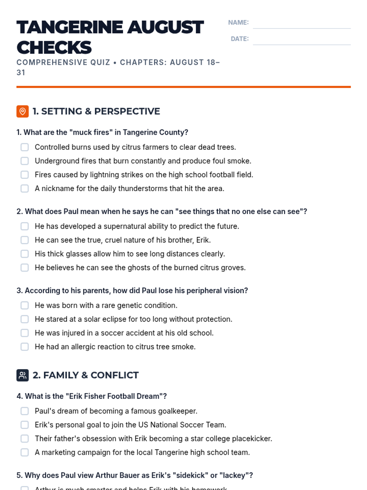 This lesson covers the opening 'August' chapters of the novel Tangerine, focusing on character introduction, setting, and early plot development including the move to Florida and the Erik Fisher Football Dream.