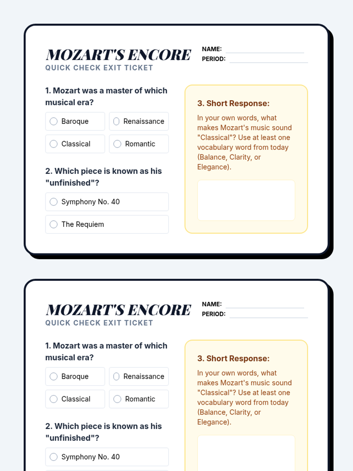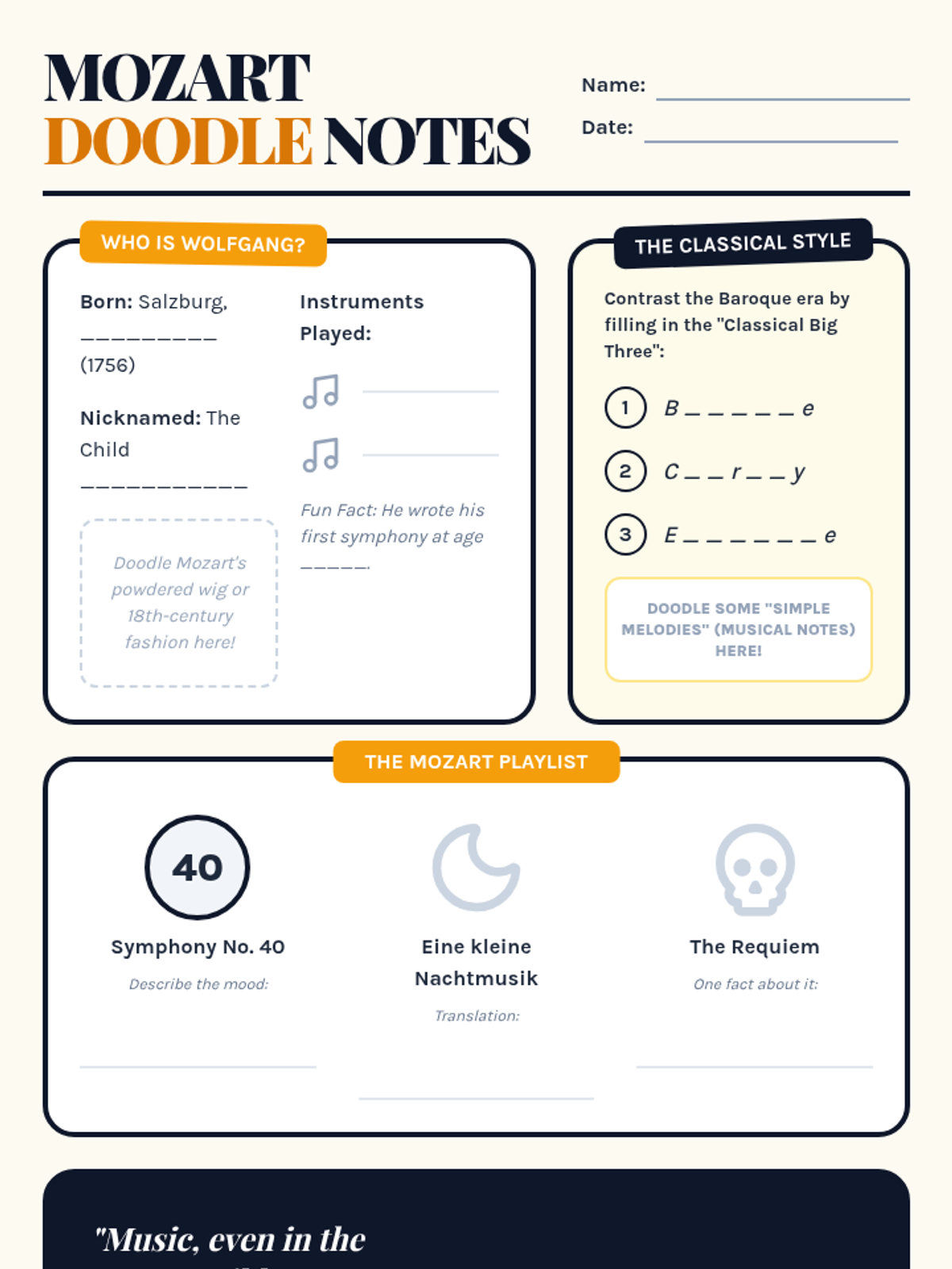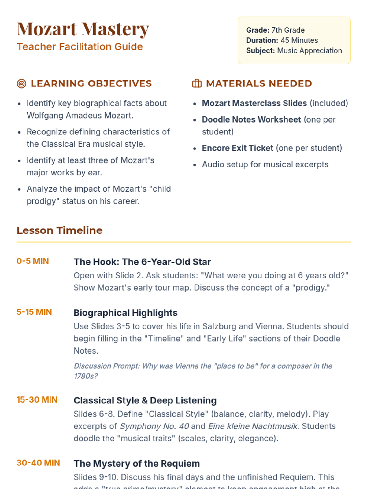 A comprehensive lesson exploring the life, music, and legacy of Wolfgang Amadeus Mozart, designed for a 45-minute middle school music appreciation class. Students will engage with a visual presentation, interactive doodle notes, and a concluding exit ticket.