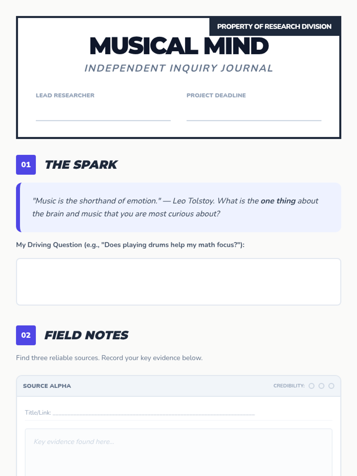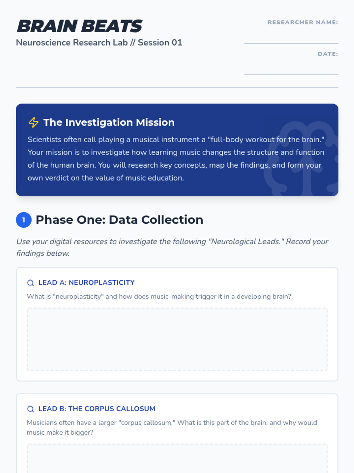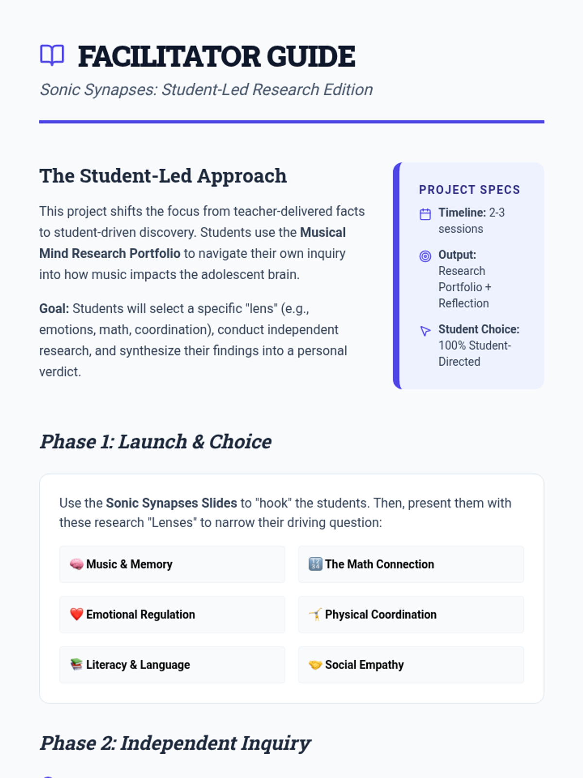 A student-led inquiry project exploring the intersection of music and neuroscience. Students choose their own research path to discover how musical training transforms cognitive development and present their unique findings.