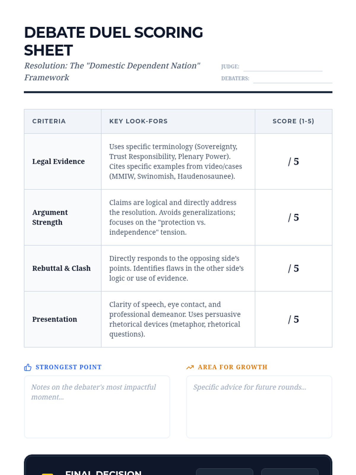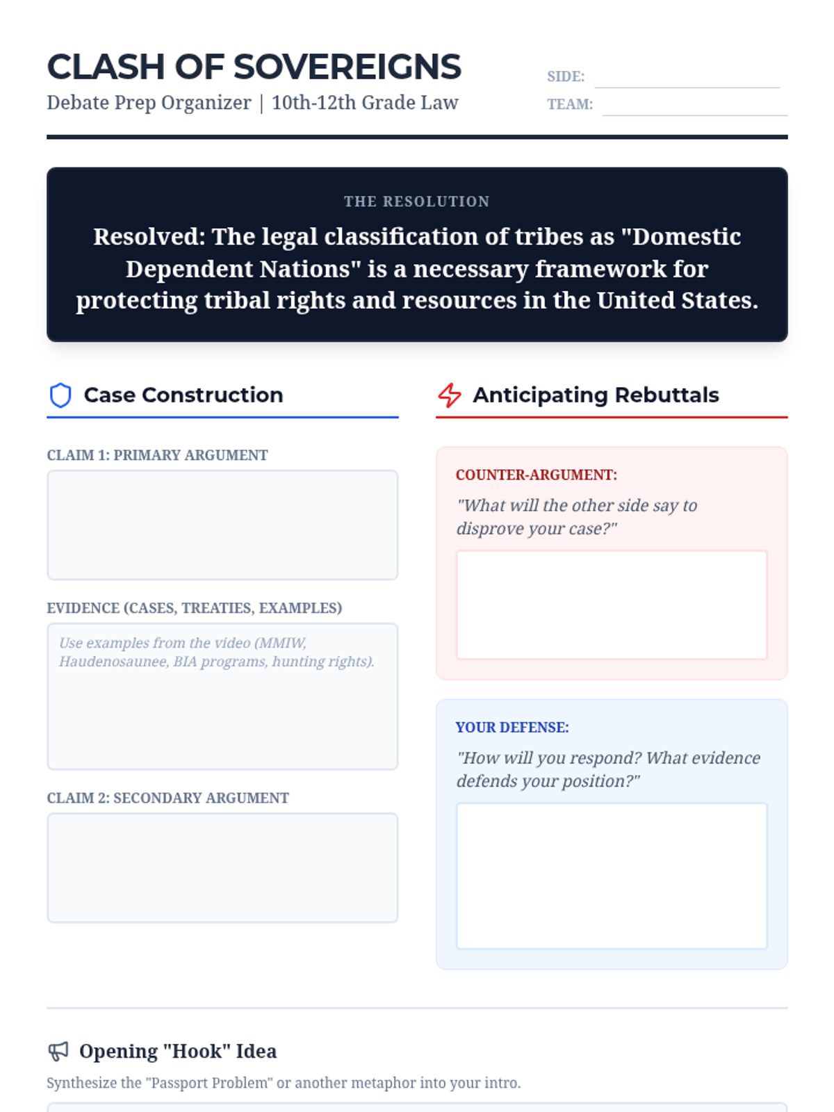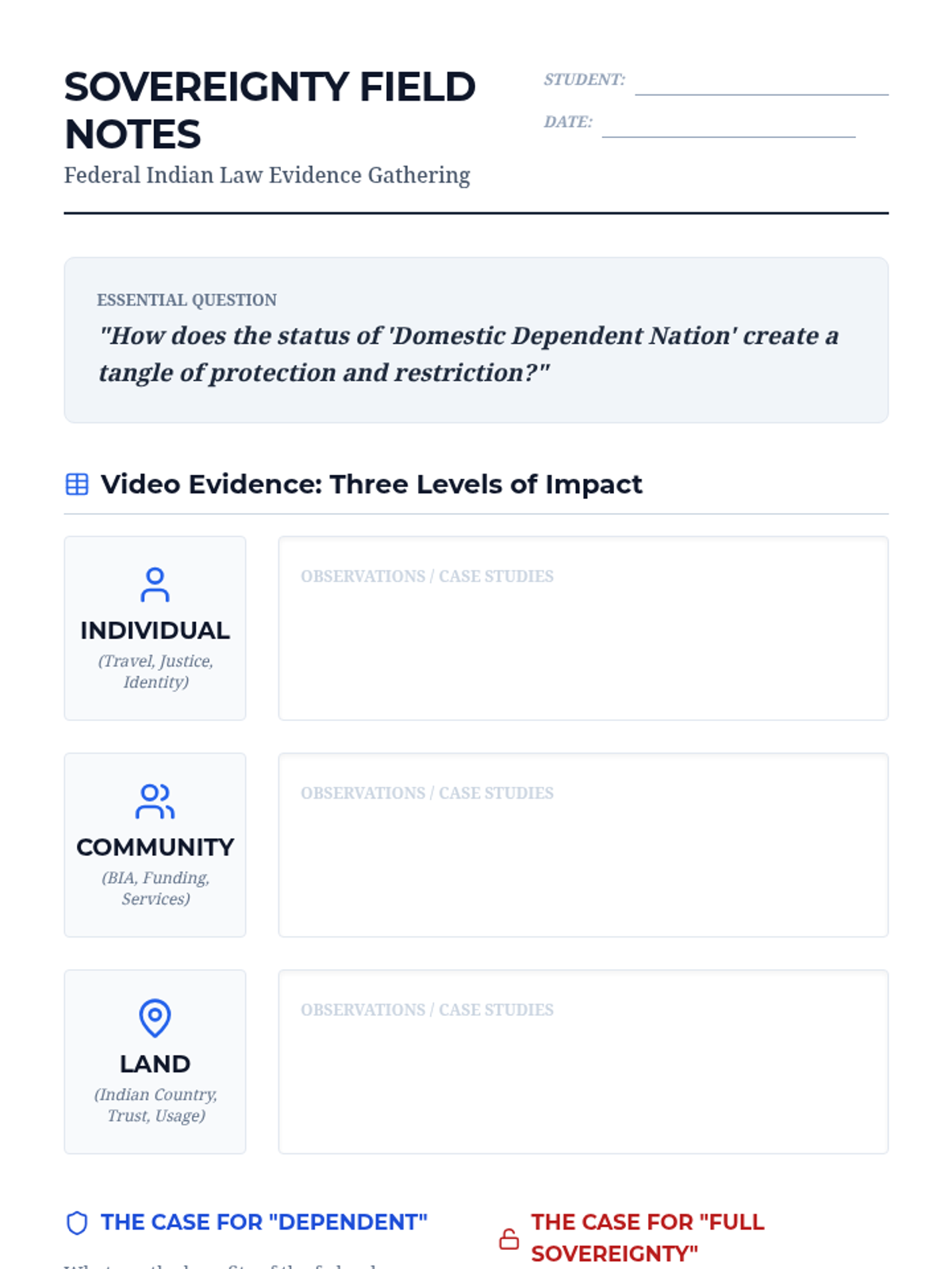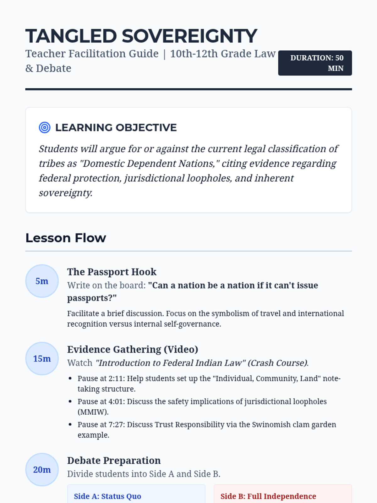 A high-stakes debate lesson for 10th-12th grade Law and Debate students exploring the 'Domestic Dependent Nation' status of Indigenous tribes. Students analyze the tension between federal protection and tribal sovereignty using the Haudenosaunee passport case and MMIW jurisdictional issues as evidence.