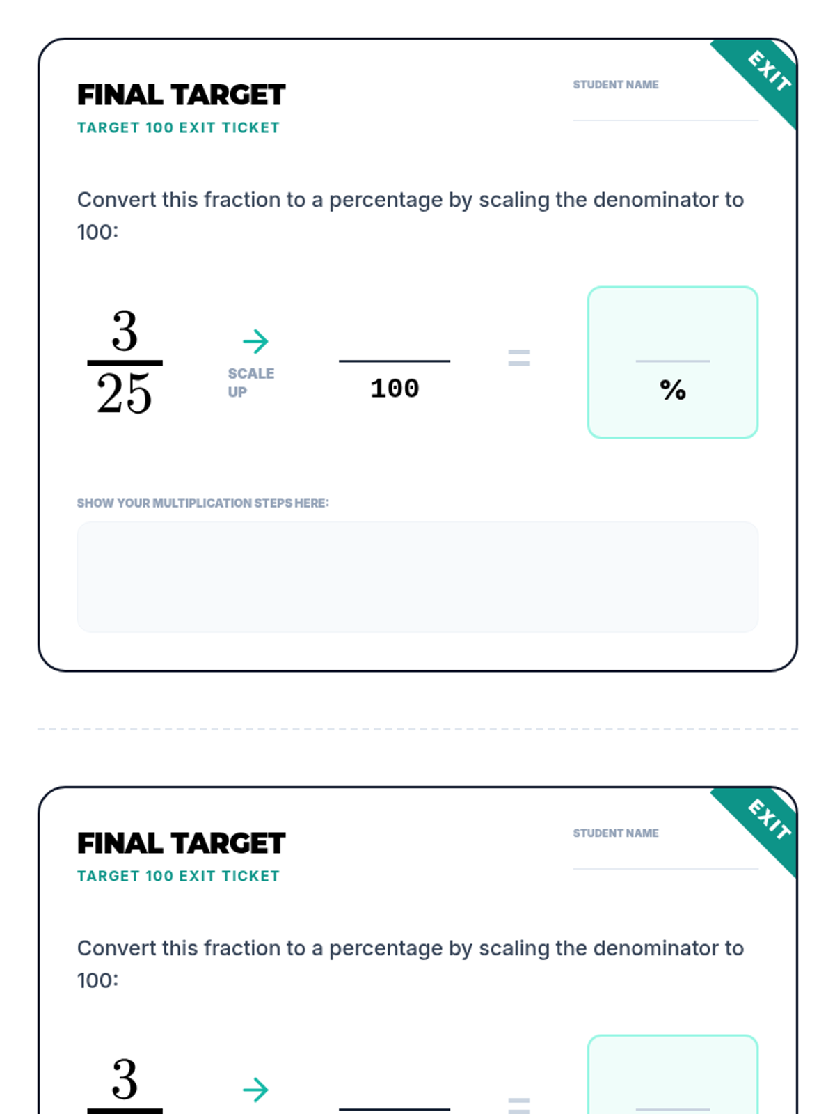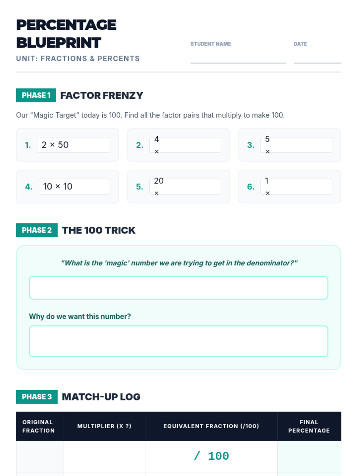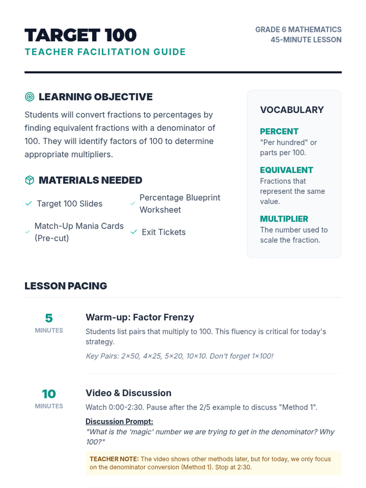 Students will learn to convert fractions to percentages by scaling denominators to 100 using equivalent fractions. This lesson focuses on factors of 100 and visualizes the relationship between parts and the whole 'percent' (per 100).