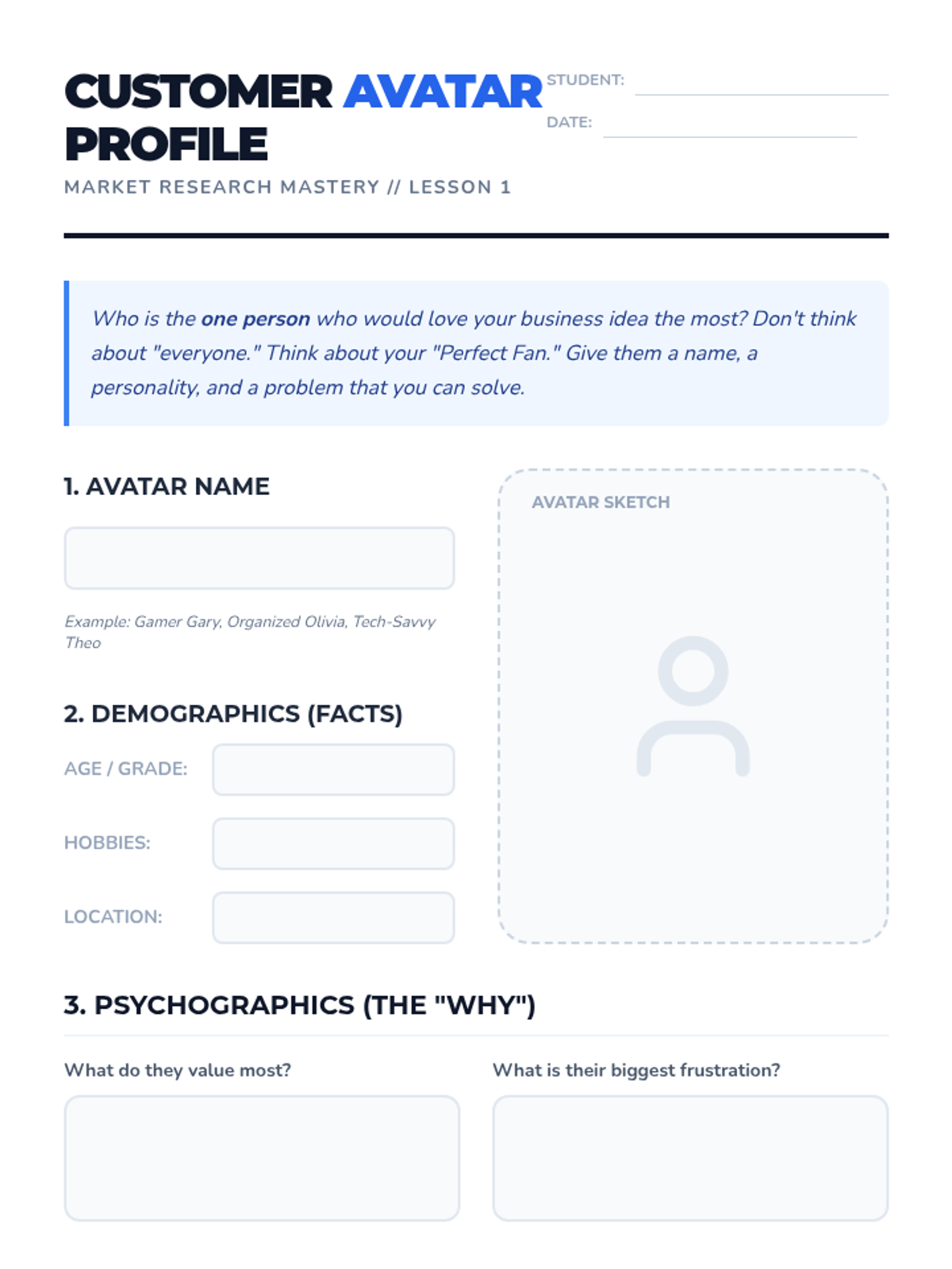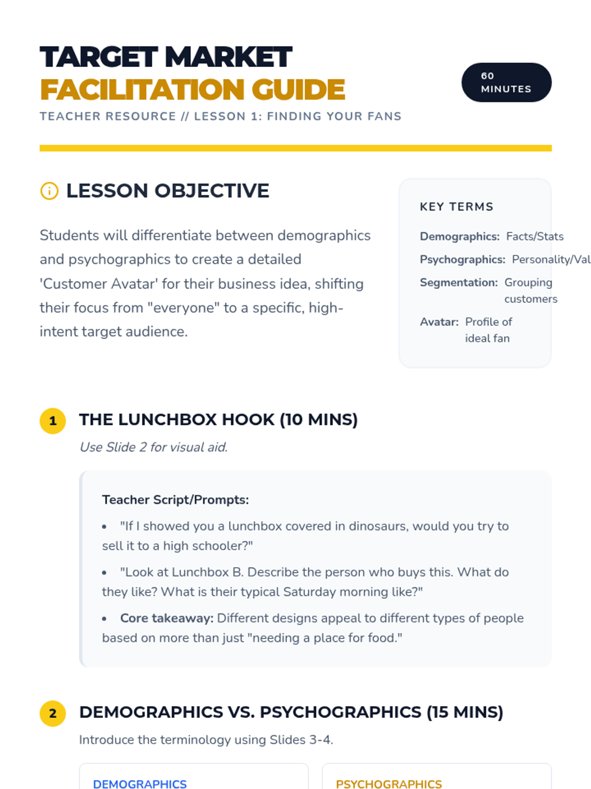 Students learn the concept of demographics and psychographics to define who their ideal customer is. They create 'Customer Avatars' to visualize specific segments of the 6th-grade population.