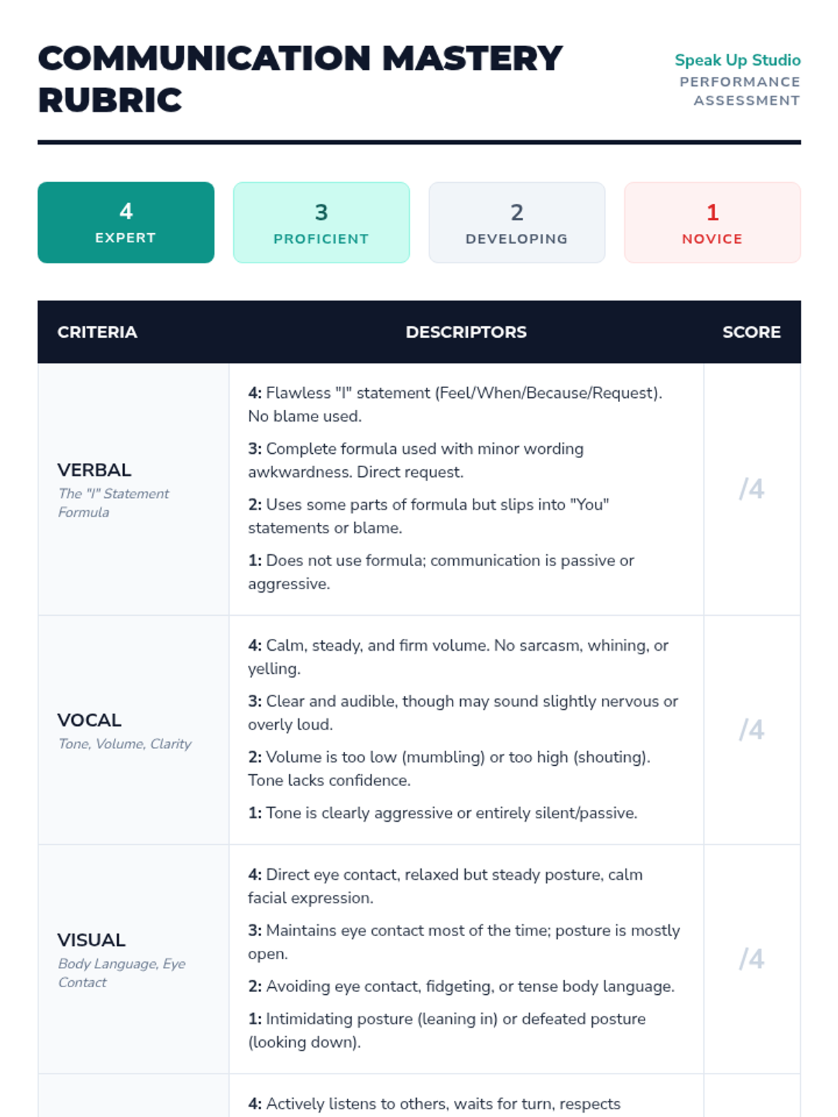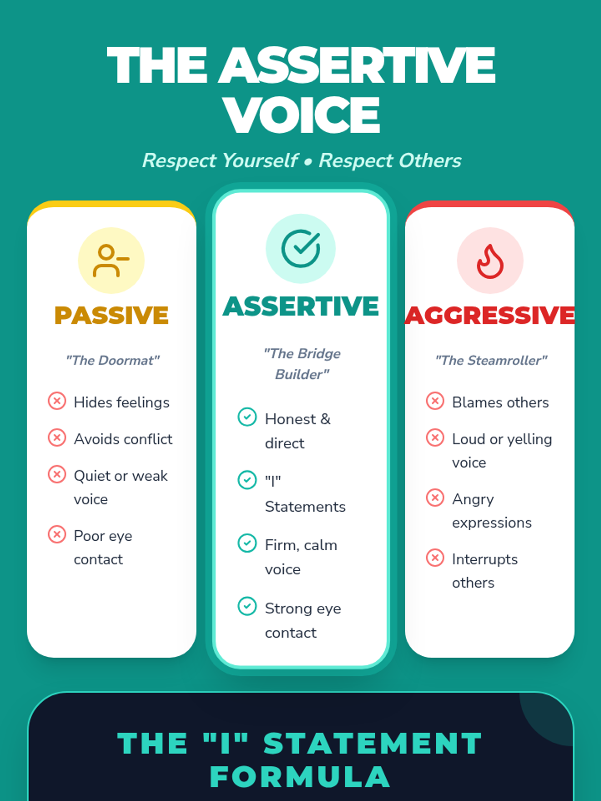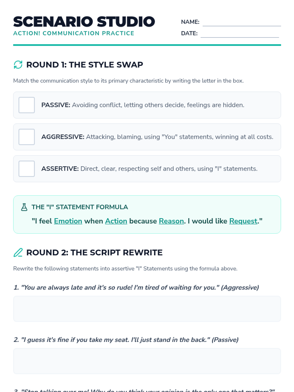 A comprehensive 90-minute lesson focused on identifying and practicing assertive communication using 'I' statements and confident body language. includes a slide deck, practice scenarios, and a visual anchor chart.