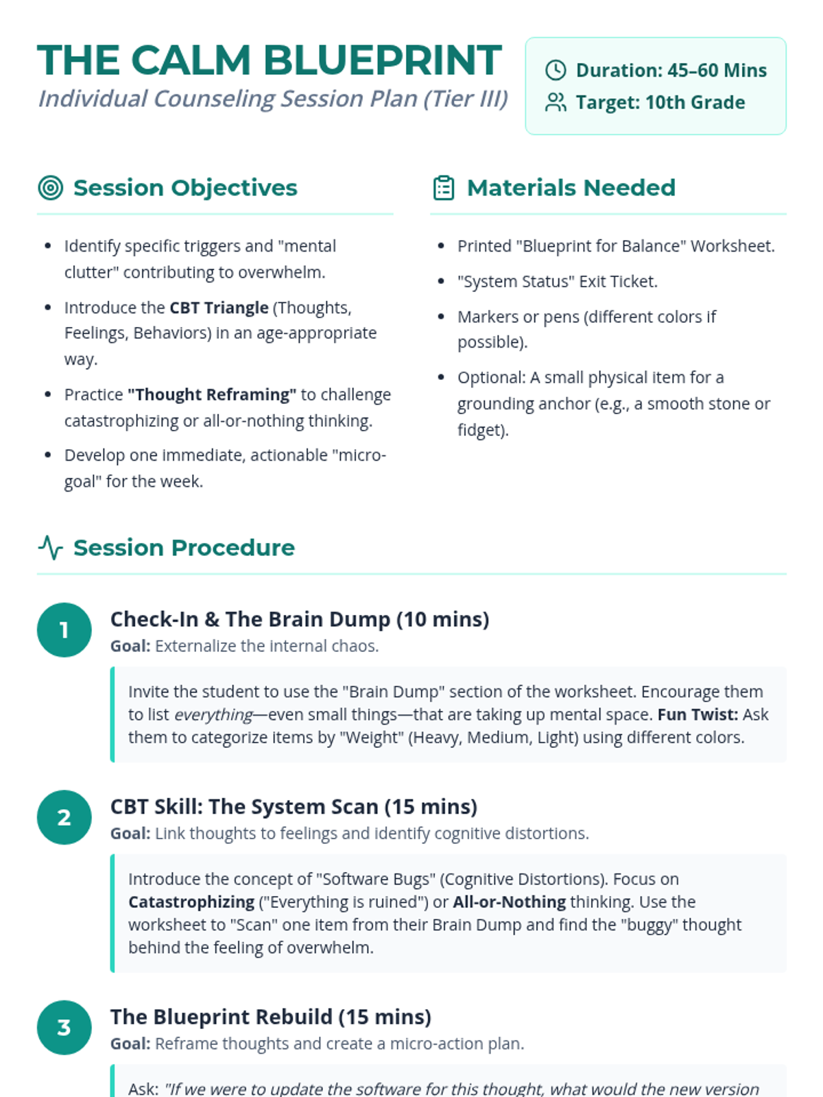 A Tier III individual counseling lesson for 10th-grade students experiencing overwhelm, focusing on CBT-based thought reframing and practical stress management strategies through a 'System Reboot' theme.