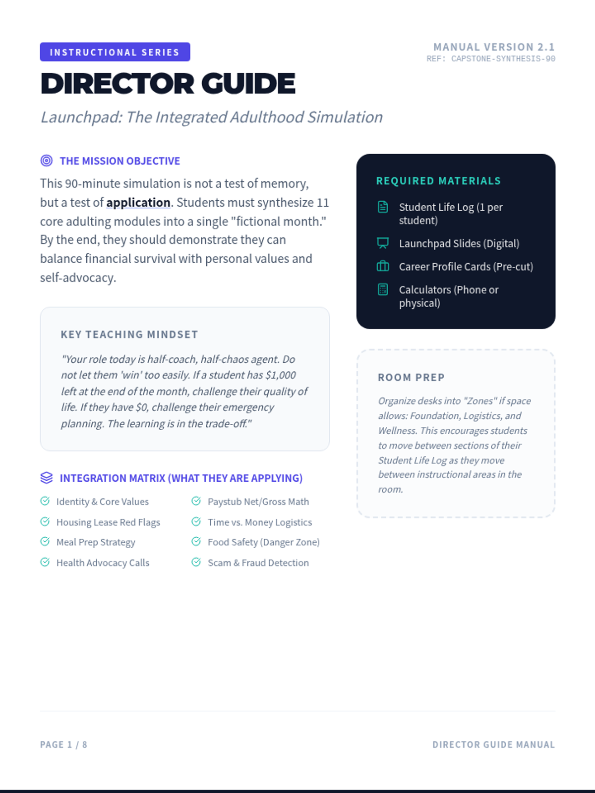 A comprehensive 90-minute capstone simulation where students apply everything they've learned about adulting to navigate a fictional month of independent living.