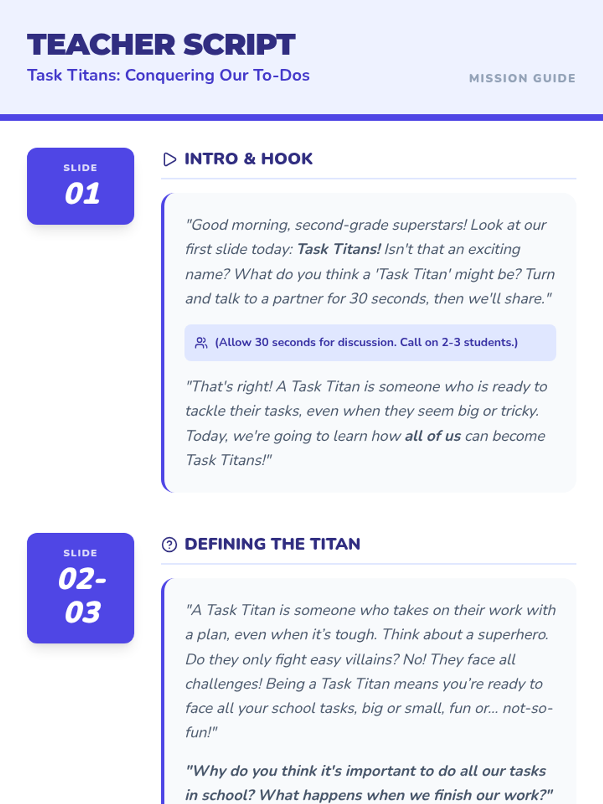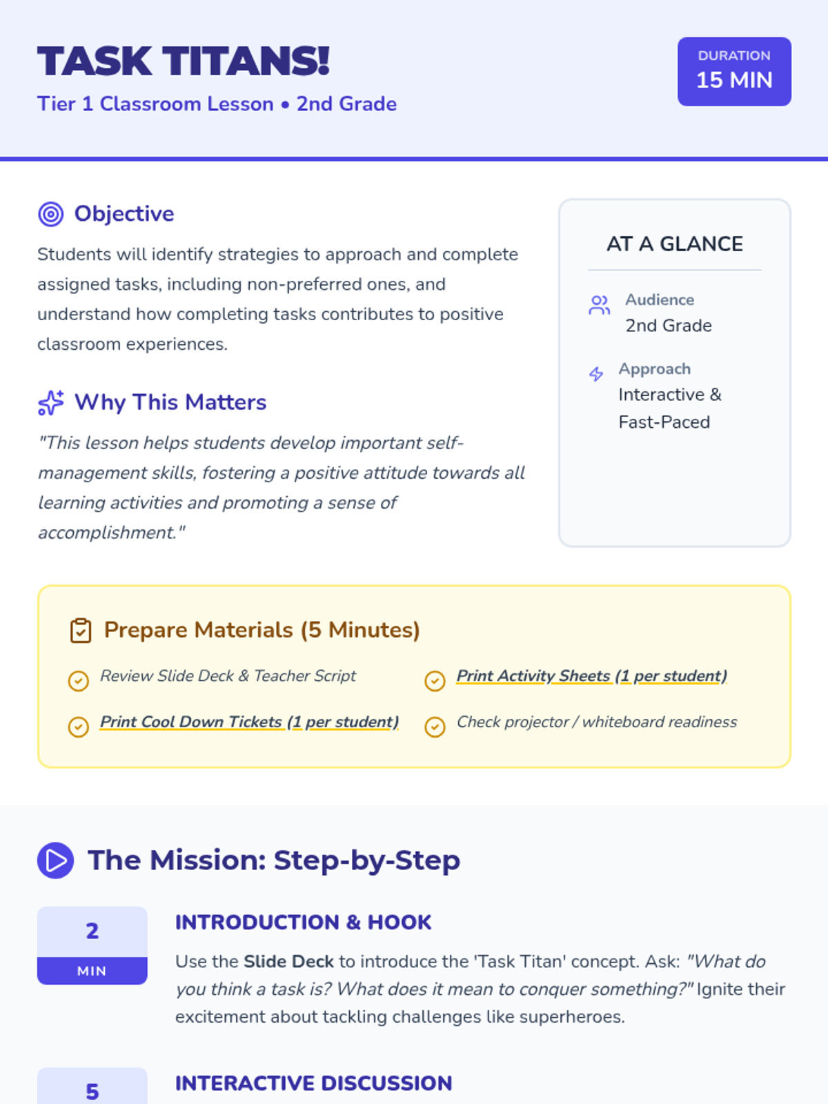 A 15-minute Tier 1 lesson for 2nd-grade students to promote task completion and positive attitudes towards all schoolwork, including non-preferred tasks, through the 'Task Titan' concept.