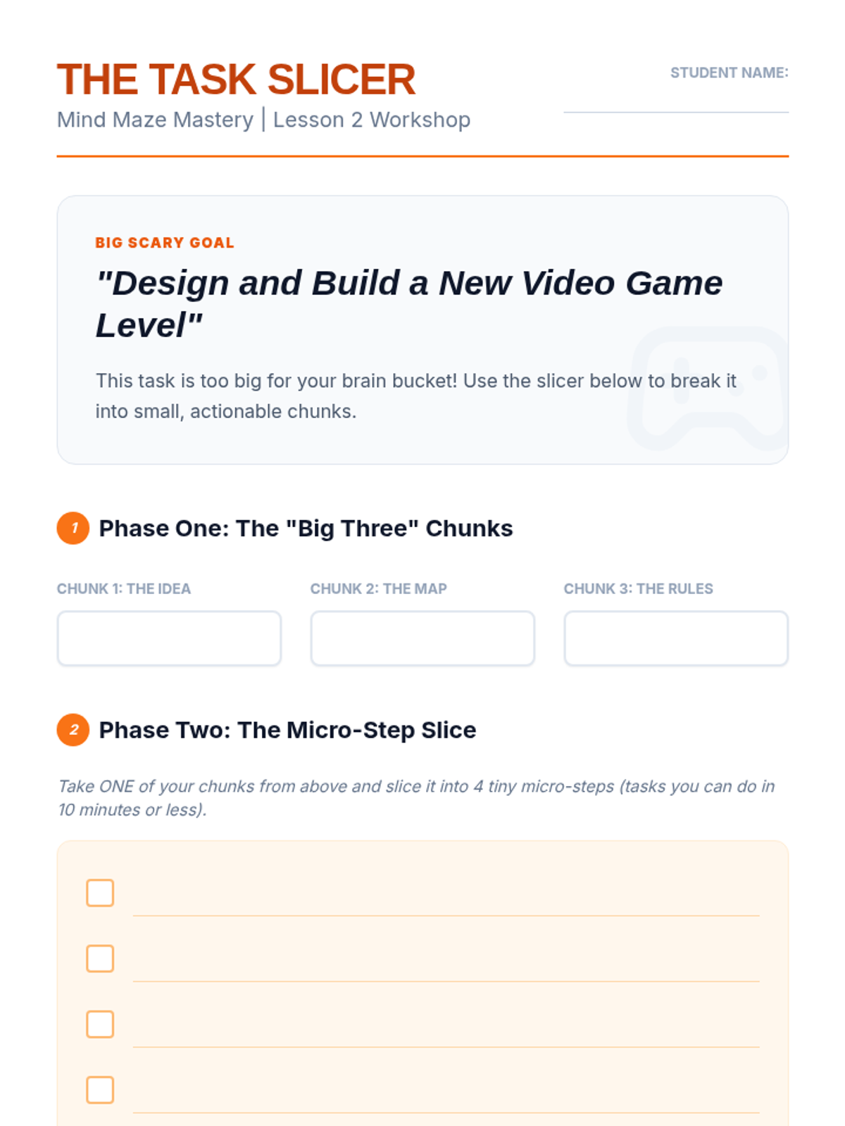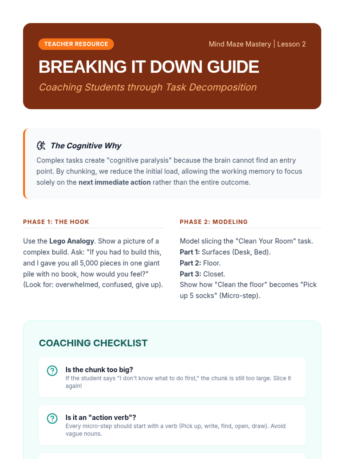 This lesson introduces 'chunking' as a primary strategy for reducing cognitive load. Students take large, overwhelming prompts and practice breaking them down into small, actionable micro-steps, creating a logical roadmap for completion.