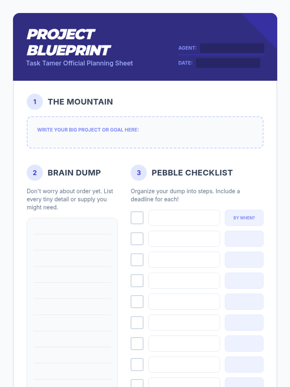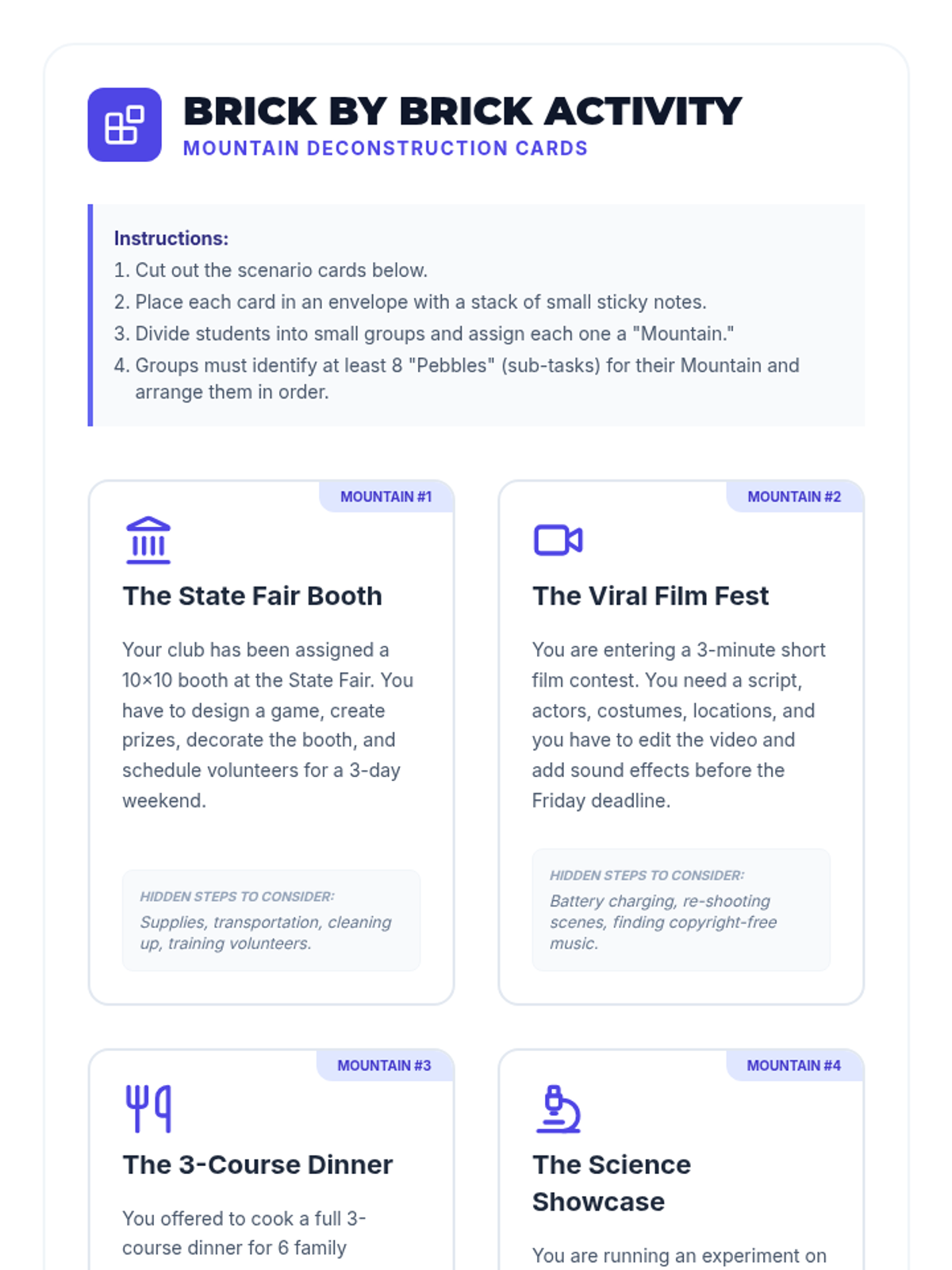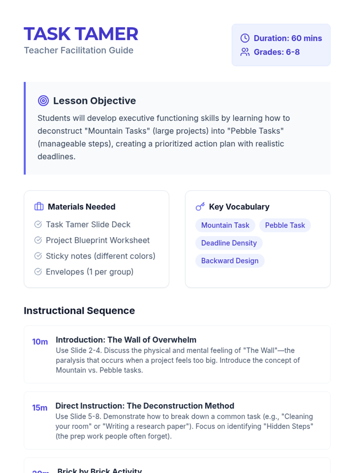 A comprehensive executive functioning lesson designed for middle schoolers to master the art of breaking large, intimidating projects into small, actionable steps. Students will learn the 'Task Taming' framework through guided planning, collaborative activities, and visual tracking tools.